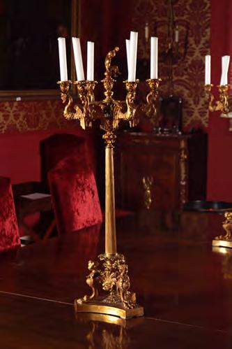 each of 5 lights supported on a figural stem and palmette decorated cylindrical marble column, mounted on a gilded square base. 69 cm. high
