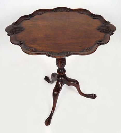 circa 1760, the circular serpentine shaped top, below a baluster brass inlaid gallery rail, raised on a turned stem and scroll legged pod, terminating on slippered feet and brass castors. 73 cm. high; 52 cm. diameter