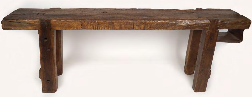 with a moulded and railed body supporting hide upholstered ends. 53 cm. high; 195 cm. wide; 55 cm. deep