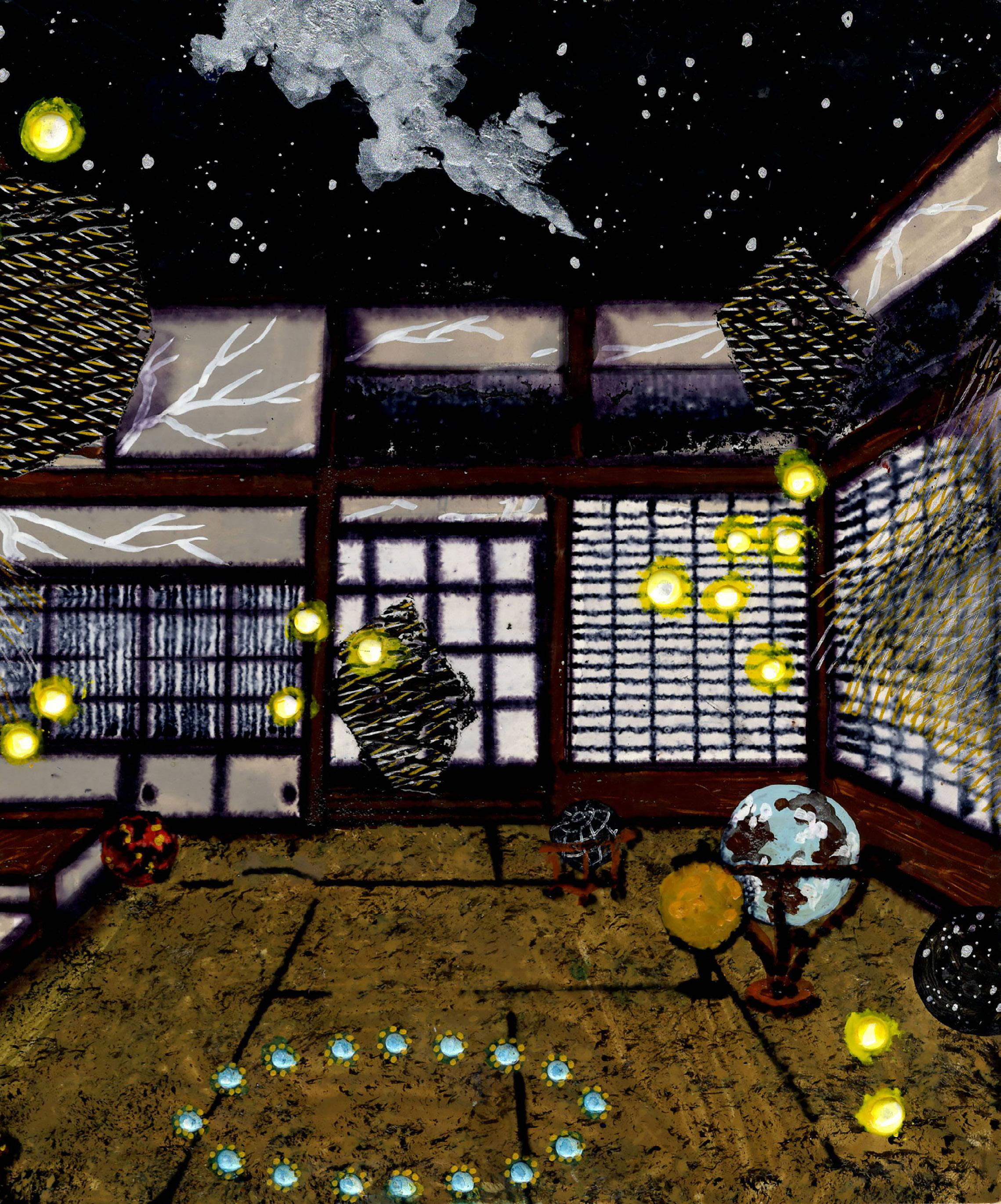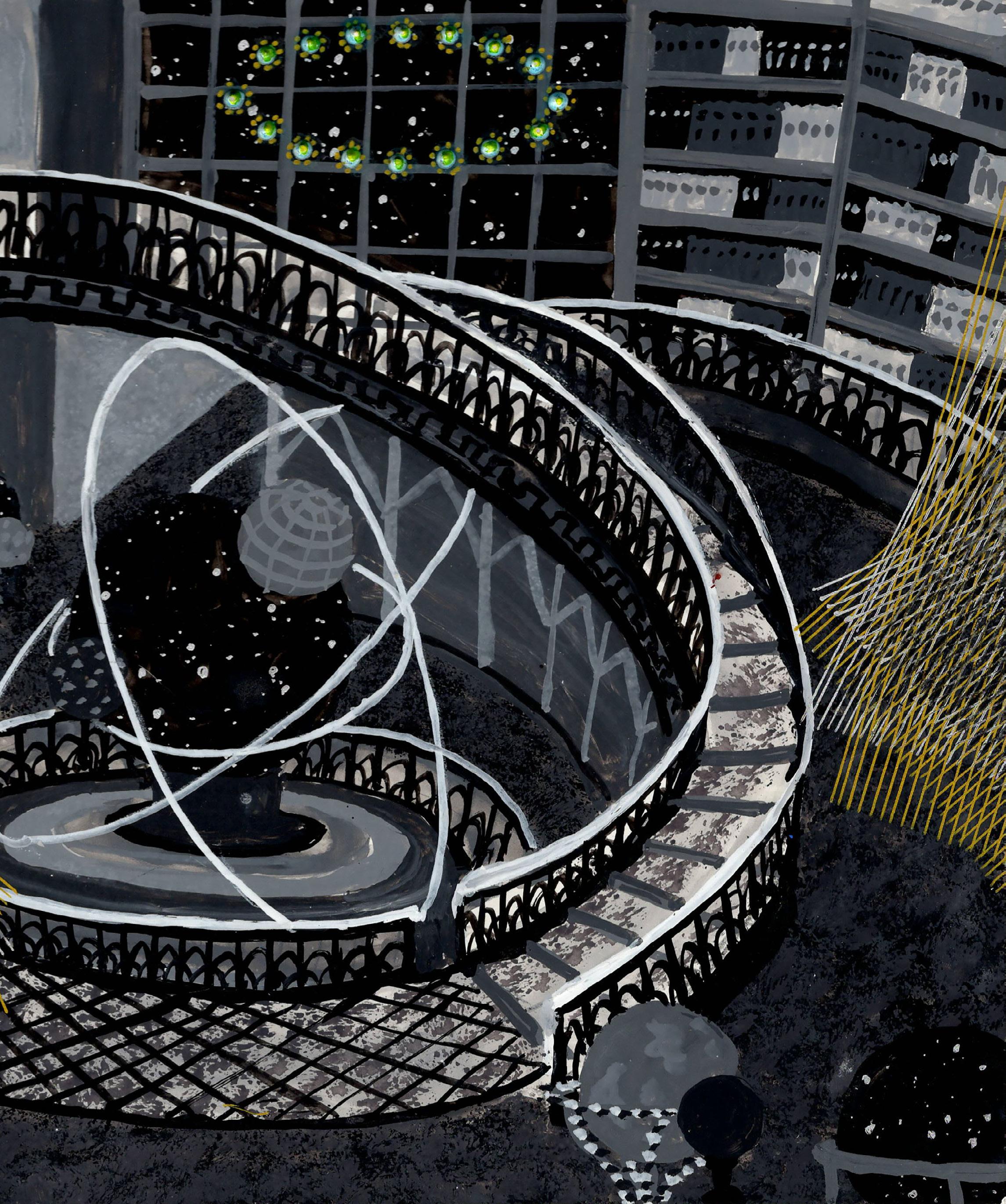 Michiko Itatani has long described her paintings as a form of fiction. Her depictions of constructed, symbolic spaces in which multiple systems of knowledge collide and cohere are part observatory, part archive, and part stage for cosmic operas to play out. Objects seem to oscillate between scientific instrument and metaphysical sign. Globes, diagrams, vessels, and architectural fragments appear not as fixed symbols but as elements within an unfolding narrative, inviting the viewer to read rather than simply look. Itatani is “using the painting language to write [her] fiction… inviting the viewer to participate and complete my painting.”