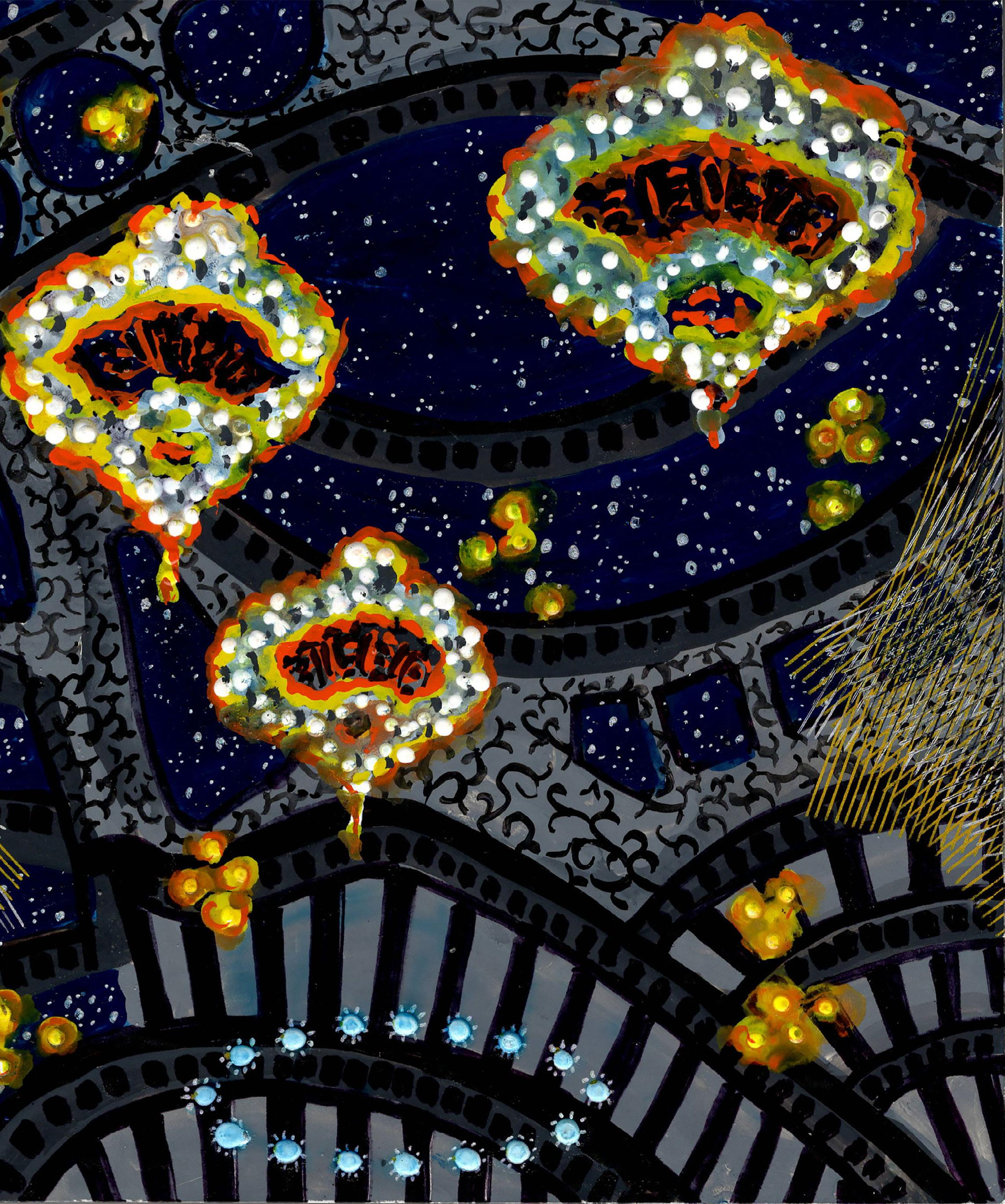 ”Waiting Game” from Cosmic Theater 25-K-50 Gouache, ink, and colored pencil on board