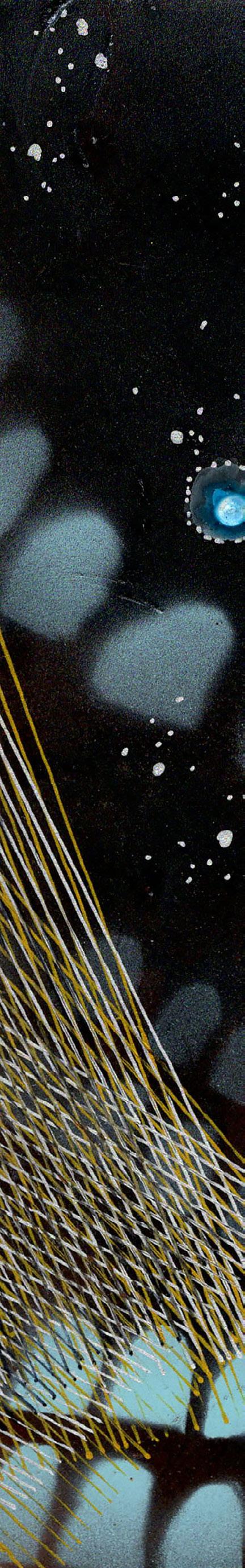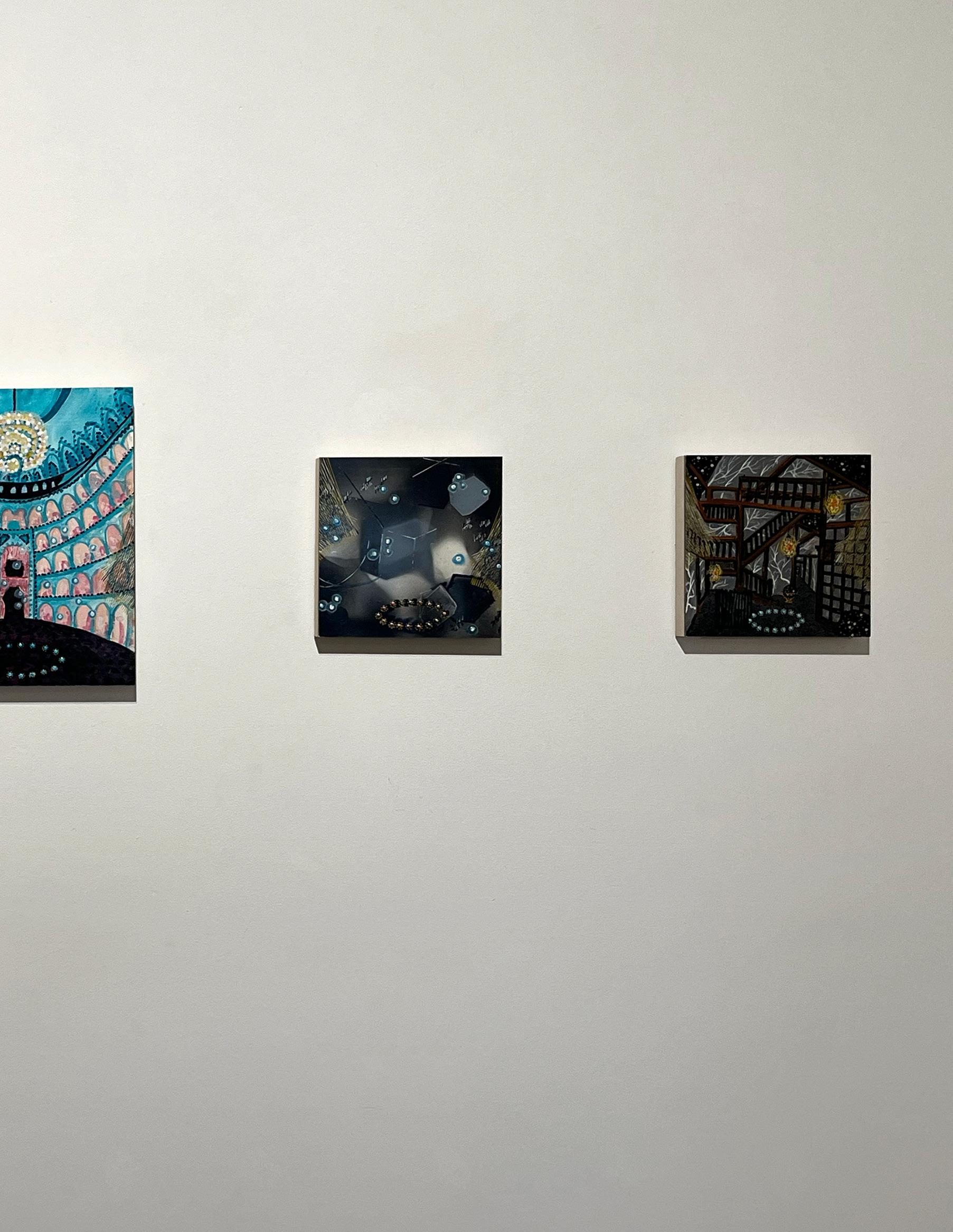 What distinguishes this presentation is scale. Known for expansive, immersive canvases, Itatani here compresses her visual language into intimate formats without diminishing its conceptual reach. Instead, the shift in scale recalibrates the encounter. The viewer is drawn closer, into a mode of looking that mirrors the act of deciphering: of leaning in and holding a fragment up to scrutiny. In these smaller works, the “cosmic” does not recede but becomes concentrated, as if the same vast systems have been folded inward, encoded more densely. The result is a paradox: paintings that feel at once contained and expansive. The intimacy of scale sharpens, rather than limits, the sense of boundless inquiry.