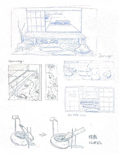 A meditative entry space for the tea house, designed with raked gravel and minimal elements to evoke tranquility and cultural immersion.