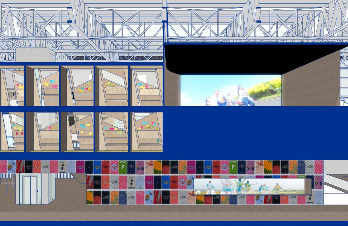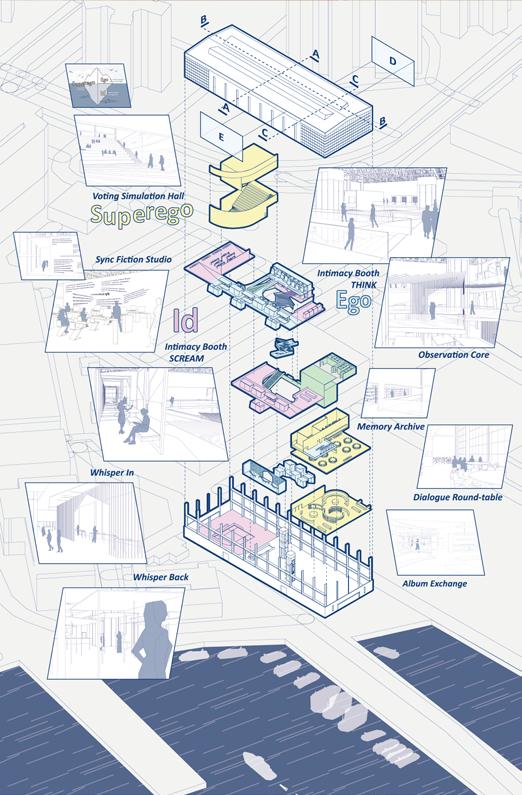 Inspired by Freud’s Id, Ego, and Superego, the project unfolds as three sequential zones that guide visitors from emotional immersion to self-reflection and critical awareness. Each zone is defined by technologically mediated environments: the Id Space immerses visitors through projection walls, AI idol interactions, and a sound-insulated Scream Room; the Ego Space introduces VR reversals, testimonial recording, and data visualization to prompt introspection; and the Superego Space opens into interactive ethical simulations and digital archives of fan activism that encourage dialogue. As illustrated in the exploded diagram and floor plan, technology operates as the connective tissue that choreographs this psychological journey.