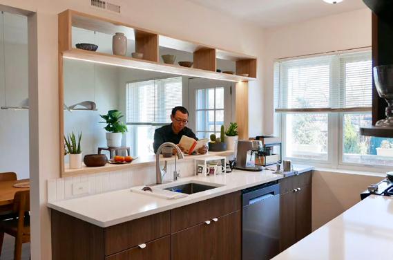 To achieve the client’s goal of potentially separating this level from the main house, an electrical kitchen and sink were added along the corridor, maximizing functionality within a limited footprint.