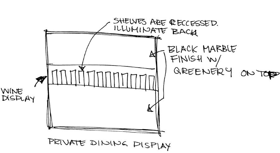 BAR BACK WINE DISPLAY WITH GOLD MARBLE FINISHES.