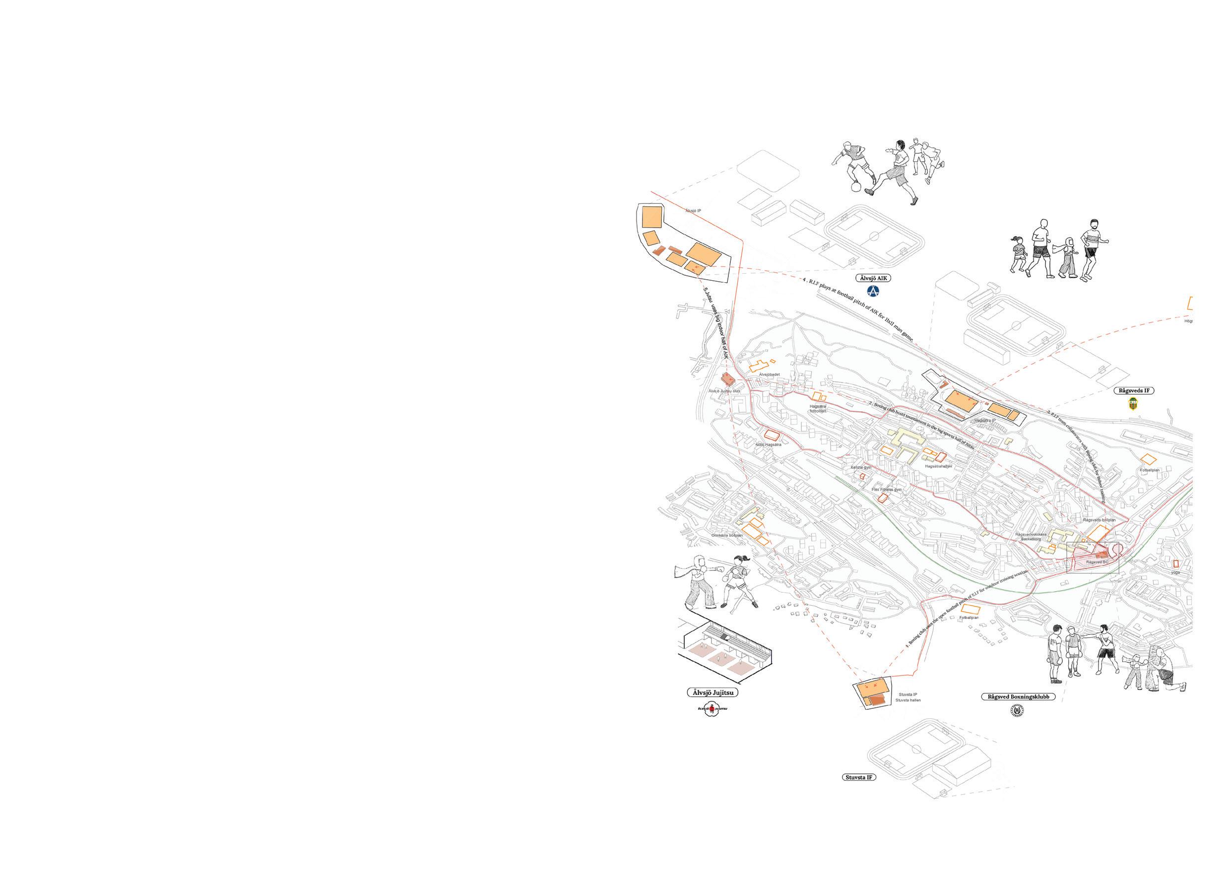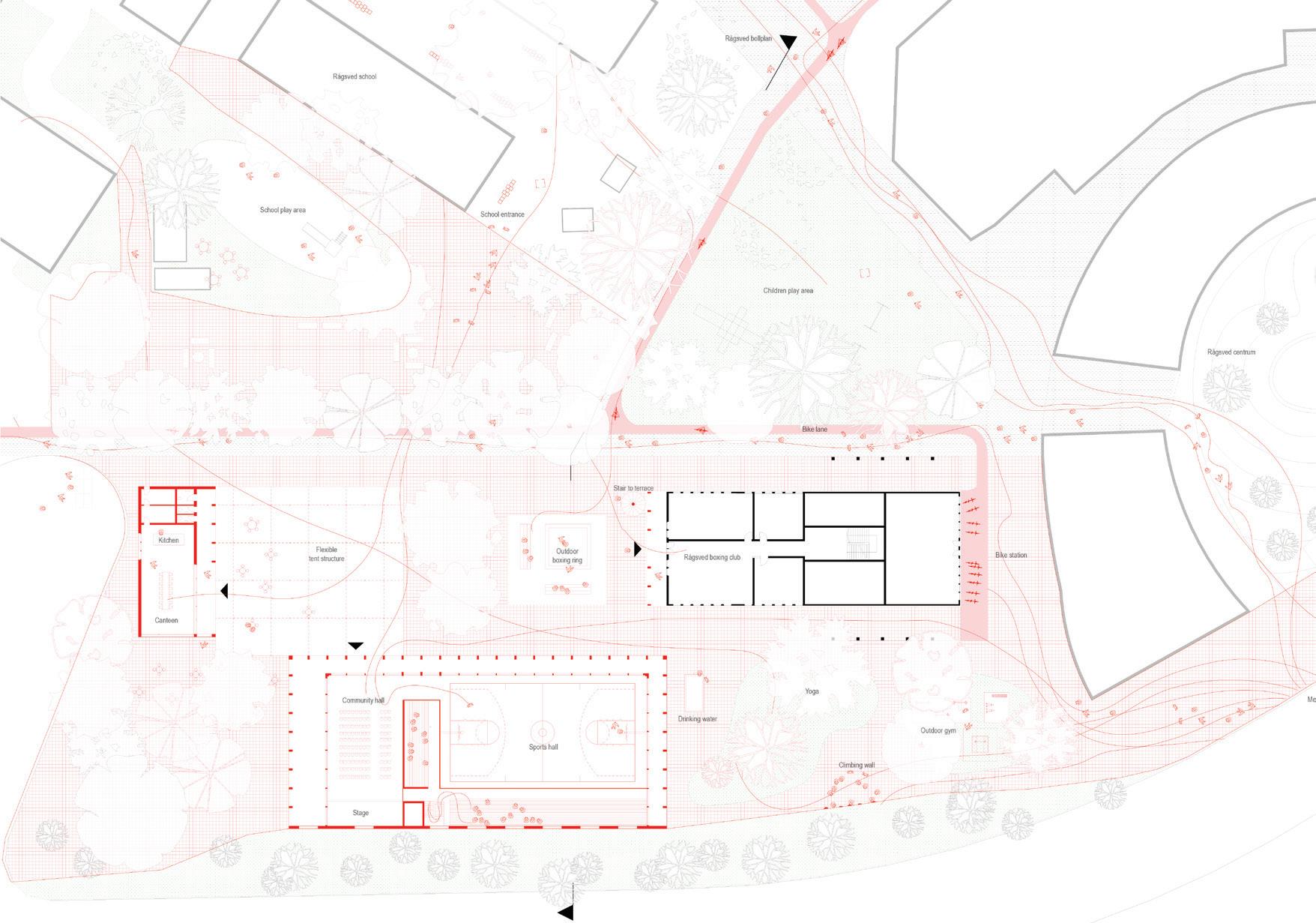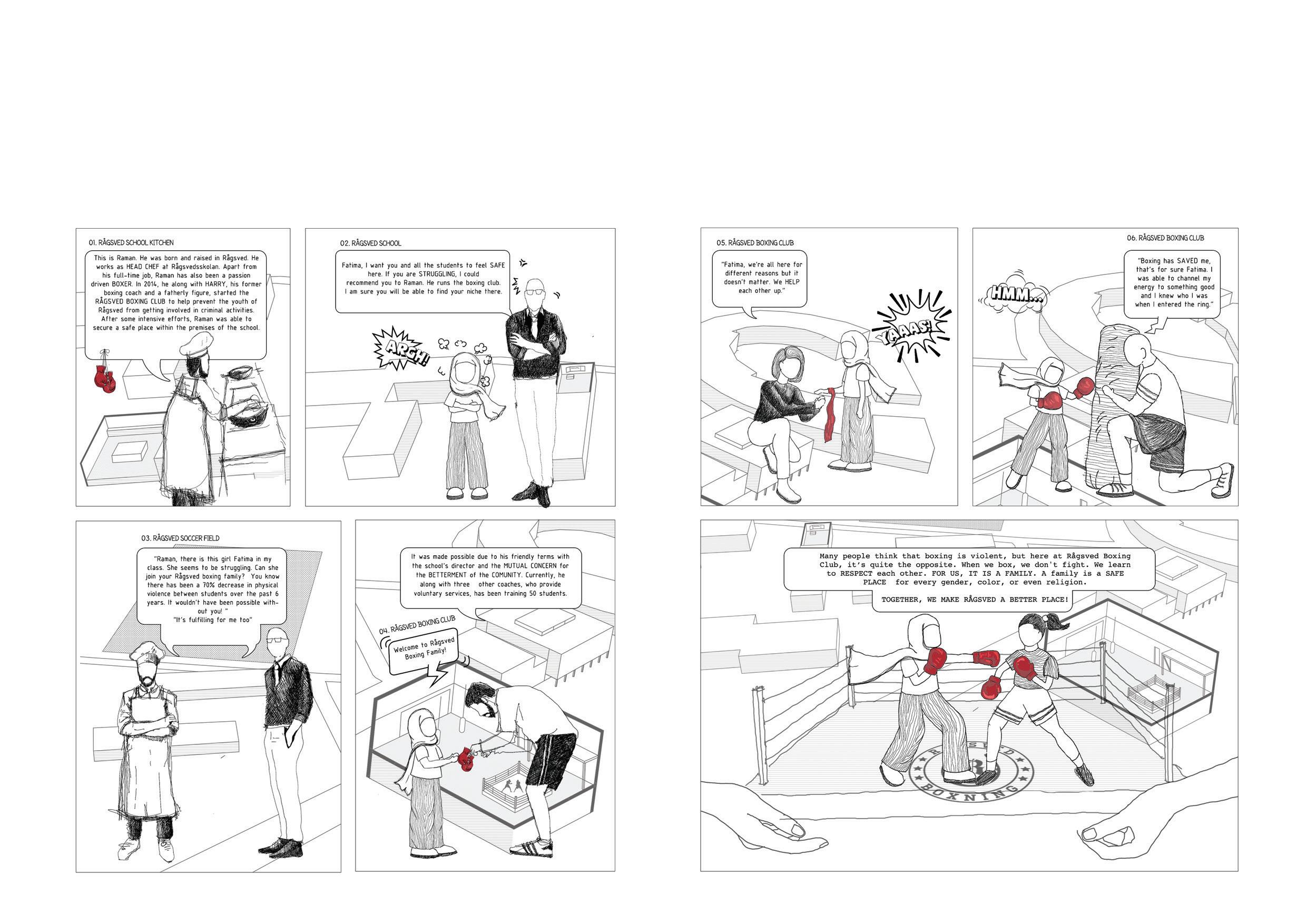 Our proposal enhances this supportive network across Rågsved and Hagsätra in three phases. Phases one and two strengthen local links through a situated organization and an expanded cycle track. A “time bank” facilitates sharing facilities and resources across clubs, boosting collaboration. In phase three, we envision a “care platform” with an indoor sports facility, community café, outdoor gym, and multi-use sports area. The aim is to expand the care found within Rågsved Boxing Club into a network promoting inclusivity and belonging for the entire community.