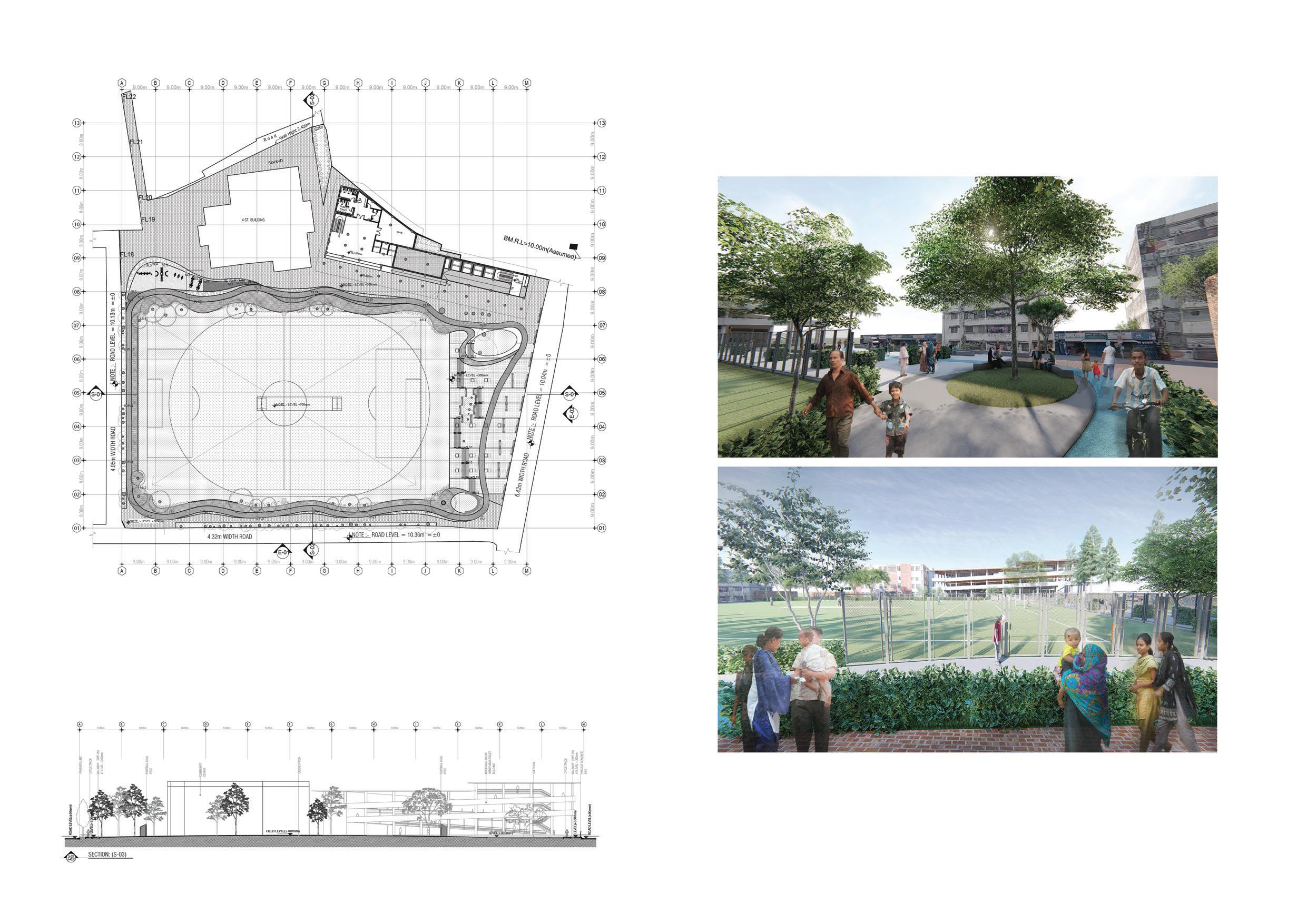 As the project architect, I was involved with the development of this project from conceptual sketches to construction drawings. Currently under construction, the project addresses the critical shortage of public spaces and playgrounds in the bustling capital city of Dhaka. Initiated by the Dhaka City Corporation, the goal was to create a multifunctional public space that meets the diverse needs of the local community.