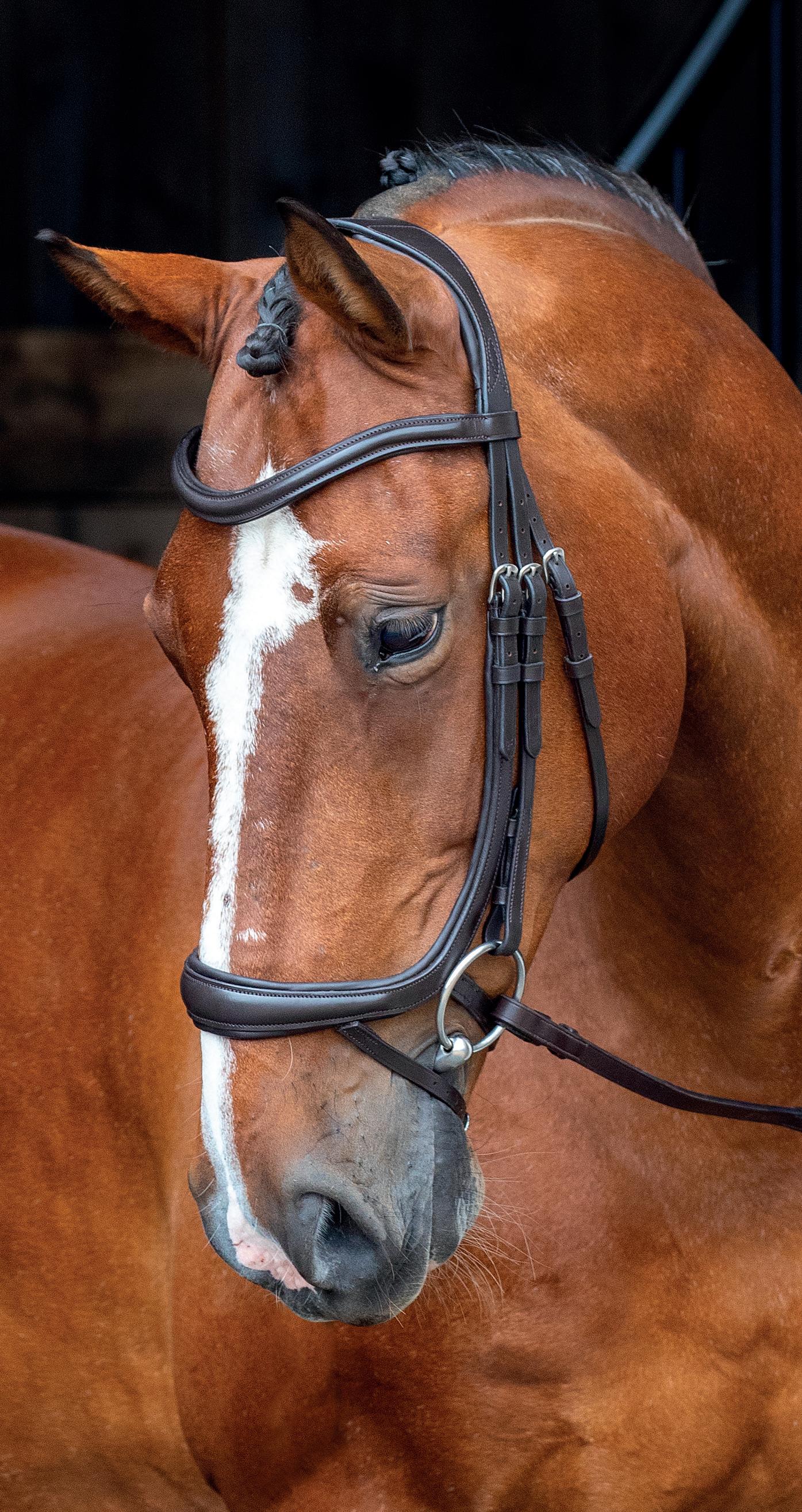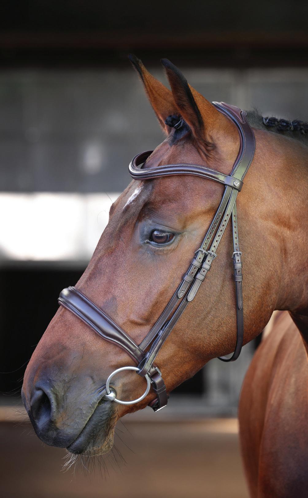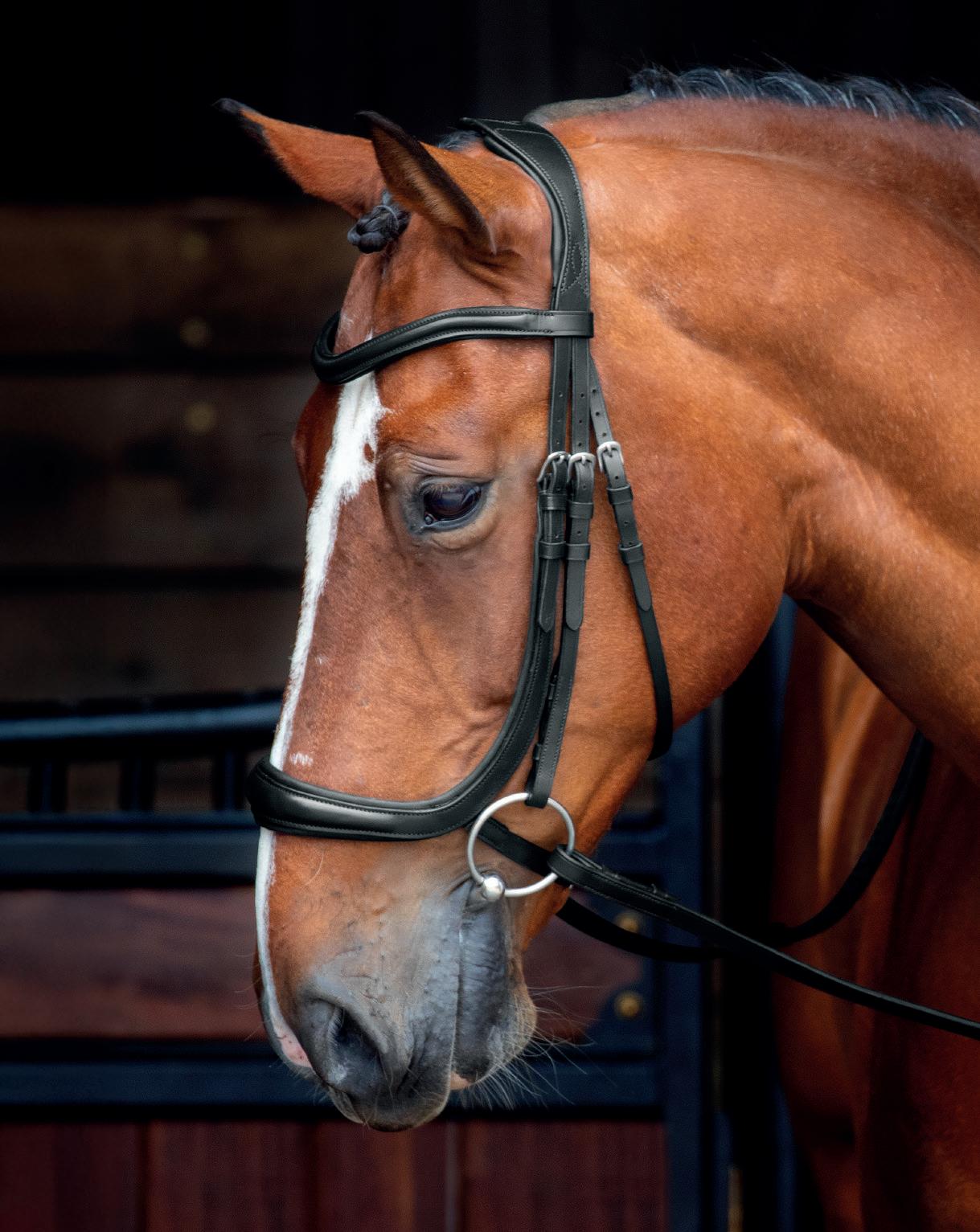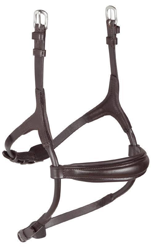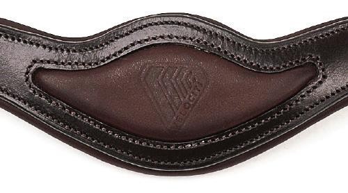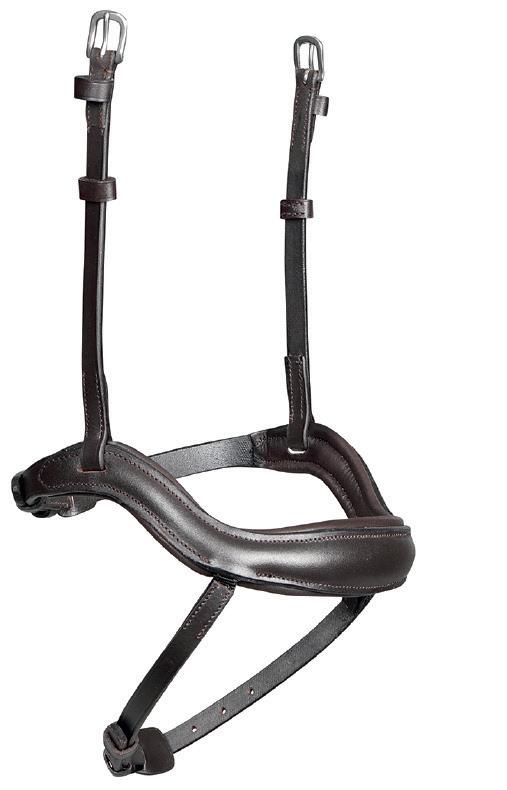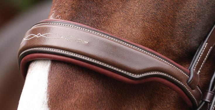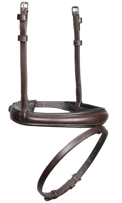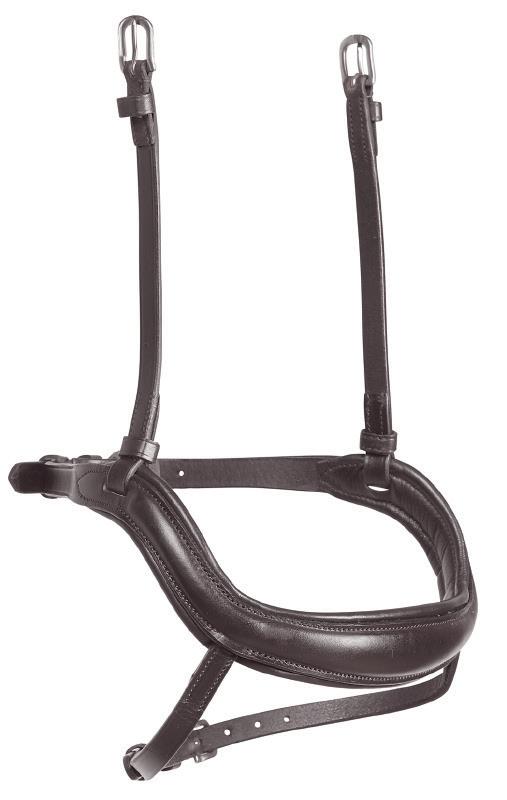 A deep noseband, cut back at the sides to relieve pressure in sensitive areas. A rear crank adjustment fastens with a roller buckle and a cushioned pad guards against pinching. The contoured pressure relieving deep raised browband and the sleek, angled throatlash create an elegant profile.