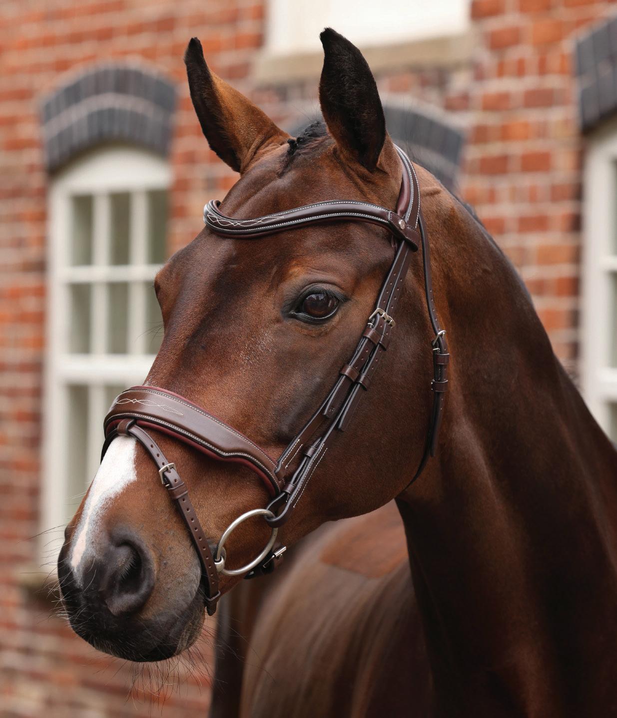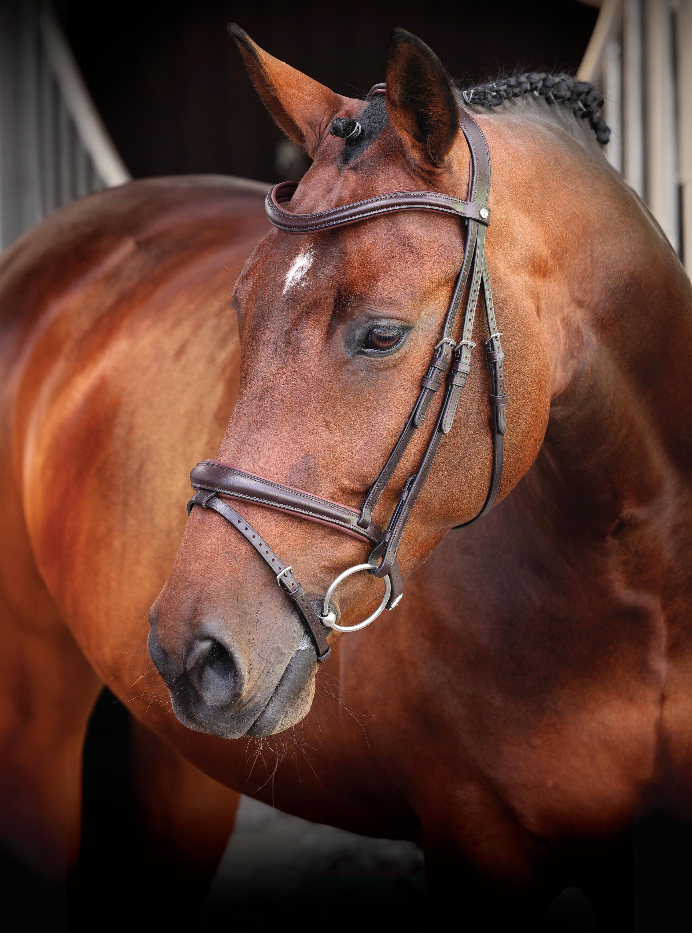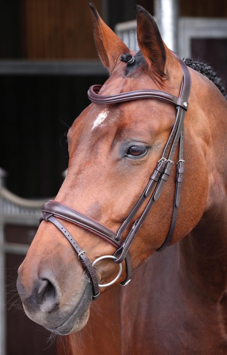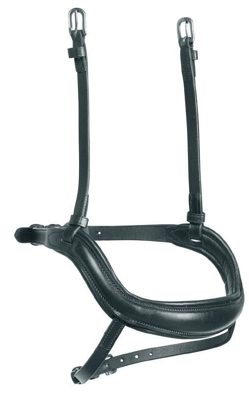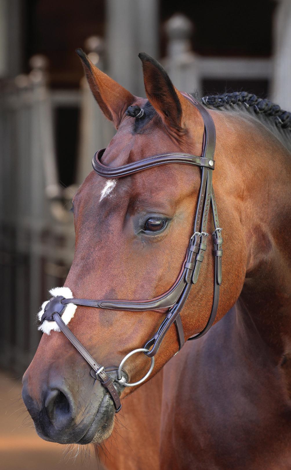 A deep noseband, cut back at the sides to relieve pressure in sensitive areas. A rear crank adjustment fastens with a roller buckle and a cushioned pad guards against pinching. The contoured pressure relieving deep raised browband and the sleek, angled throatlash create an elegant profile.