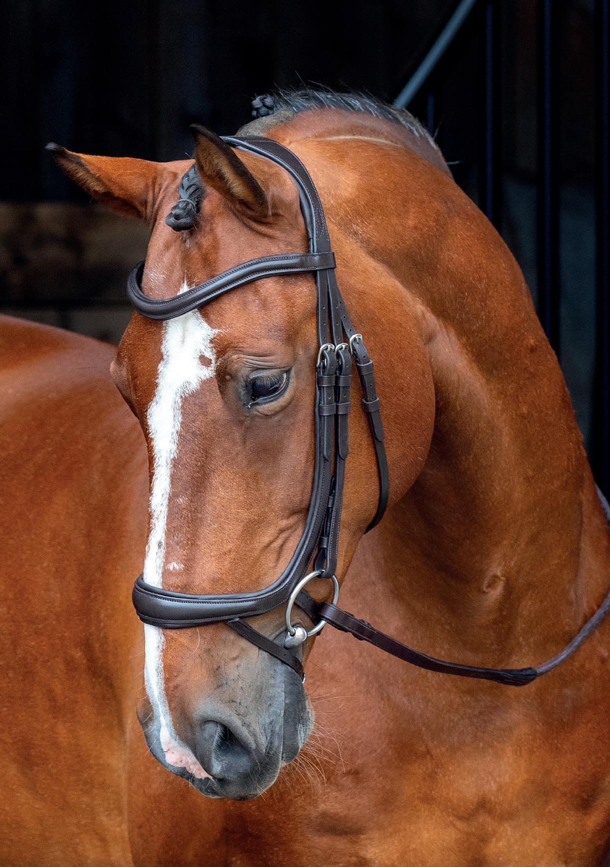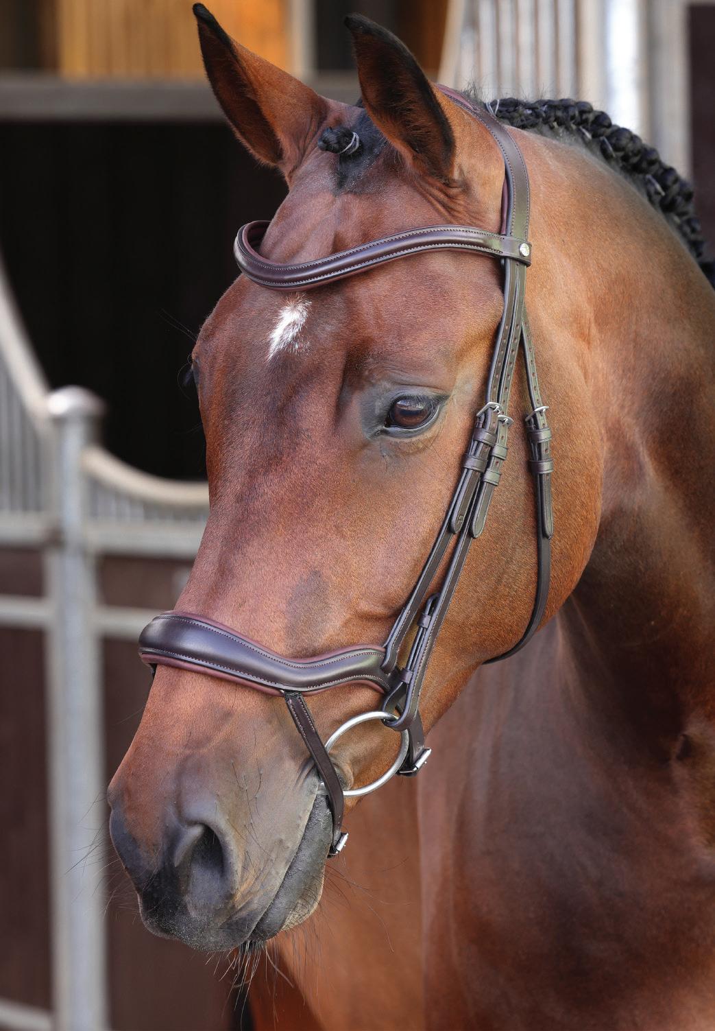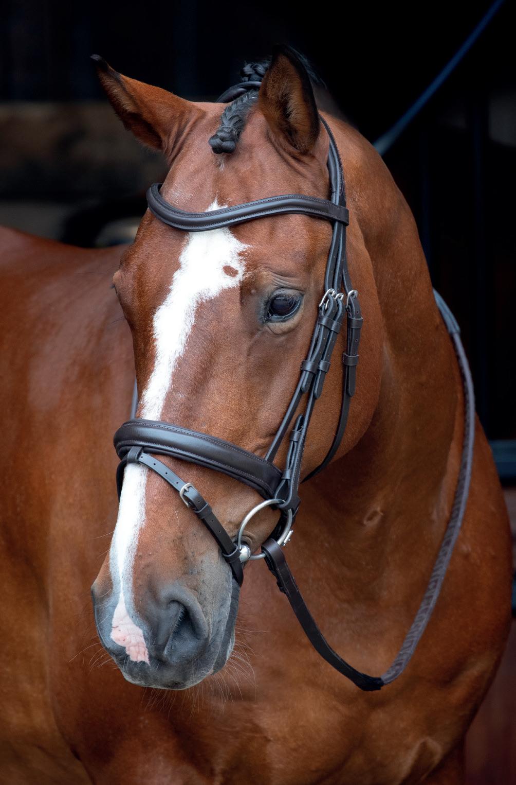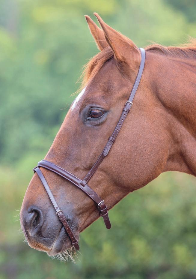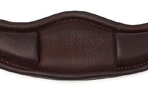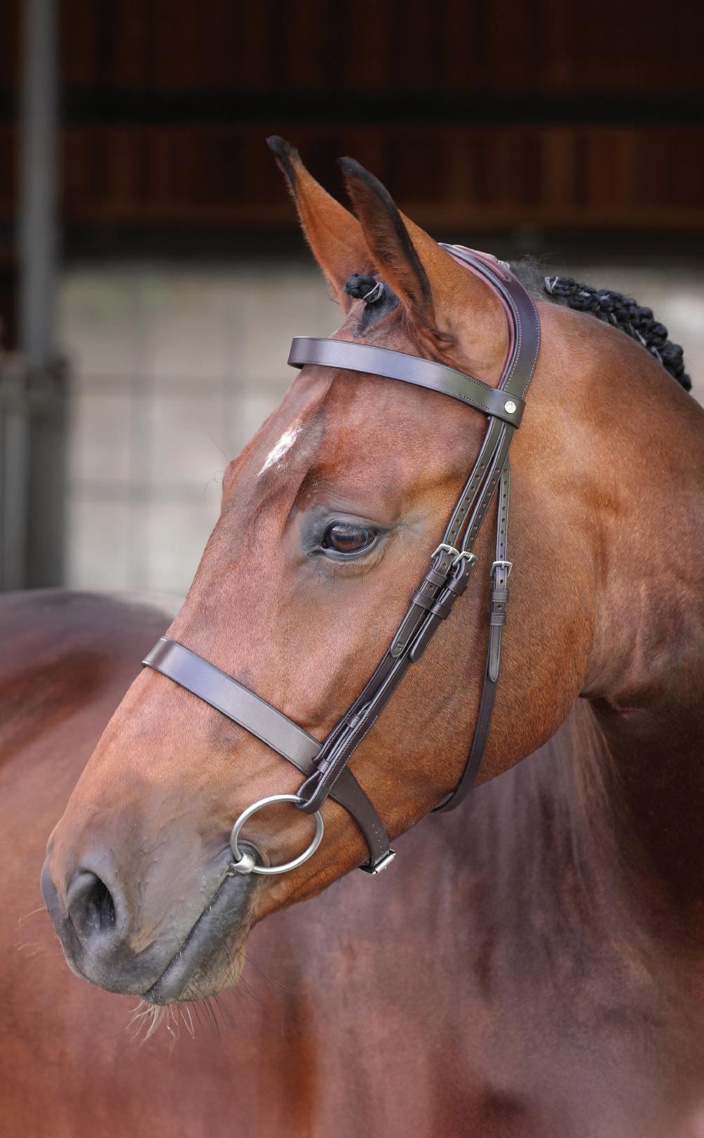 A deep noseband, cut back at the sides to relieve pressure in sensitive areas. A rear crank adjustment fastens with a roller buckle and a cushioned pad guards against pinching. The contoured pressure relieving deep raised browband and the sleek, angled throatlash create an elegant profile.