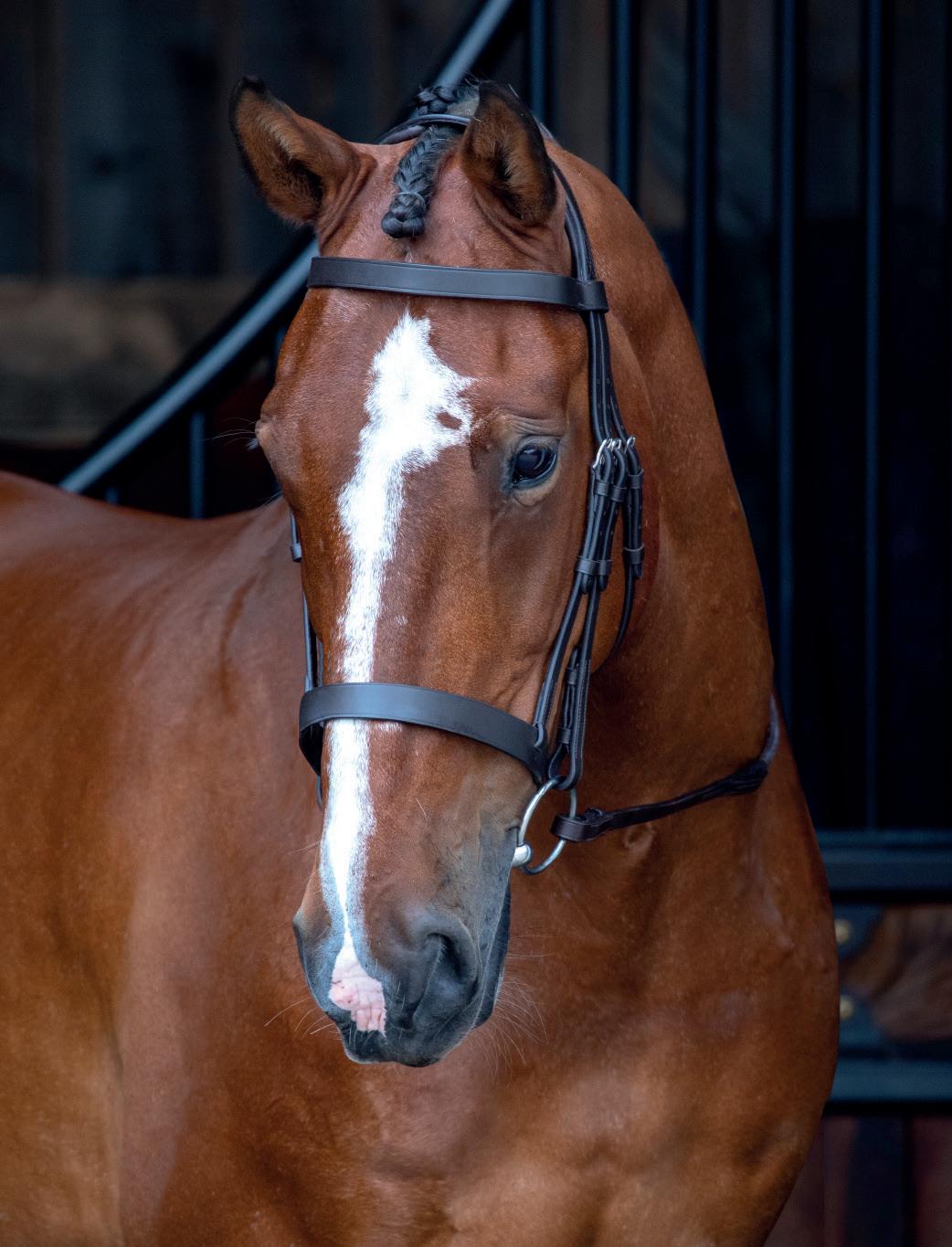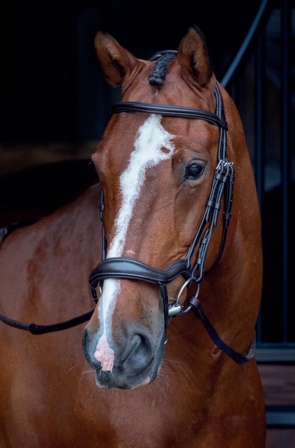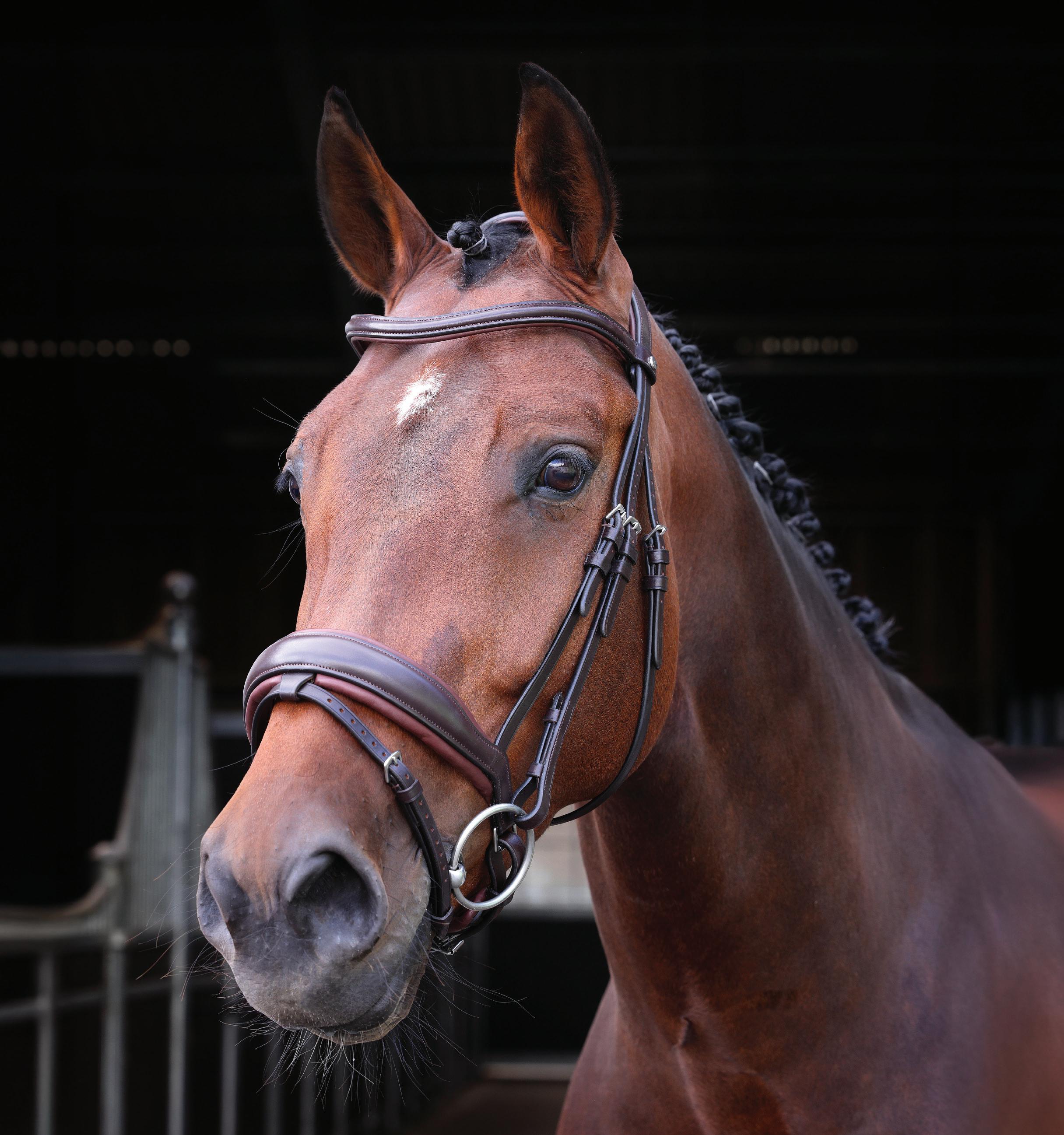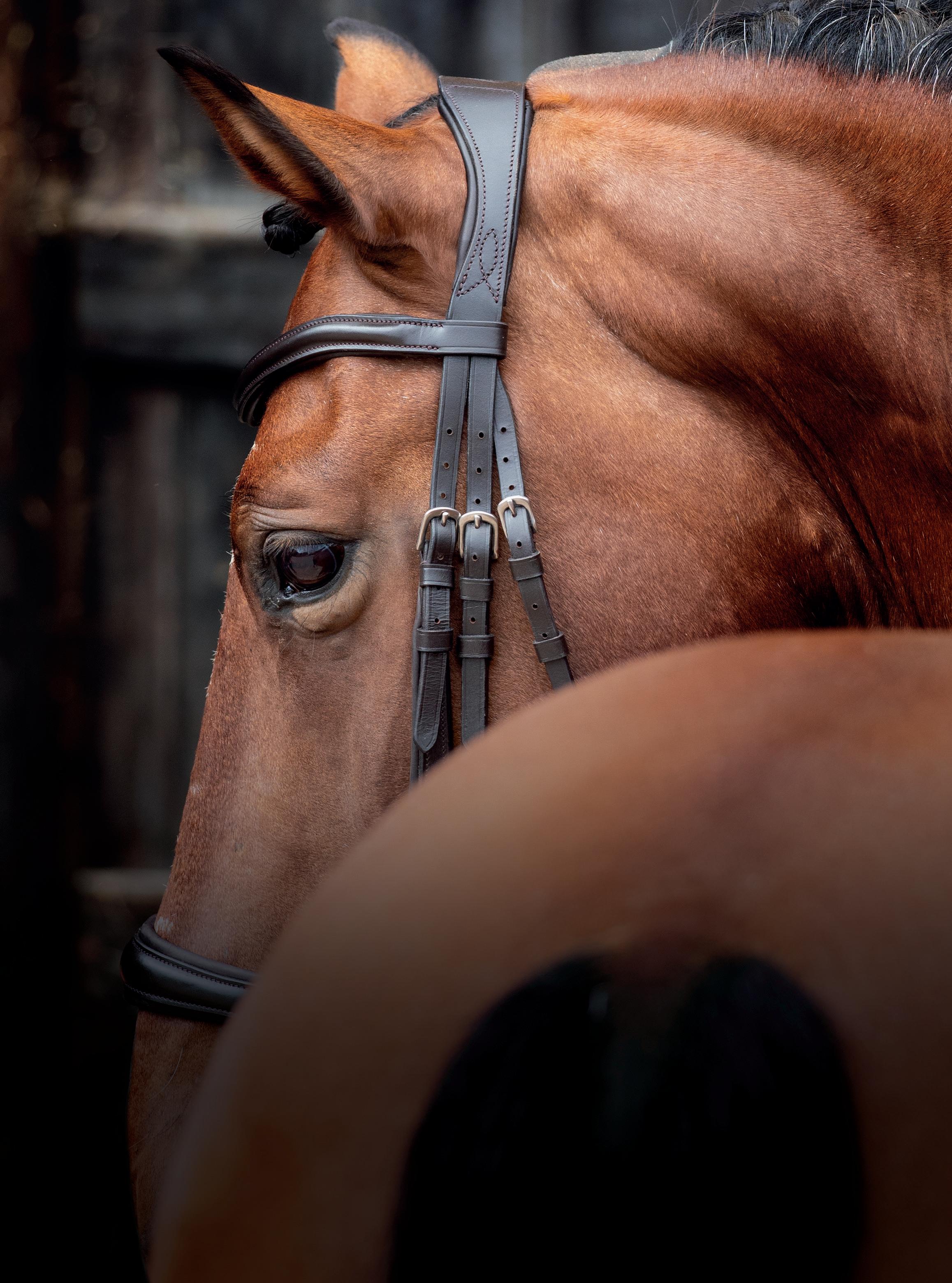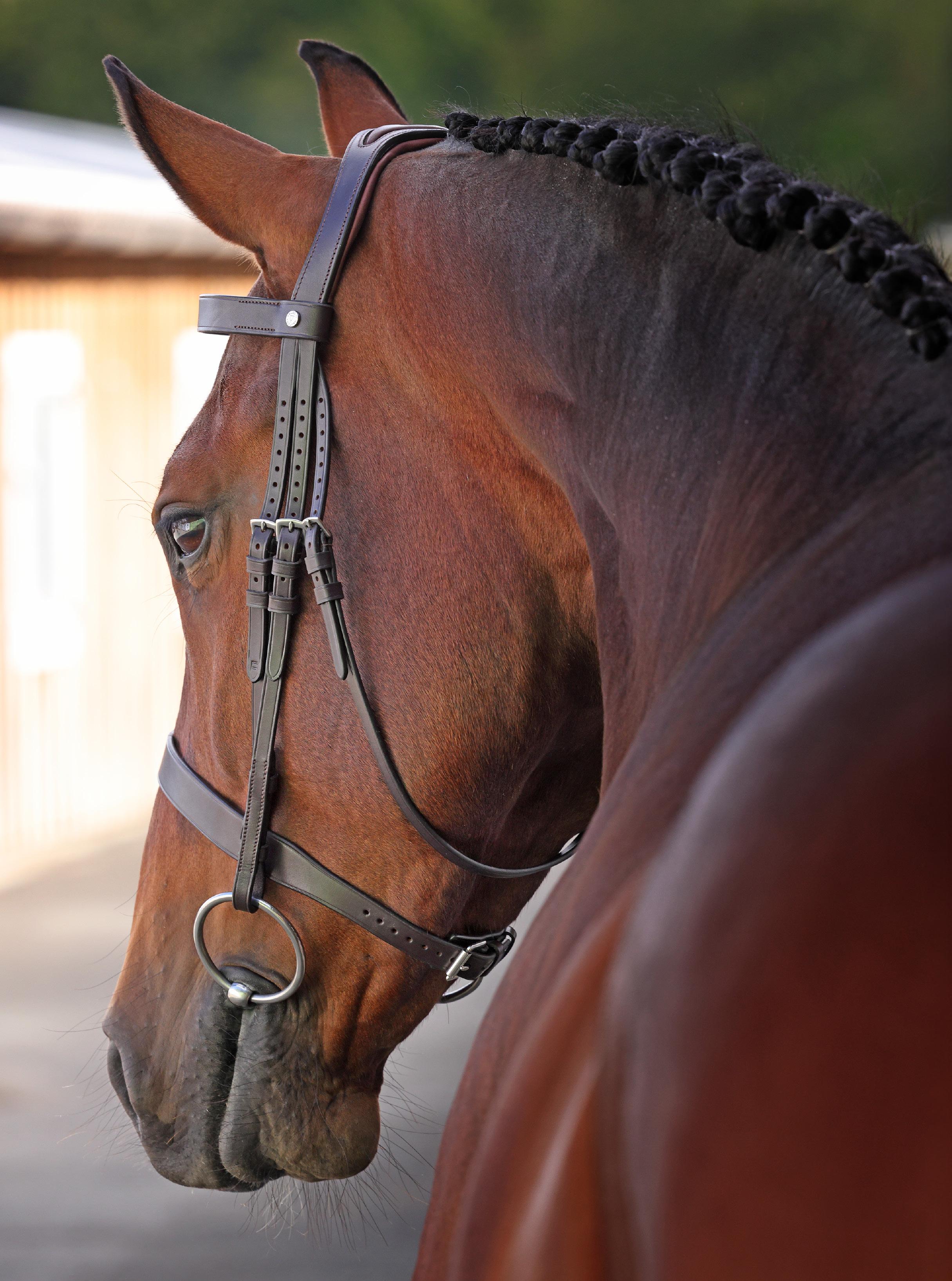 A deep noseband, cut back at the sides to relieve pressure in sensitive areas. A rear crank adjustment fastens with a roller buckle and a cushioned pad guards against pinching. The contoured pressure relieving deep raised browband and the sleek, angled throatlash create an elegant profile.