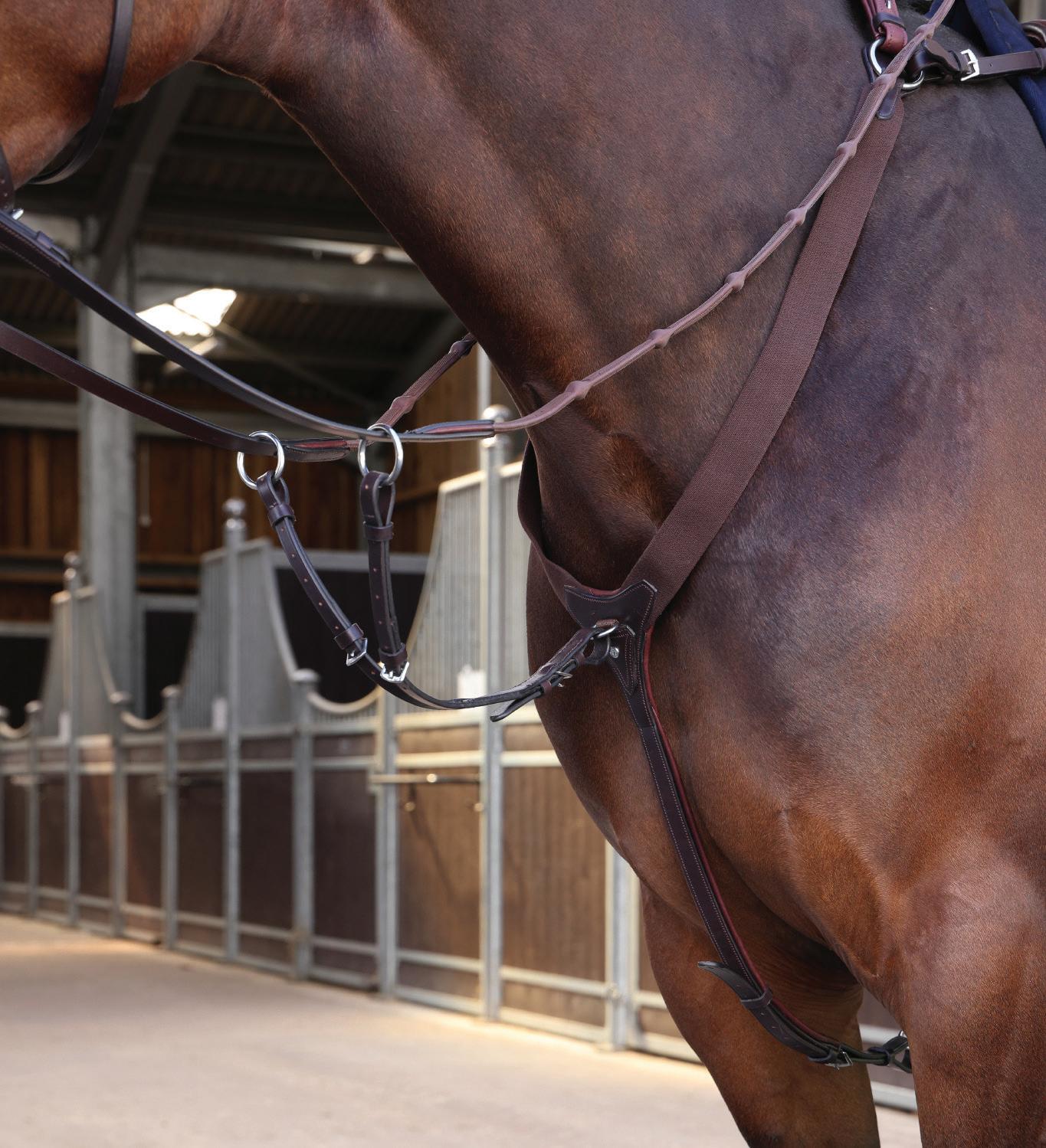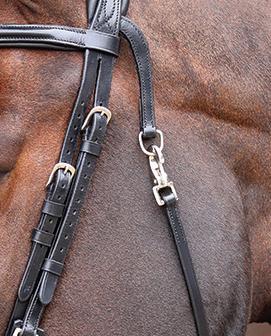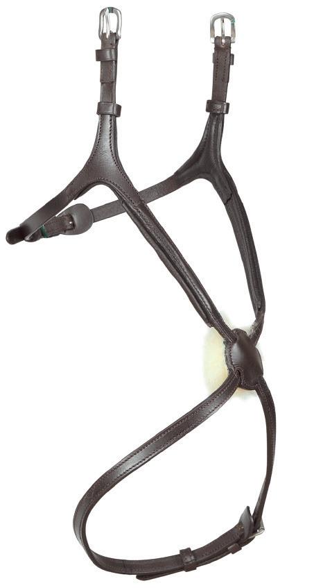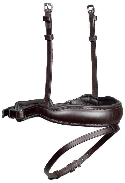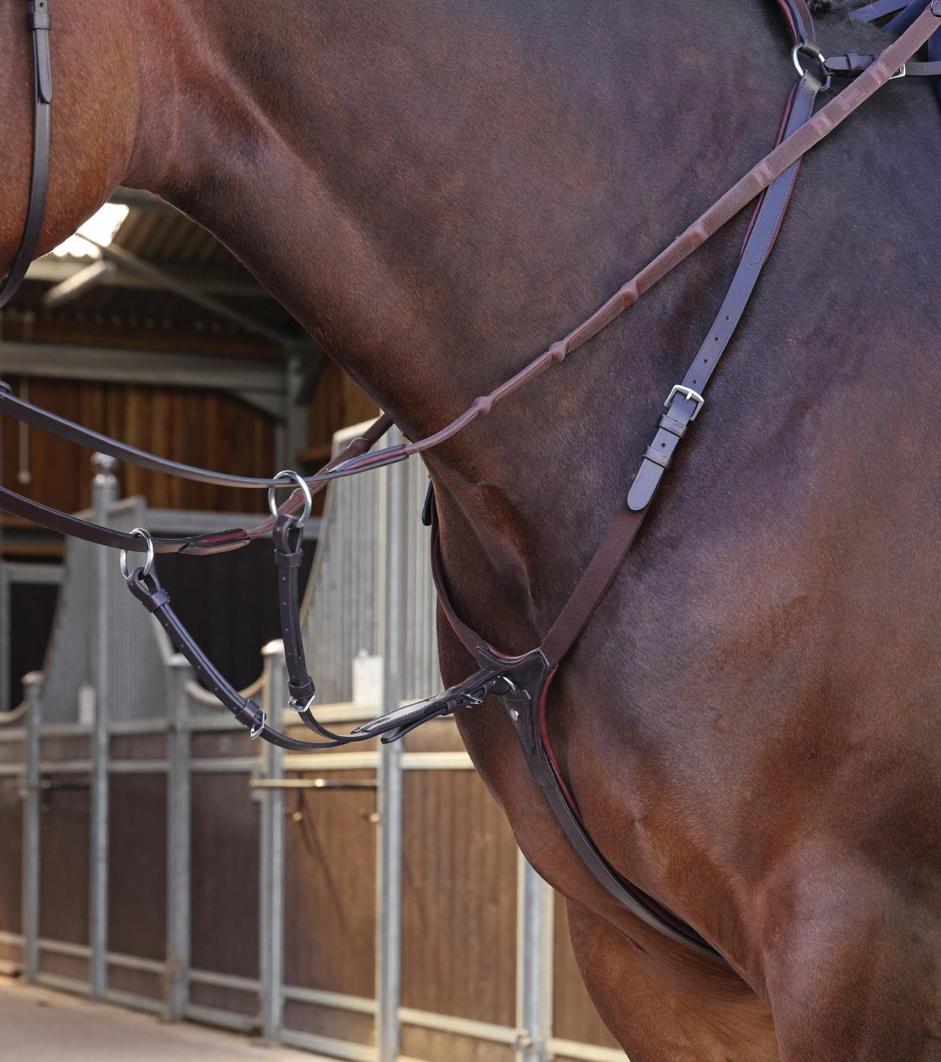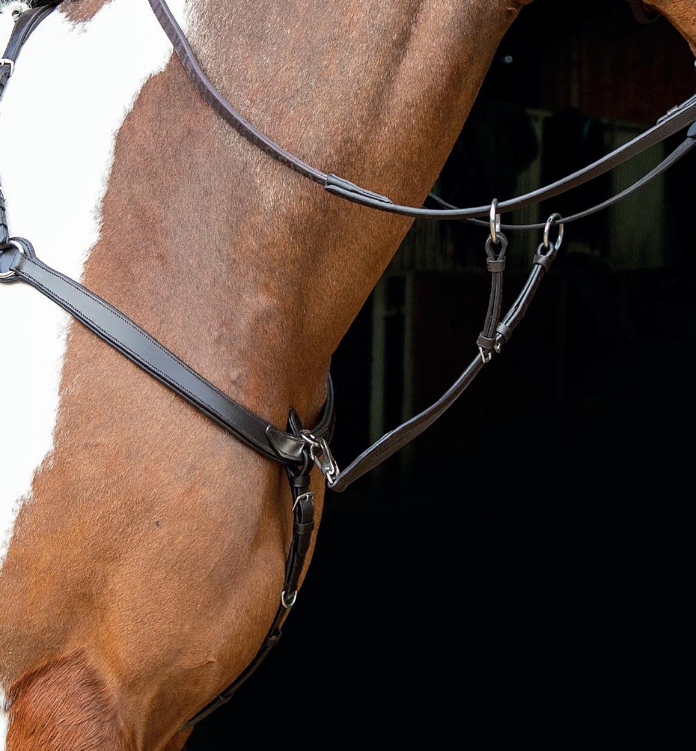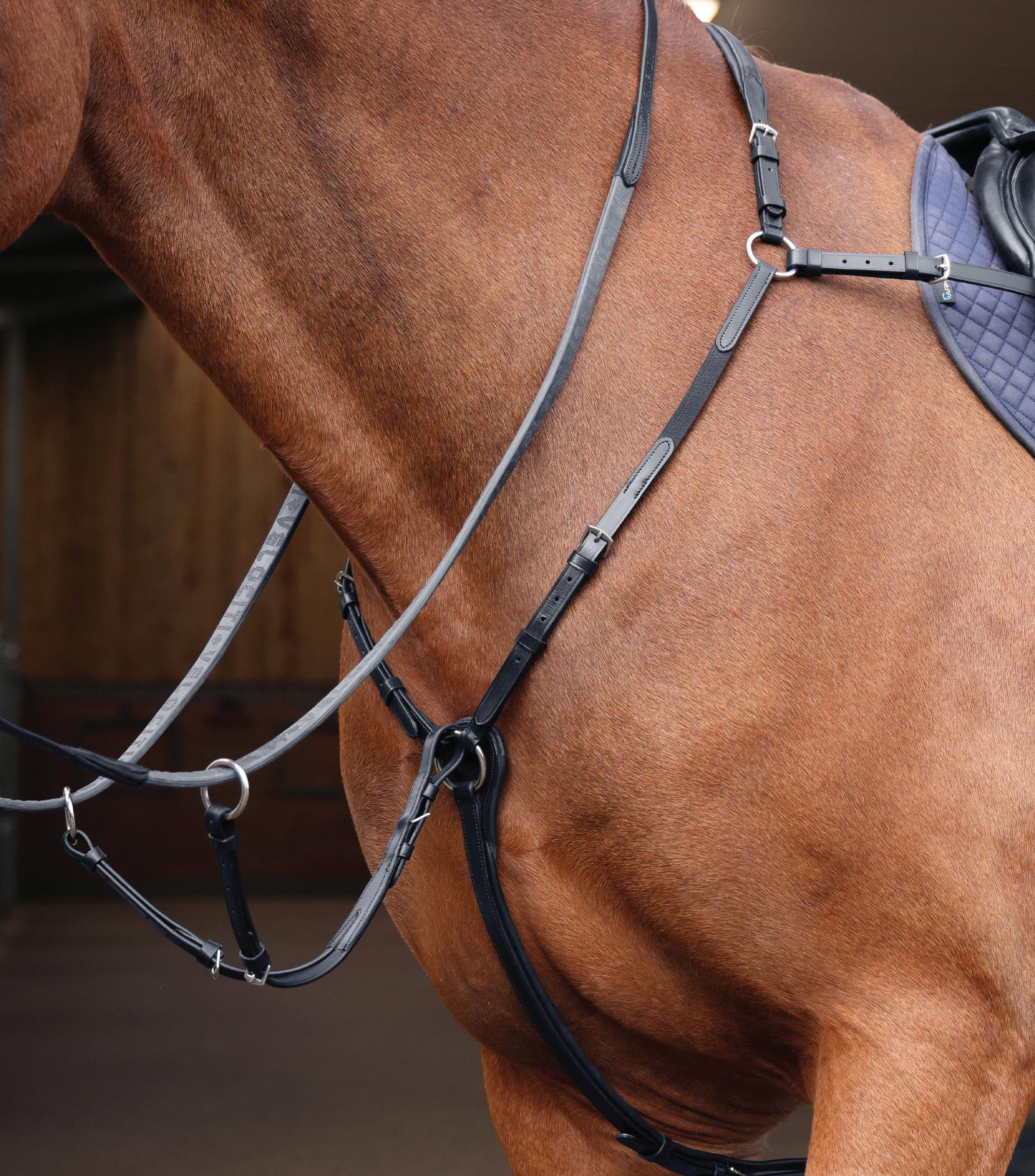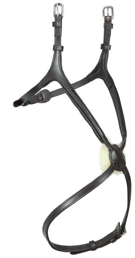 Aiming for a high level of comfort for the horse, deep elastic inserts provide a smoother transition, allowing free movement through the shoulder. The padded wither strap is removable for flexible use. The girth strap is padded with soft cushioned leather for comfort. A detachable running martingale can be buckled on or off. All straps are fully adjustable for individual fit. Quick fit clip attachment at the saddle and girth points.