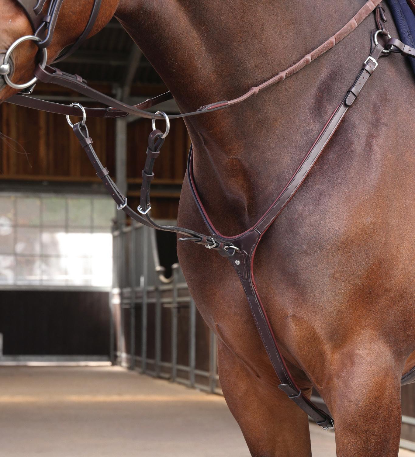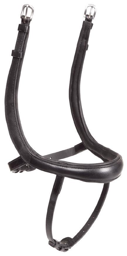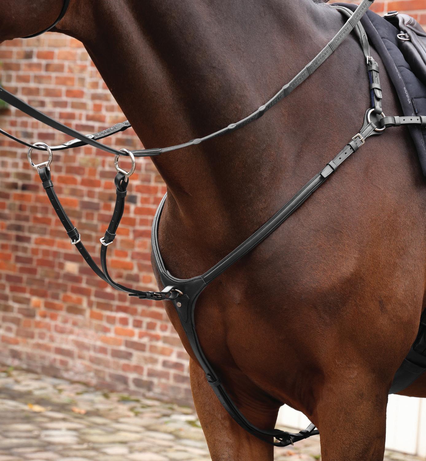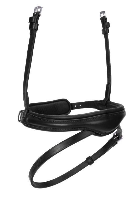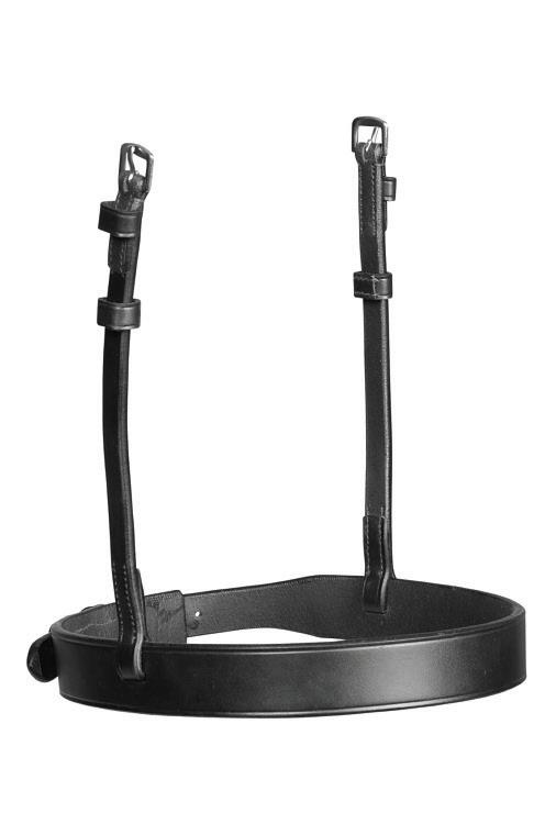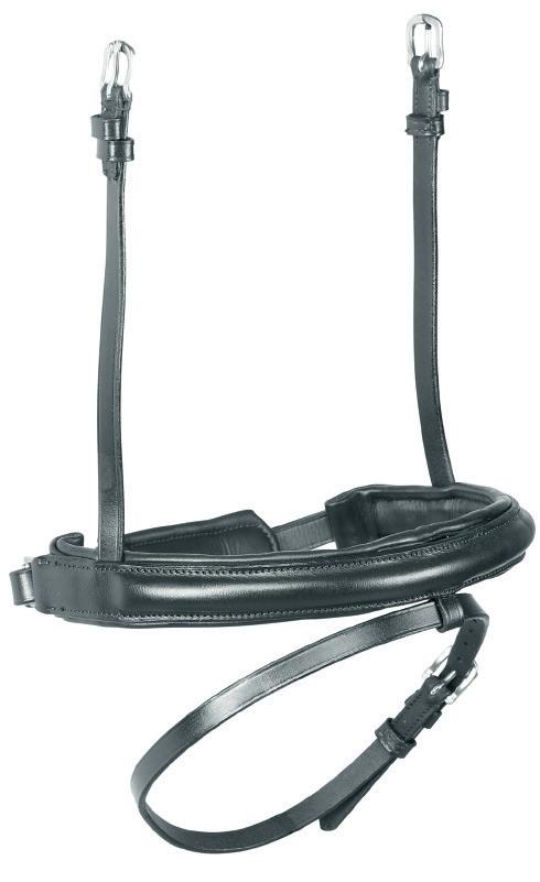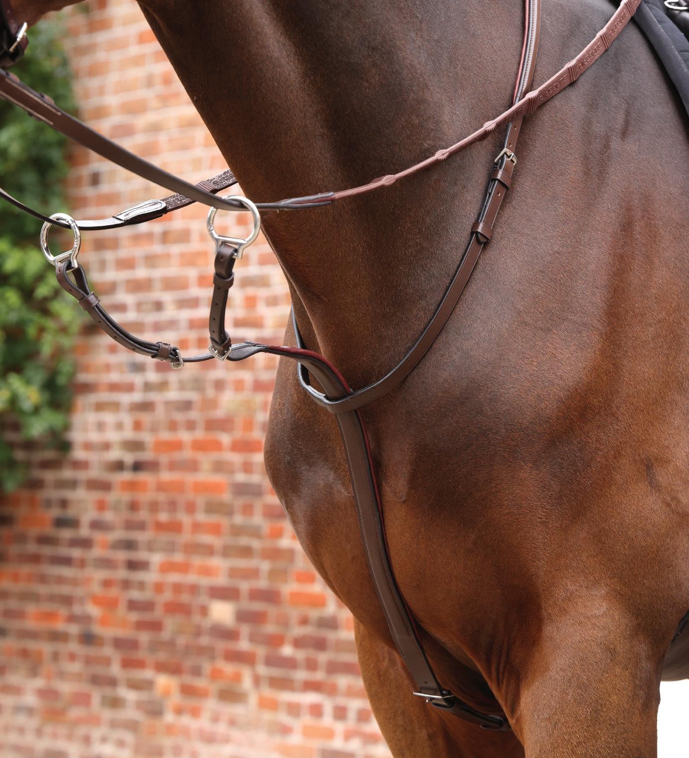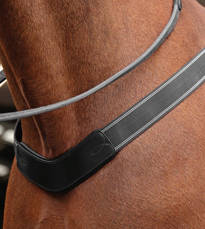 Aiming for a high level of comfort for the horse, deep elastic inserts provide a smoother transition, allowing free movement through the shoulder. The padded wither strap is removable for flexible use. The girth strap is padded with soft cushioned leather for comfort. A detachable running martingale can be buckled on or off. All straps are fully adjustable for individual fit. Quick fit clip attachment at the saddle and girth points.