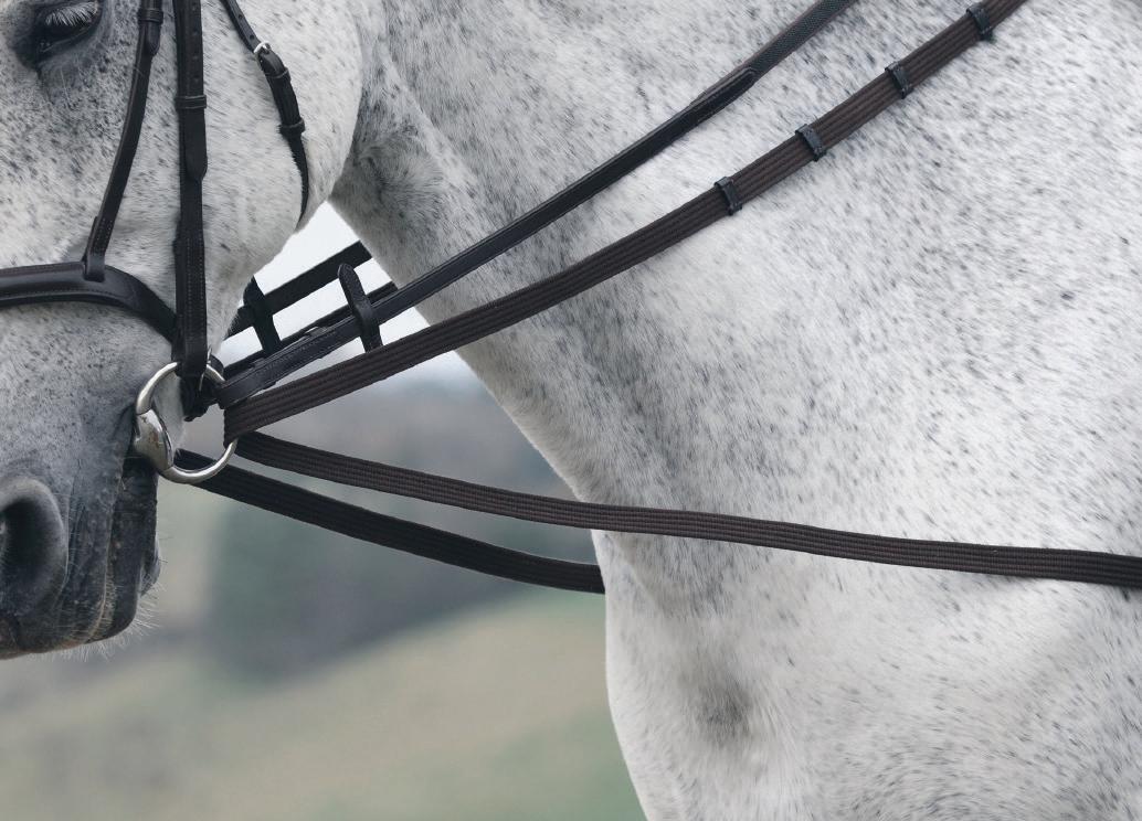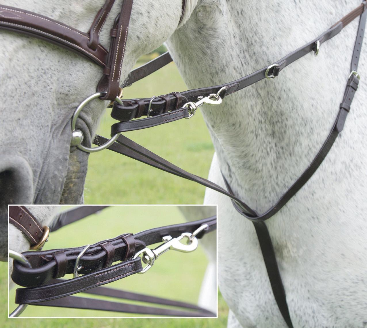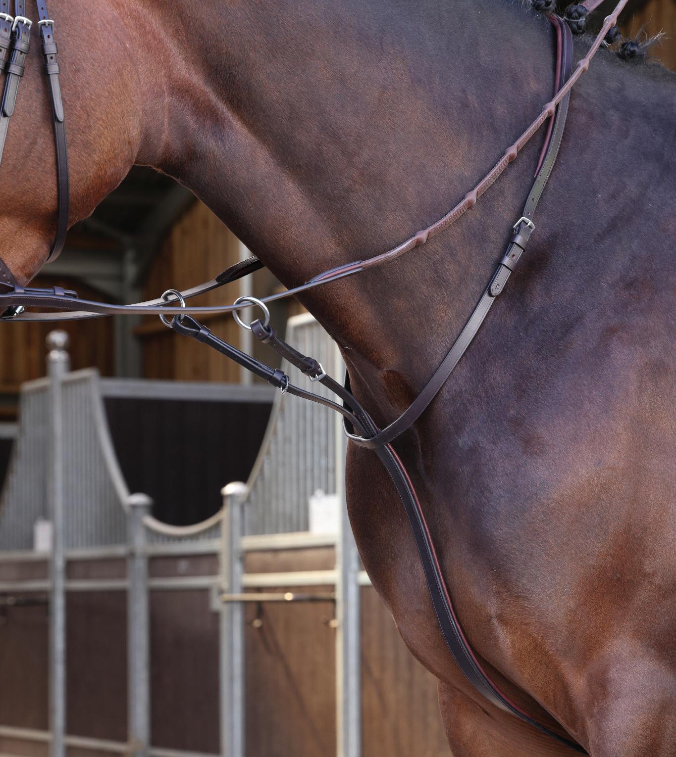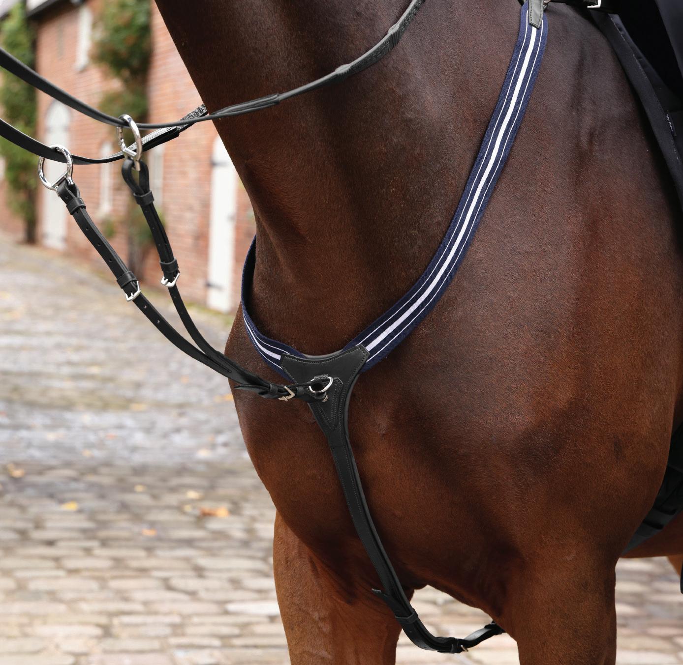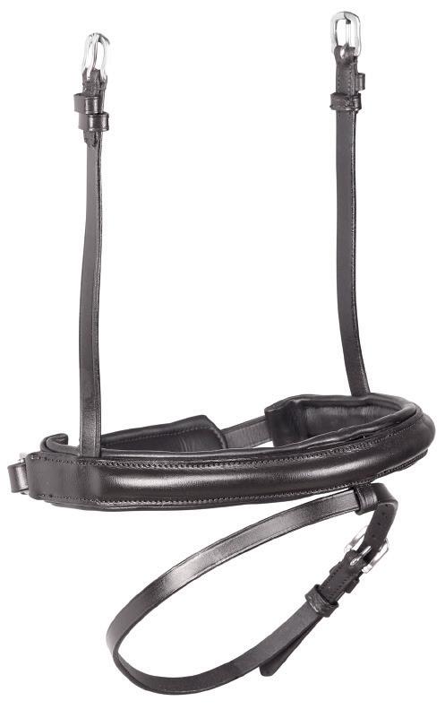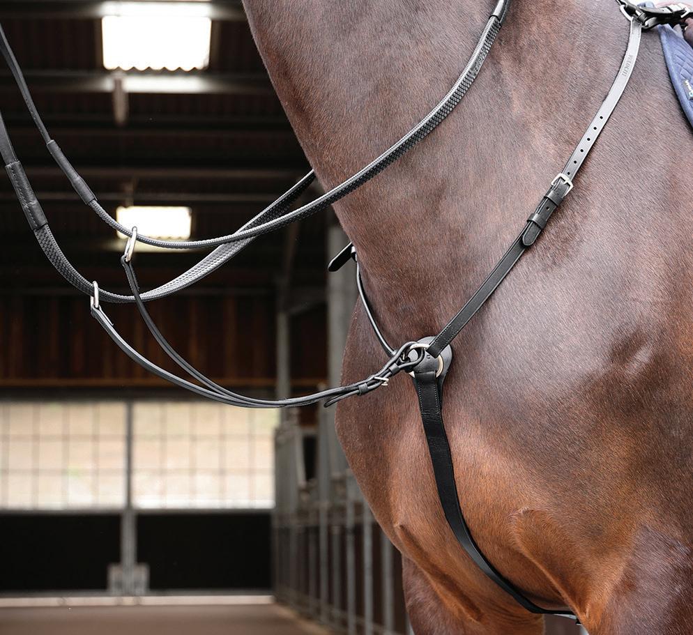 Aiming for a high level of comfort for the horse, deep elastic inserts provide a smoother transition, allowing free movement through the shoulder. The padded wither strap is removable for flexible use. The girth strap is padded with soft cushioned leather for comfort. A detachable running martingale can be buckled on or off. All straps are fully adjustable for individual fit. Quick fit clip attachment at the saddle and girth points.