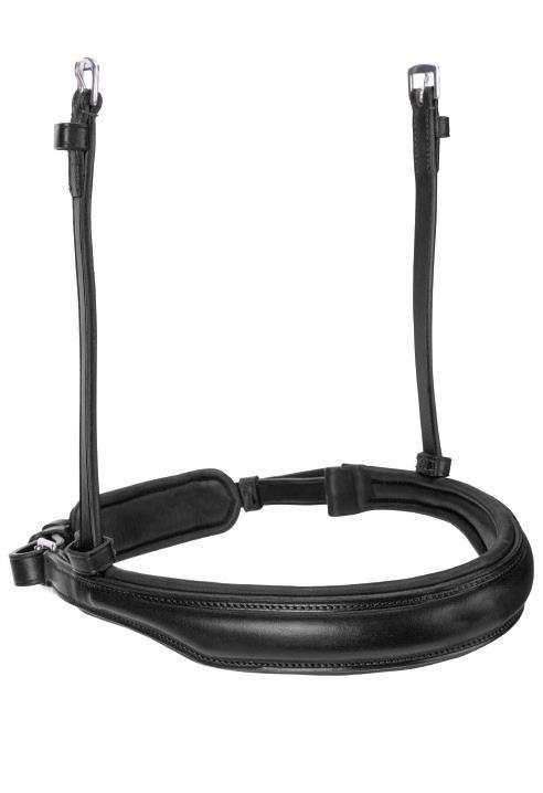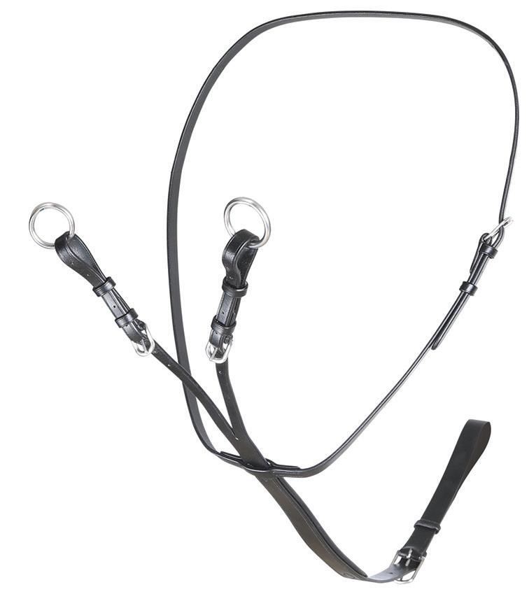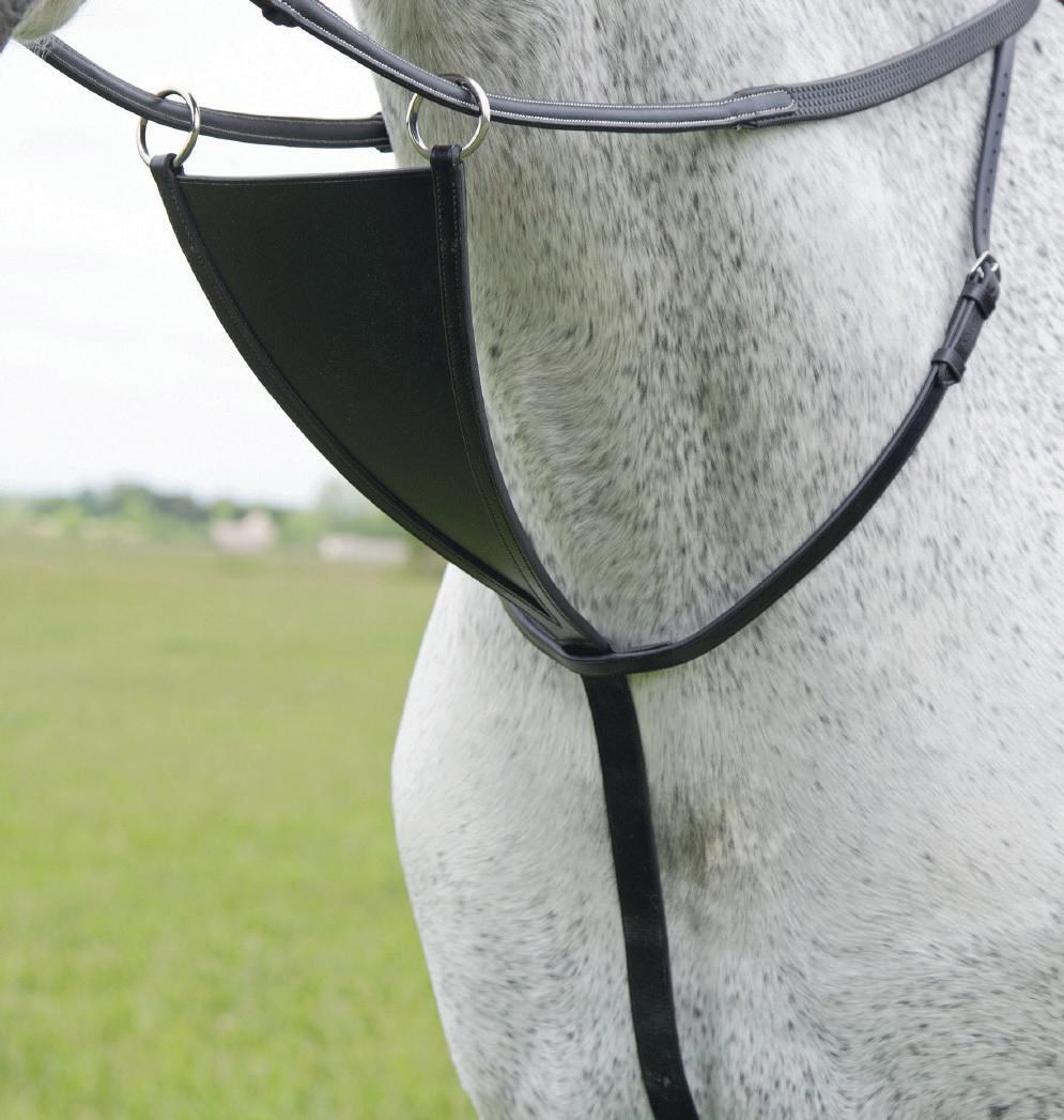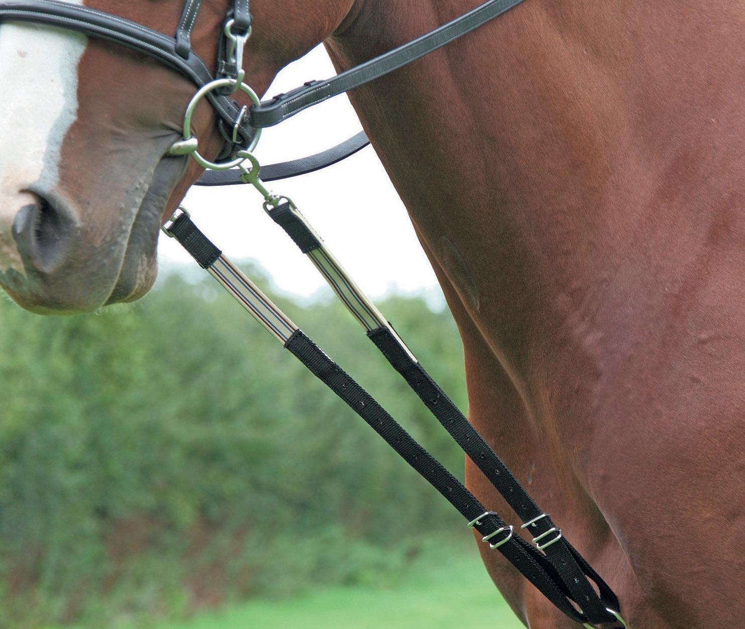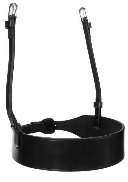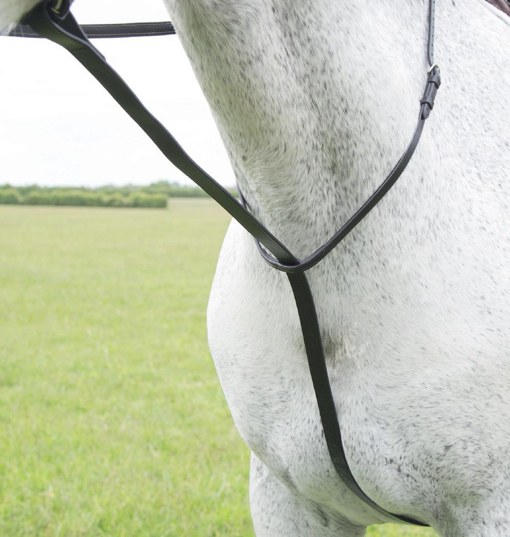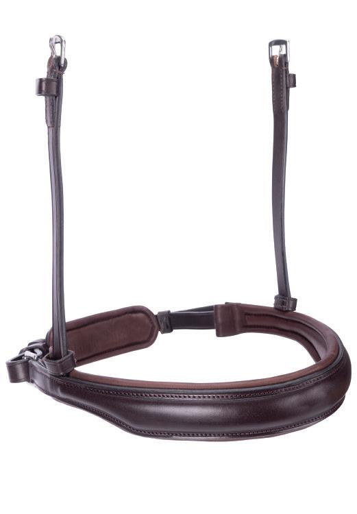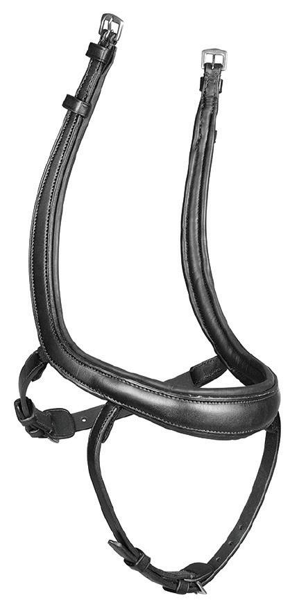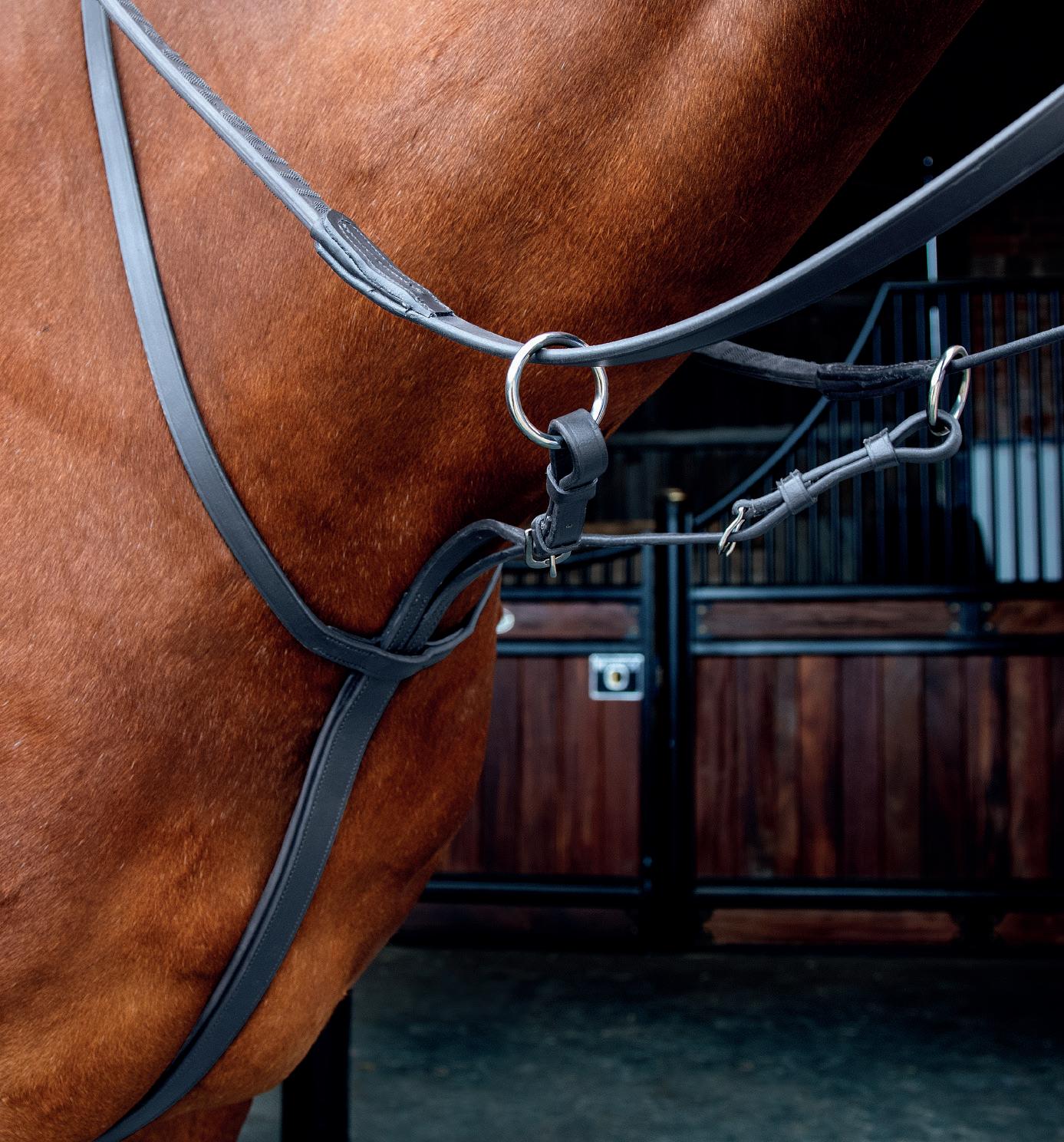 Aiming for a high level of comfort for the horse, deep elastic inserts provide a smoother transition, allowing free movement through the shoulder. The padded wither strap is removable for flexible use. The girth strap is padded with soft cushioned leather for comfort. A detachable running martingale can be buckled on or off. All straps are fully adjustable for individual fit. Quick fit clip attachment at the saddle and girth points.
