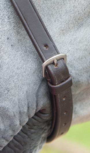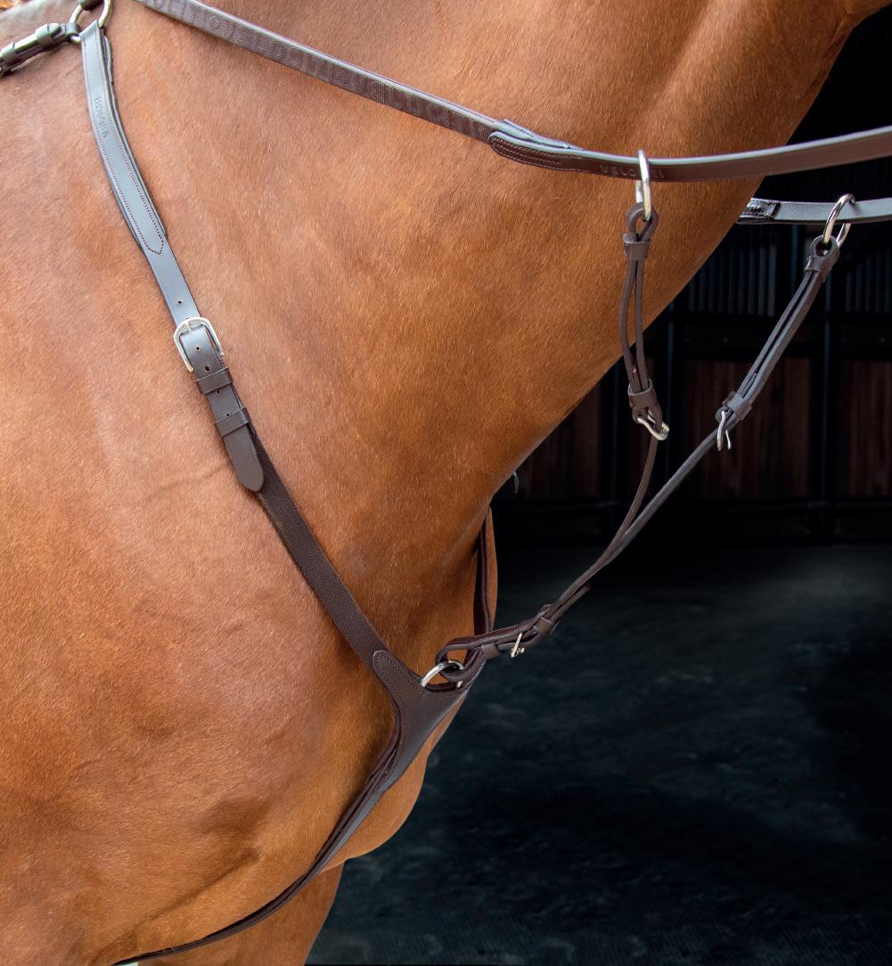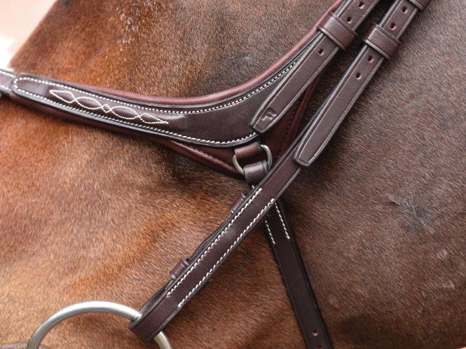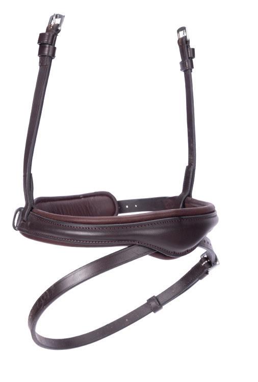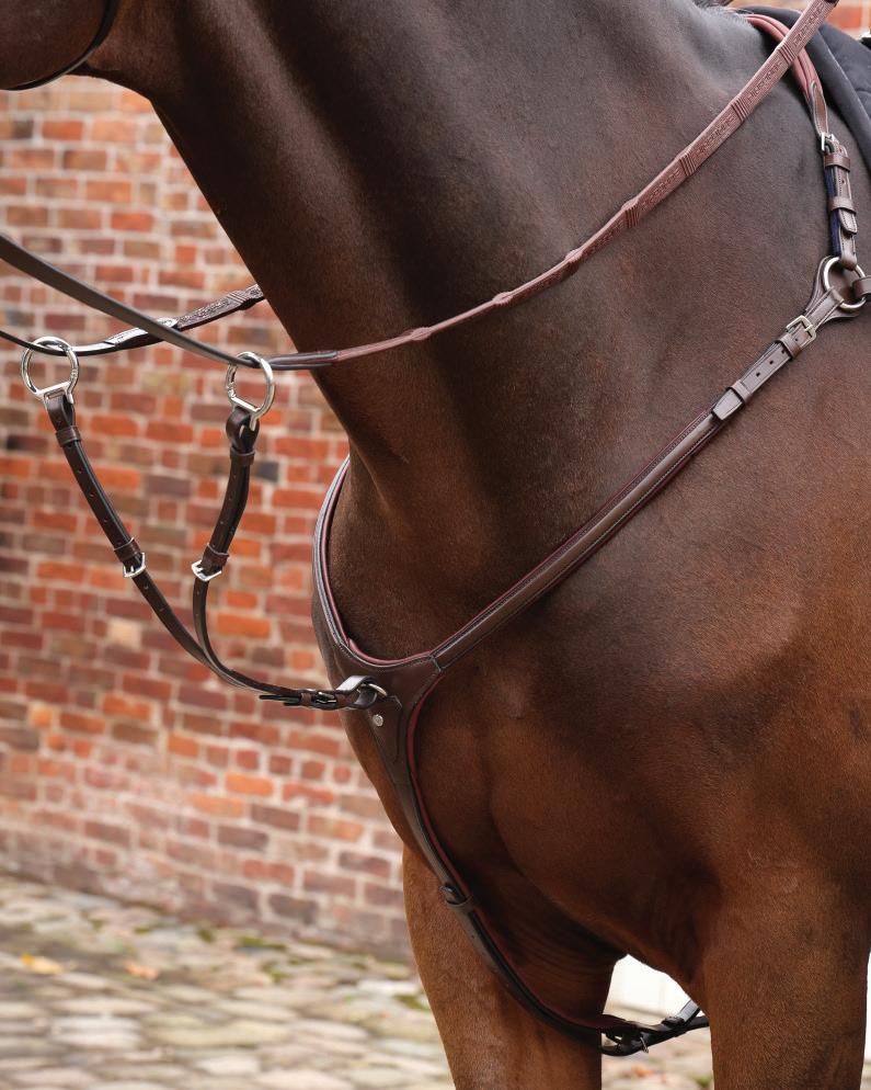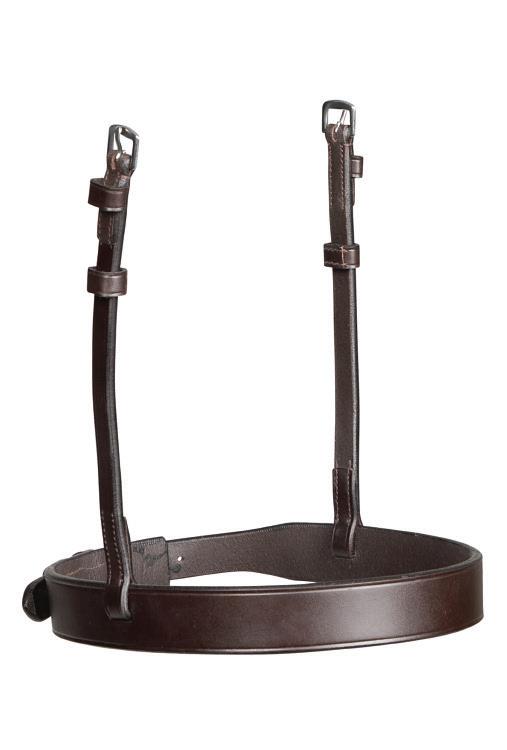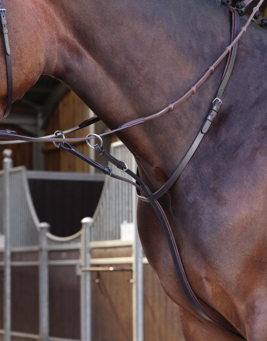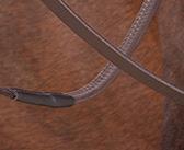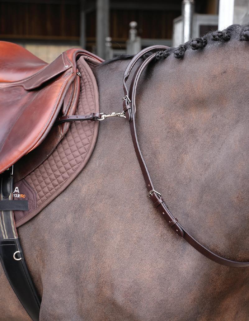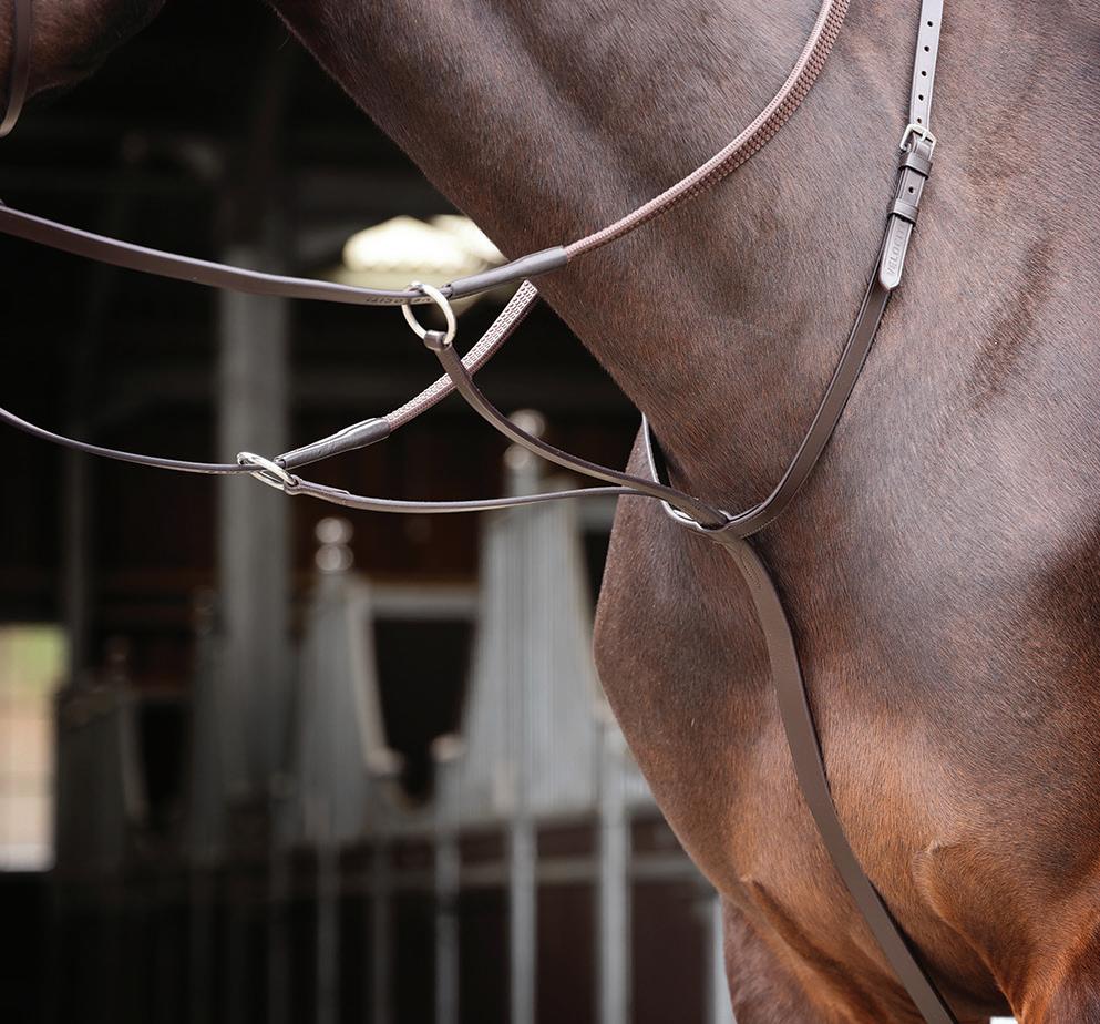 Aiming for a high level of comfort for the horse, deep elastic inserts provide a smoother transition, allowing free movement through the shoulder. The padded wither strap is removable for flexible use. The girth strap is padded with soft cushioned leather for comfort. A detachable running martingale can be buckled on or off. All straps are fully adjustable for individual fit. Quick fit clip attachment at the saddle and girth points.