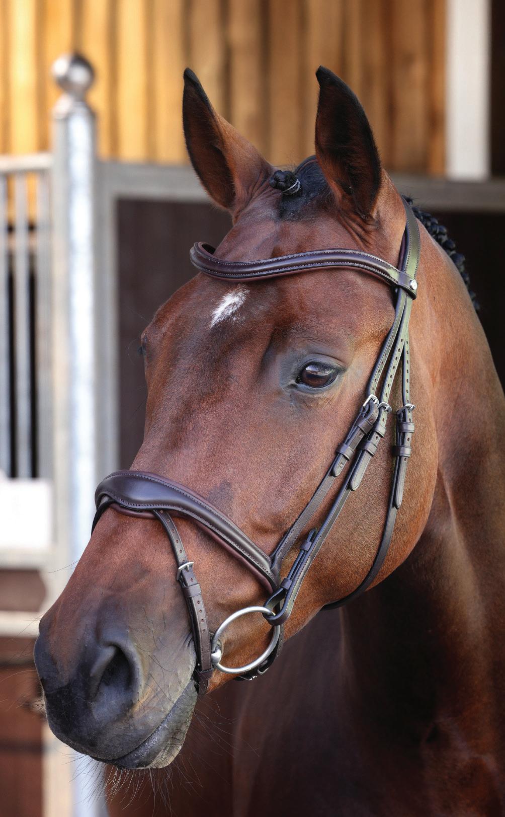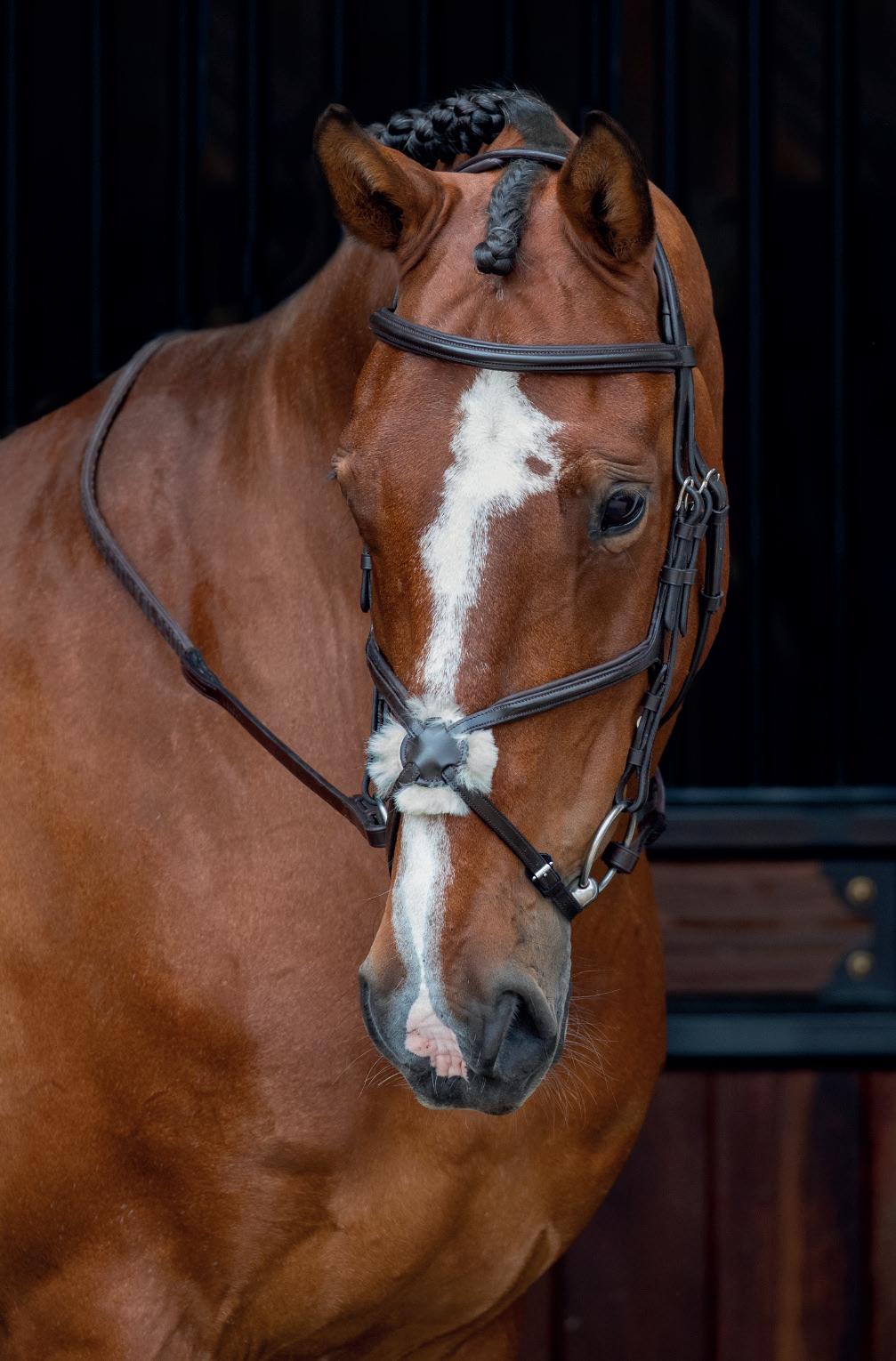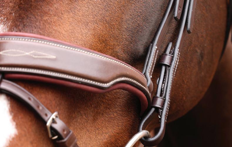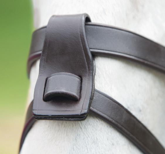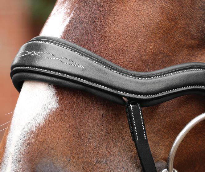 A deep, padded noseband is cut back at the sides to relieve pressure in sensitive areas, the unique noseband design positions the flash for ergonomic advantage and a sophisticated look. The adjustable noseband fastens with a roller buckle and a cushioned pad guards against pinching.