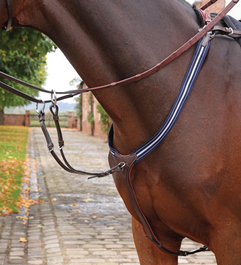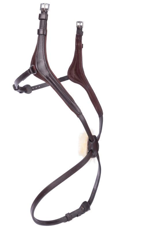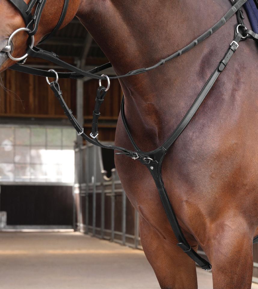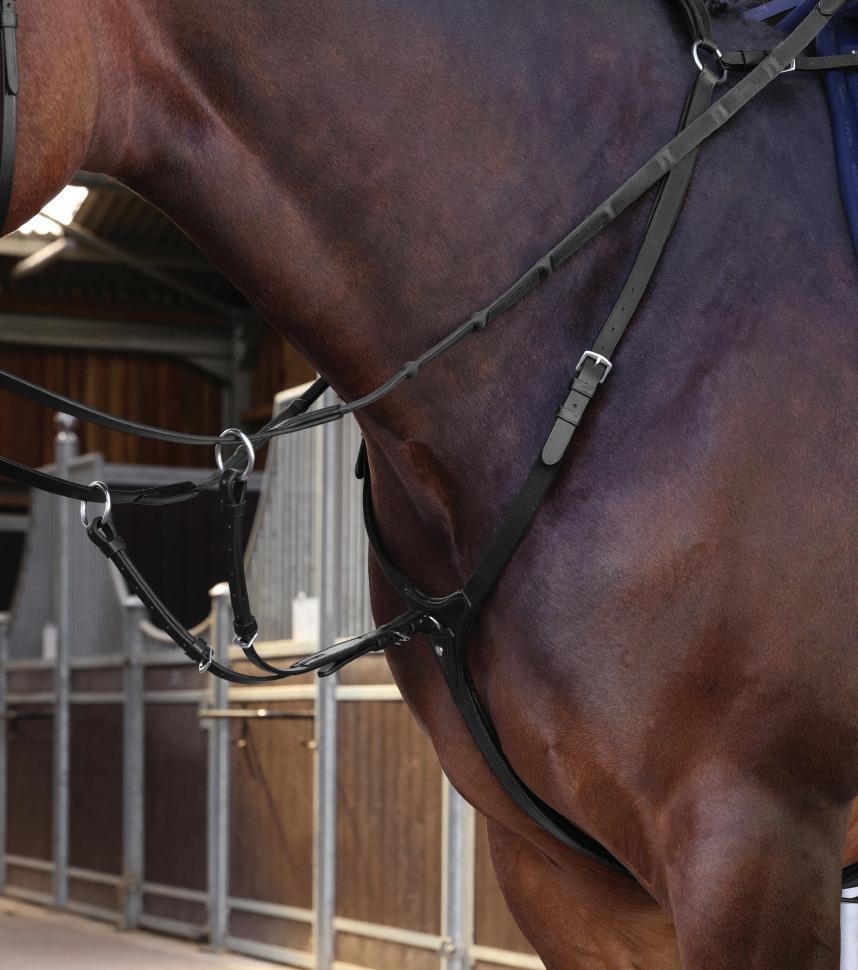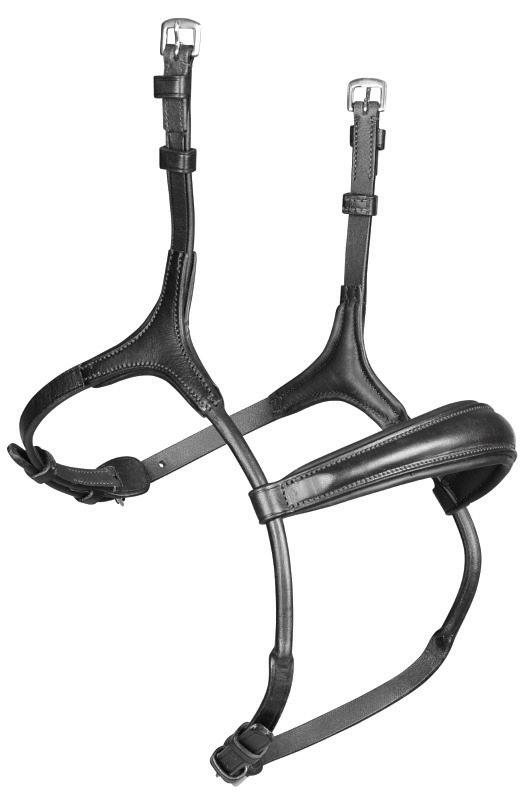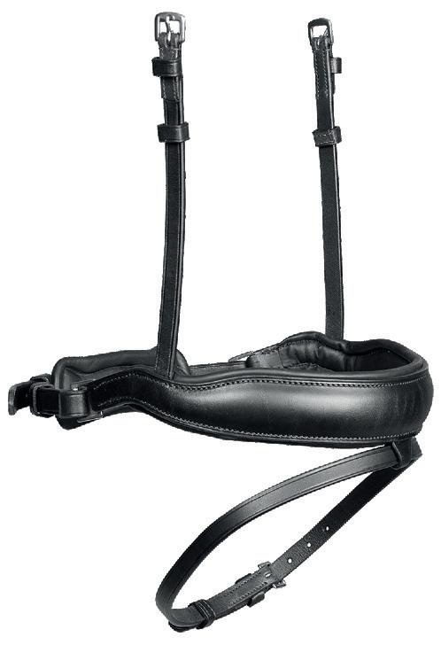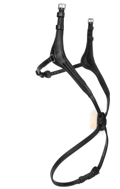 The wither, shoulder and chest areas provide extra comfort being lined with soft cushioned leather. Fully adjustable either side of the wither strap, shoulders and all points of attachment, clips quickly secure to the saddle D-rings for quick attachment, detachable running martingale, stretch inserts allow free movement through the shoulder.