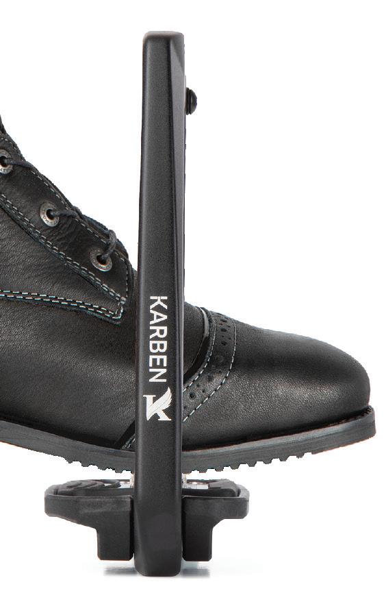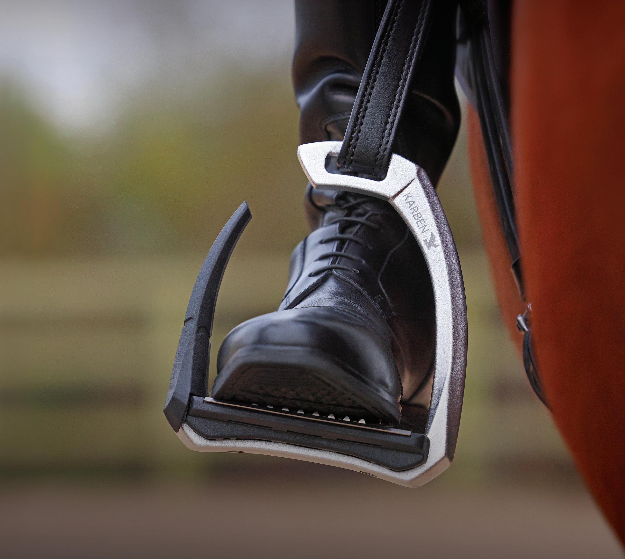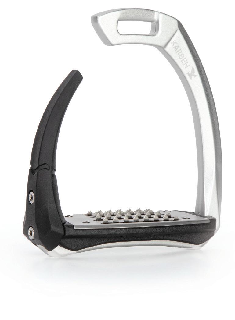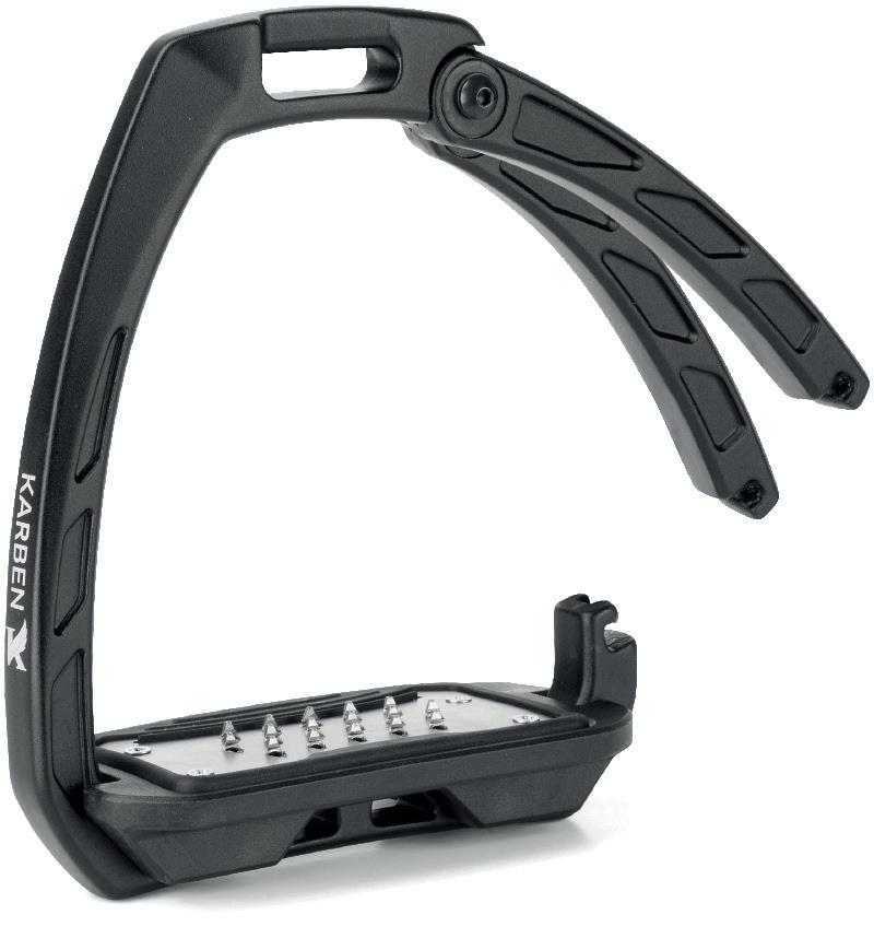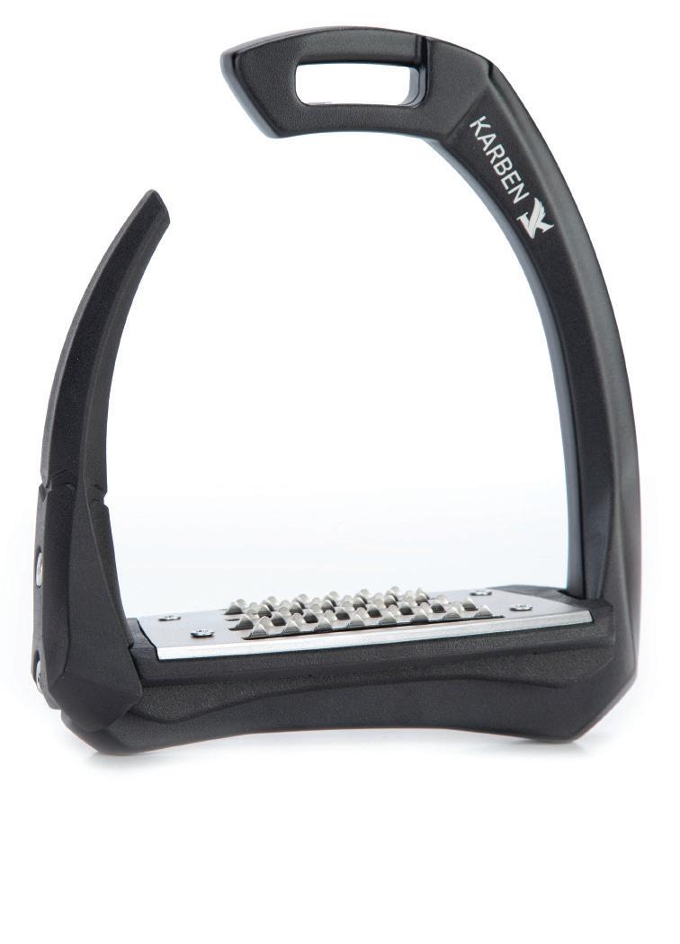 Thoughtfully proportioned and carefully balanced, the Karben Ultra Grip FX Stirrup combines attractive aesthetics with reassuring safety benefits. Retaining form under normal circumstance, in the event of a fall the outer safety arm flexes under pressure, allowing escape of the foot and reducing incidence of serious injury to the rider. Following release, the rubber arm retains its original shape and purpose as a supportive lateral arm.