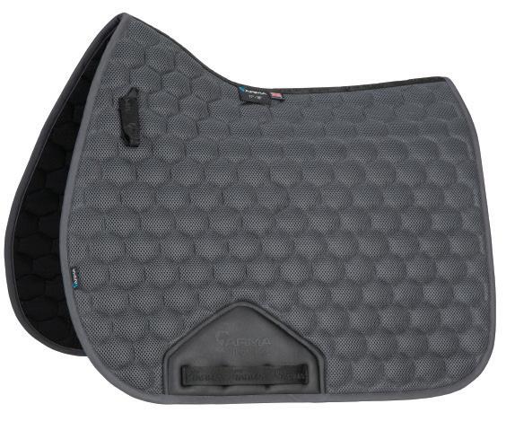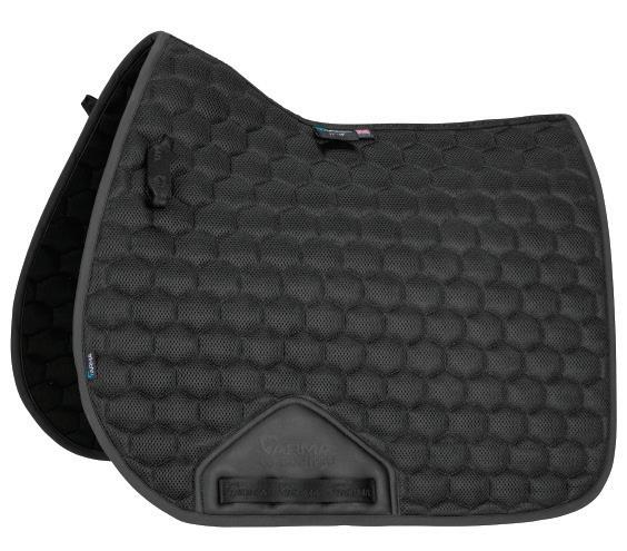 Non-slip saddle pad made using gel to provide a shock absorbing layer between the numnah and saddle, with perforations to allow airflow.