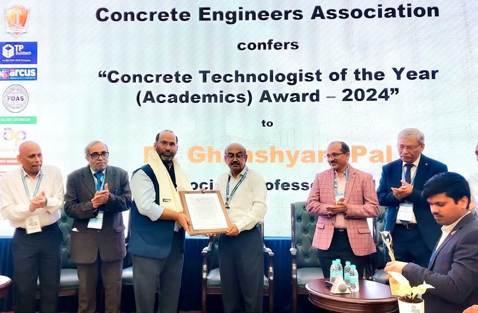 Dr. Ghanshyam Pal, Associate Professor, Department of Civil Engineering, has been honoured with the prestigious Concrete Technologist of the Year (Academics) 2024 by the Concrete Engineers Association, India.