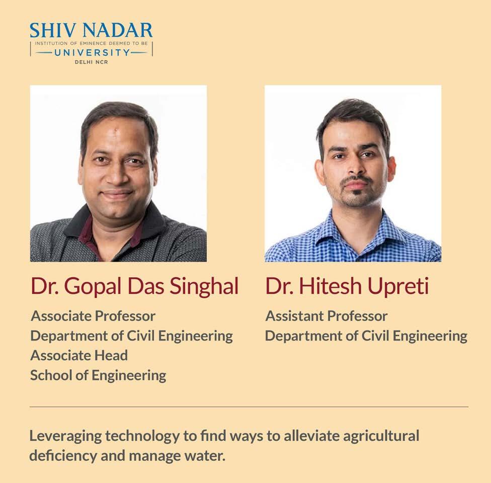 Dr. Gopal Das Singhal, Associate Professor, Department of Civil Engineering; Associate Head, School of Engineering, and Dr. Hitesh Upreti, Assistant Professor, Department of Civil Engineering, are using emerging satellite and drone remote sensing techniques, data analysis, and IoT to research water management and agricultural monitoring to attempt to alleviate agricultural deficiency.