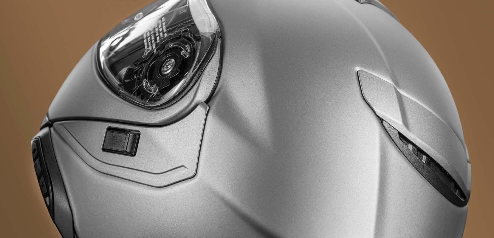 Glatte Oberflächen und Übergänge reduzieren den Windwiderstand des Helmes und die Geräuschbelastung der Trägerin oder des Trägers, lassen aber die integrierten Spoiler seitlich und hinten am Helm und damit den sportlichen Charakter des SHOEI NEOTEC3 erkennen.
