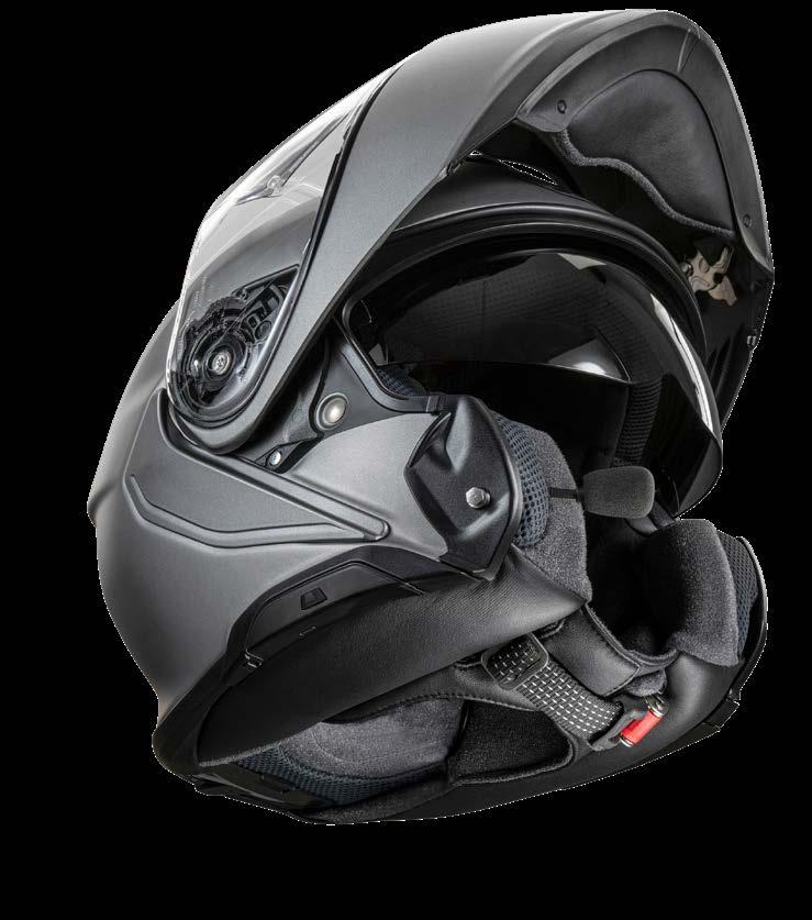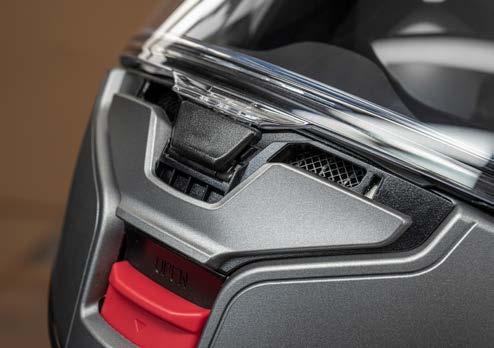 Nach aktueller Prüfnorm ECE-R 22.06 zertifiziert ist der NEOTEC3 dank P/J-Homologation bei angepasster Geschwindigkeit auch für Einsatz mit geöffneter Kinnklappe geeignet. Ein tief verzweigtes Ventilationssystem sorgt auch bei geschlossenem Helm für Frischluft und Kühlung.