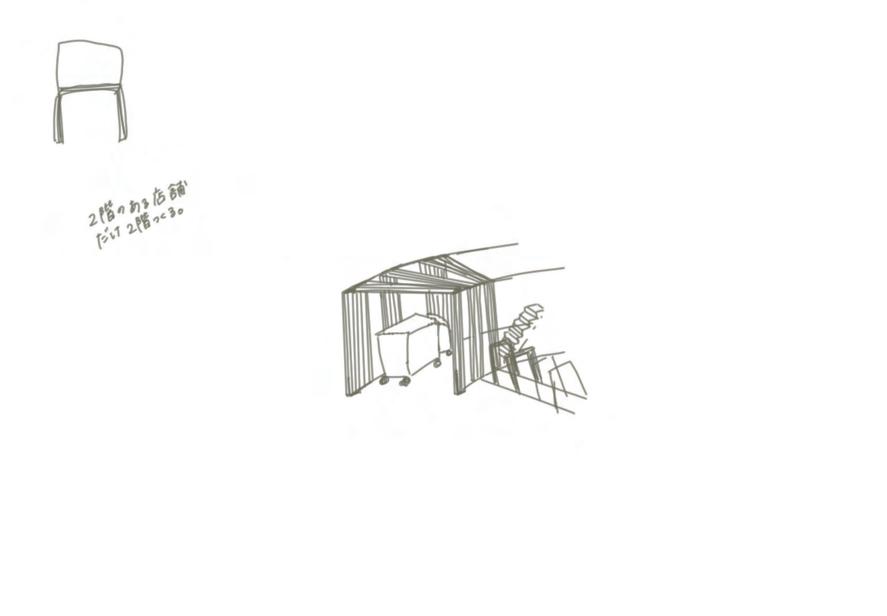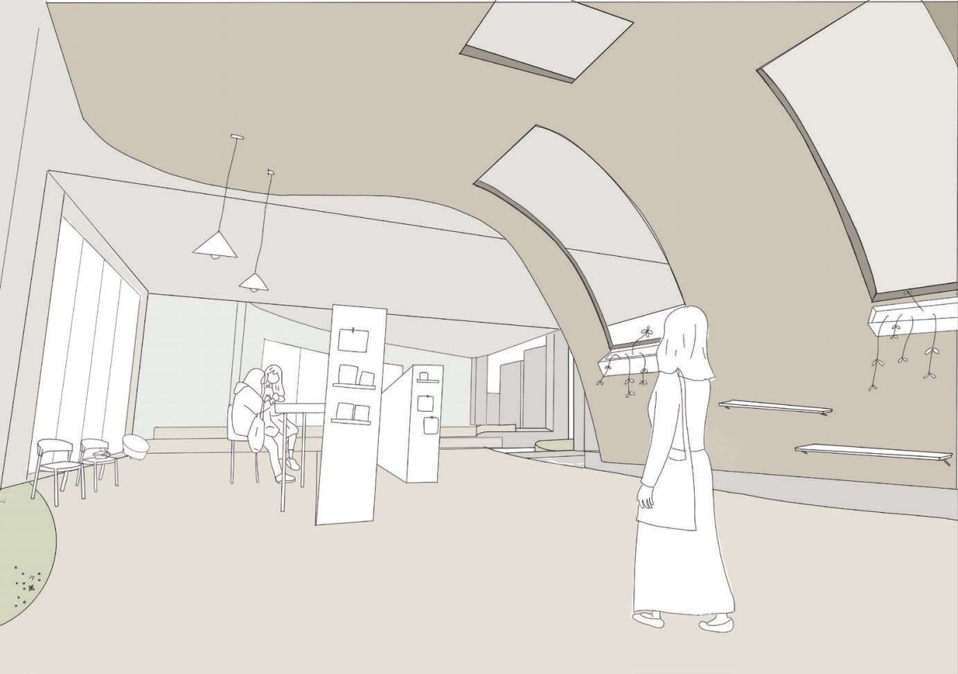 図書館からの「道」としてつながりながらカフェ、花屋、図書館の本を買い取ることのできる本屋を設ける。また、施設から 外に向けて飛び出した机や棚は広場に続き、店内に入らなくても外からそのまま休憩することができる。