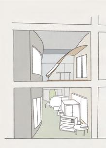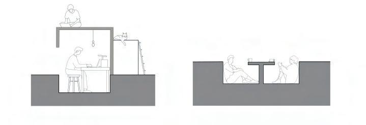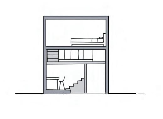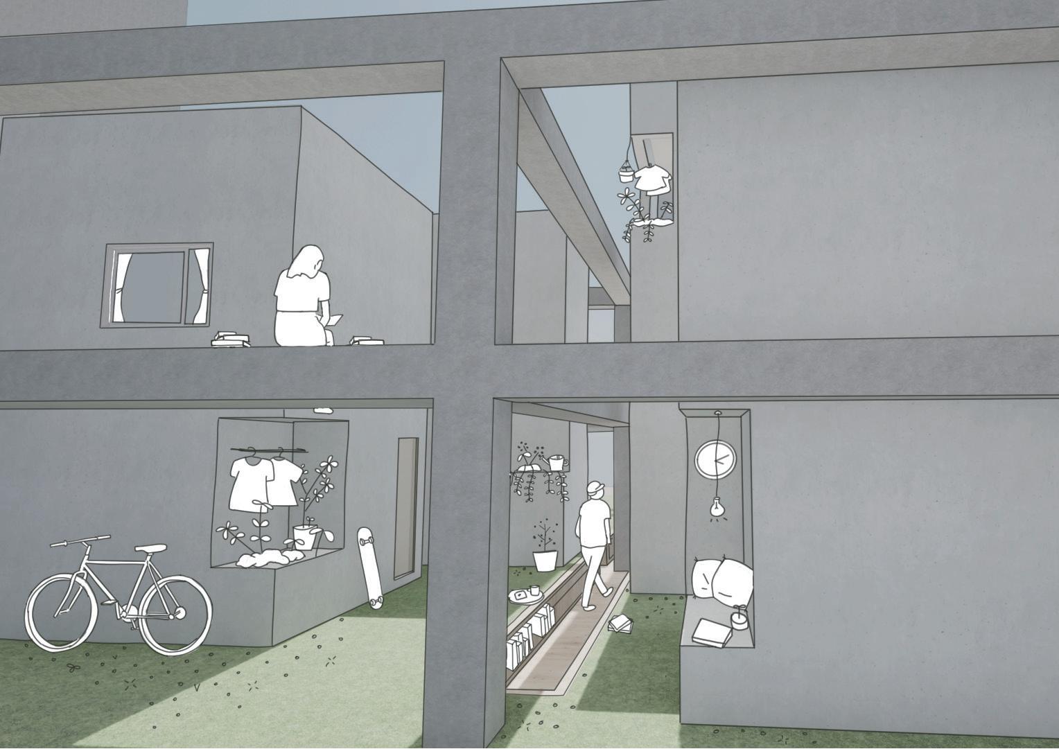 住民は本を持ち寄って、集まり、暮 らしていく。普段から共有の本棚にそ のままお気に入りの本を置き、退去時 にも置いたままにすることによって、 帰ってくる場所を作る。本という媒体 を通して住民同士の存在を把握するこ とで、居心地の良い集合住宅を作る。