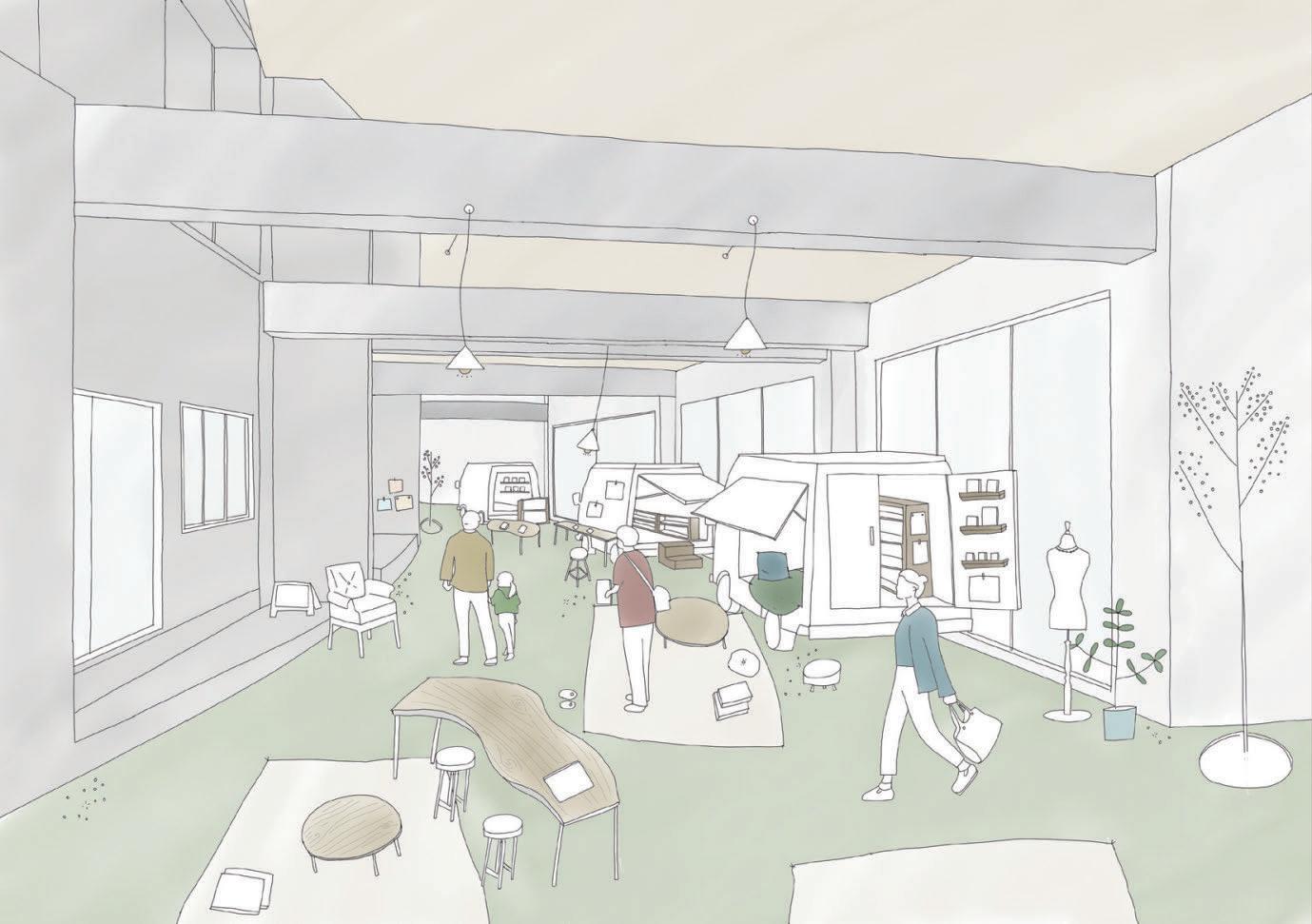 「道」のような空間 に「トラック図書館」を停車させ る。 トラ ック 図書 館は テナ ント に寄り添ったジャンルの本を運びこんでくる。