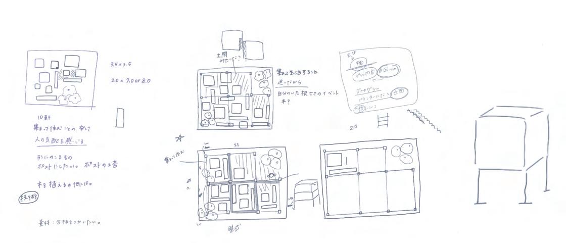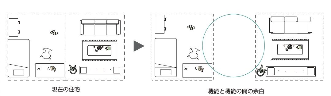 現在の住宅は,機能と機能の間に隙間がなくムダのな い生 活を送っている。そこで,機能を持つ空間 の間 に余白を 生み 出すことで自 分たちが求めている空間 ,つまり付加価 値を入れる場を作りだすことが できる。