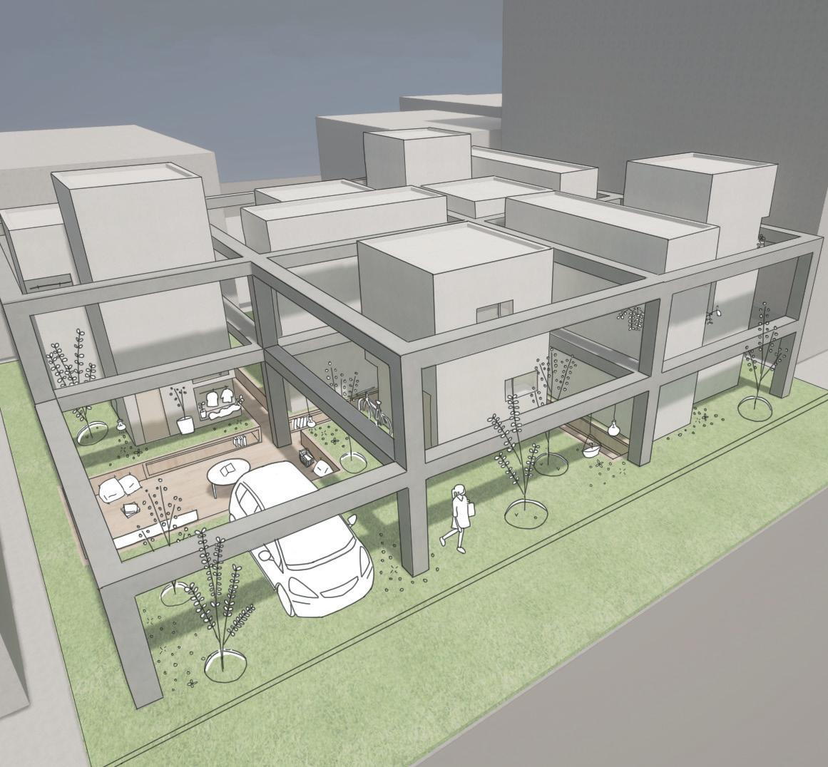 各住戸をプランターのように用い、 住民一人一人の個性が溢れる住宅に なっていく。家の中からも楽しみなが ら、外を通る人にも自分の個性を出す ことができる場となる。