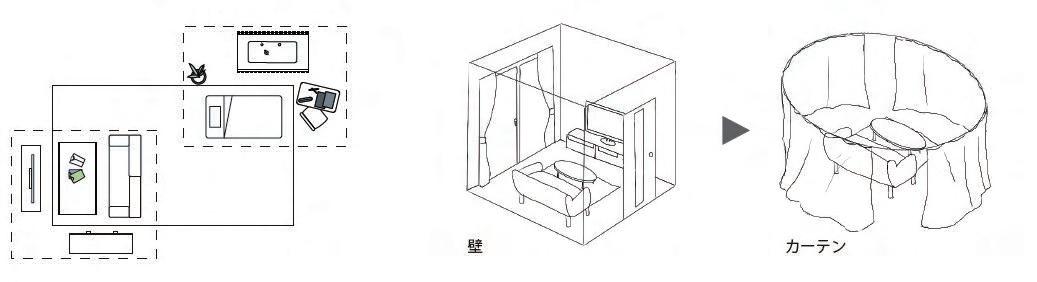 空間を区切る境界 が曖 昧となり機能を部屋 の外 に 滲み 出すことができる。