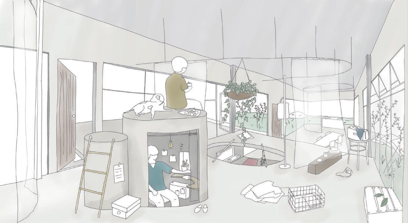 住宅に「穴 」を設置する。日常生 活を送る上 で障 害となる「穴 」を をどのように変化させていけば, 豊かな空間にできるのか使い方を 工夫し自らの求める居場 所を生み 出す。