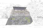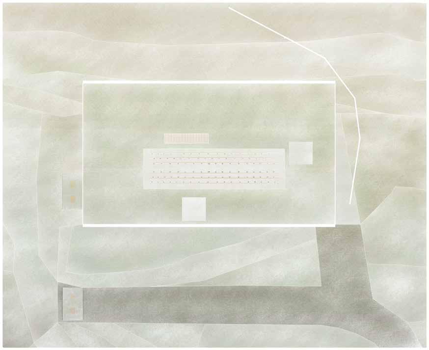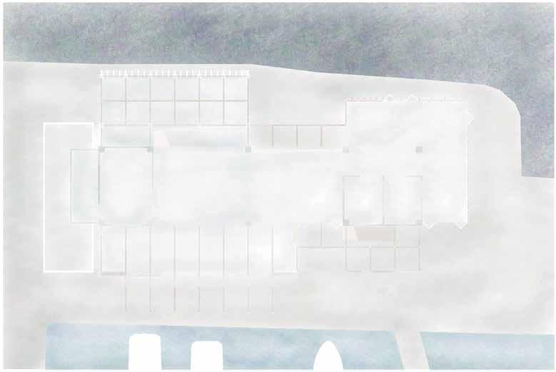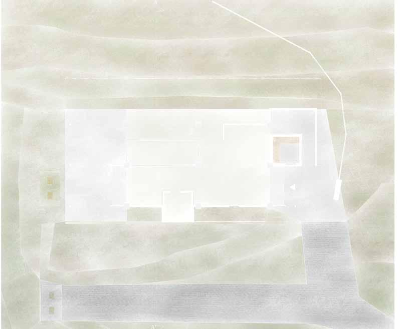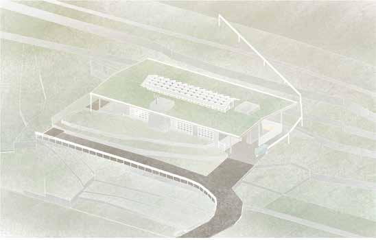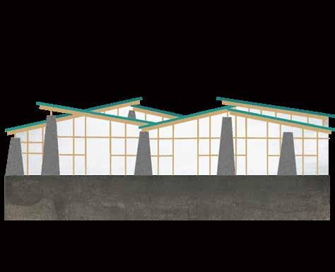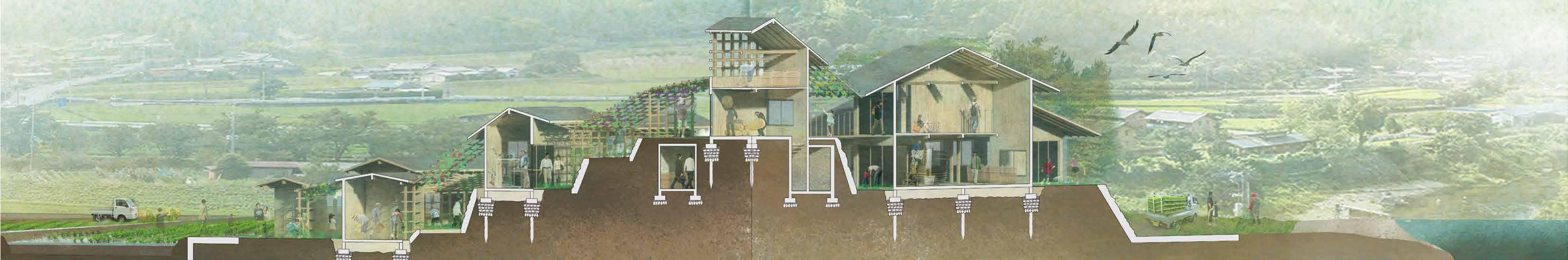 水害から暮らしを守るために、水塚は町民たちによる土盛りによって起伏に富んだ形状をしており、現在も利 根川流域の景観として残り続けている。食糧貯蔵庫であった水屋の機能は継承しつつ、地形に沿うように垂木 を延長させて乾燥を行うパーゴラを設置し、現代版水塚を再編した。壁、屋根、垂木が一体となって動線を導く。