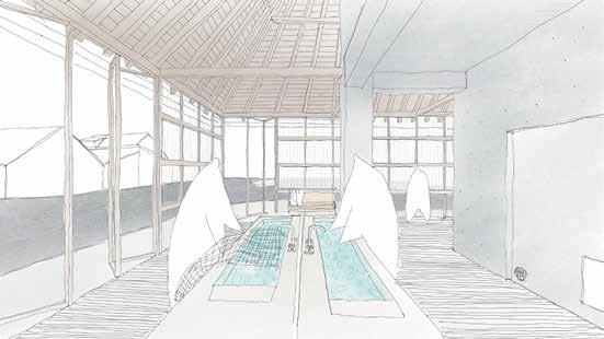空間の使われ方としては、島を観察することにによって発見し た、生業のための空間を肥大化し、その余白に公共的な空間を付 加するように再解釈することで、使い方の冗長性を獲得し、島民、 観光客が日常的に作業し、交流ができるように設計している。現 代的な立ち方でありながら、人が古くから親しんでいる懐古的な コミュニティに焦点を当てる、そんな建築のあり方を考えた。