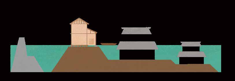 水塚の地形に合わせて収穫 から乾燥、貯蔵、加工、そ して販売や調理、飲食と 産ラインがシームレスに繋 がる。食産業を集約したこ
