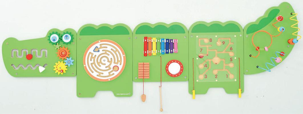 CROCODILE 5-ACTIVITY SENSORY WALL PANEL: Features two mazes with two shapes to move sideways; six overlapping gear wheels; rotating labyrinth; xylophone; grater & mirror; nine-ball maze with nine compartments; three sliders with 14 beads on rods. Ready to assemble.