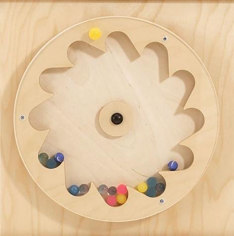 GEAR WHEEL WITH RUBBER BALLS PANEL: Little balls hop back and forth when the wheel turns. Plexiglass holds the balls in the unit.