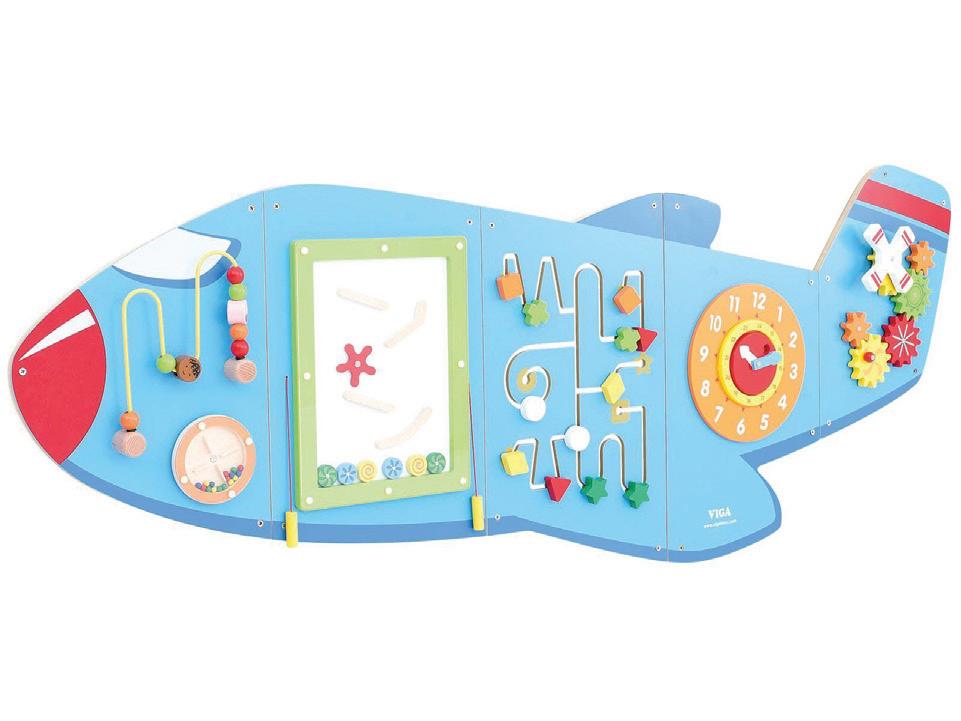 AIRPLANE 6-ACTIVITY SENSORY WALL PANEL: eight shapes; wheel with 16 colored balls inside plexiglass; gear and wheels in a maze moved with magnets; slide with 12 elements; clock with numbers and movable hands; seven overlapping gears that rotate by turning a propeller. Ready to assemble.