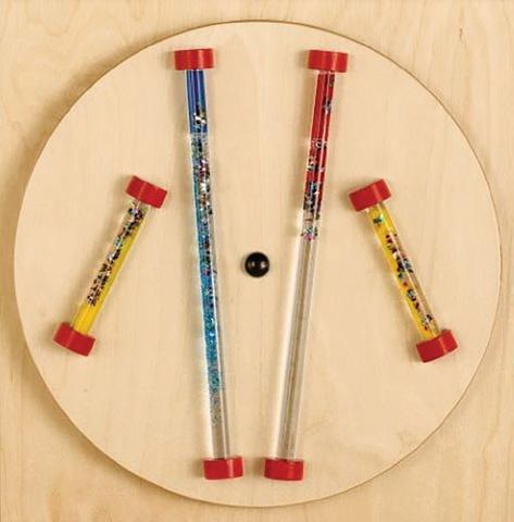GLITTER RODS PANEL: Turn the disc to watch the glitter flow within the tubes.