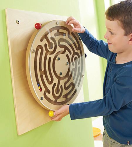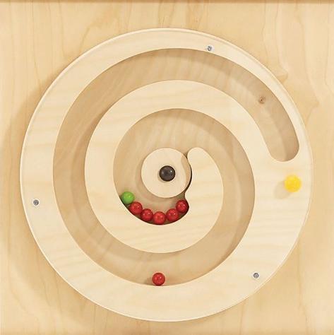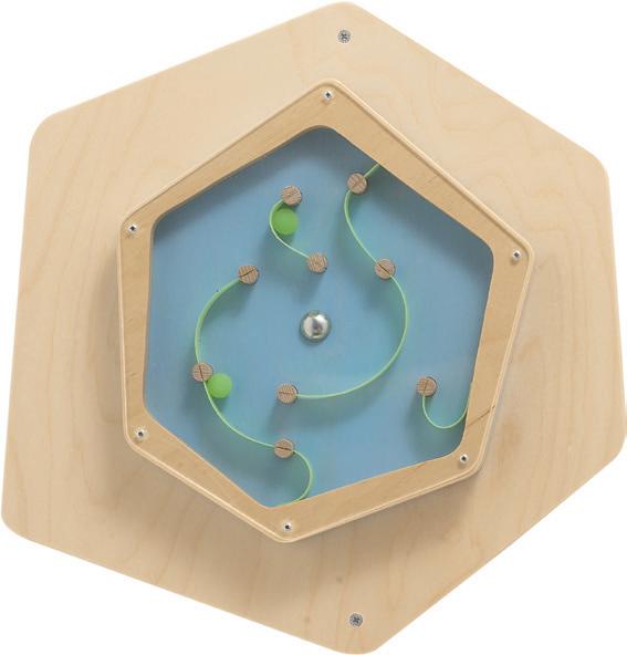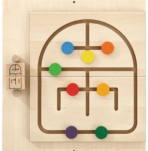 Features a turning panel with Plexiglas. Turn the panel to move the rubber ball through the maze. Helps develop hand-eye coordination.