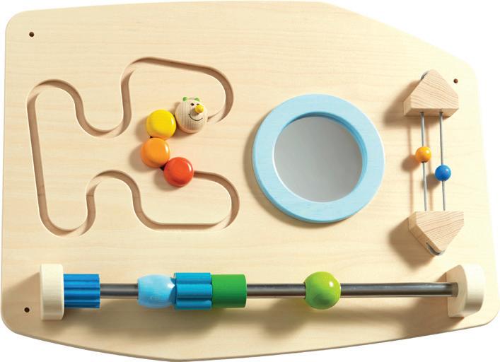CIRCLE RIGHT – Wooden rattle; games with shapes that slide, with four-piece caterpillar and plane; and corner mirror.