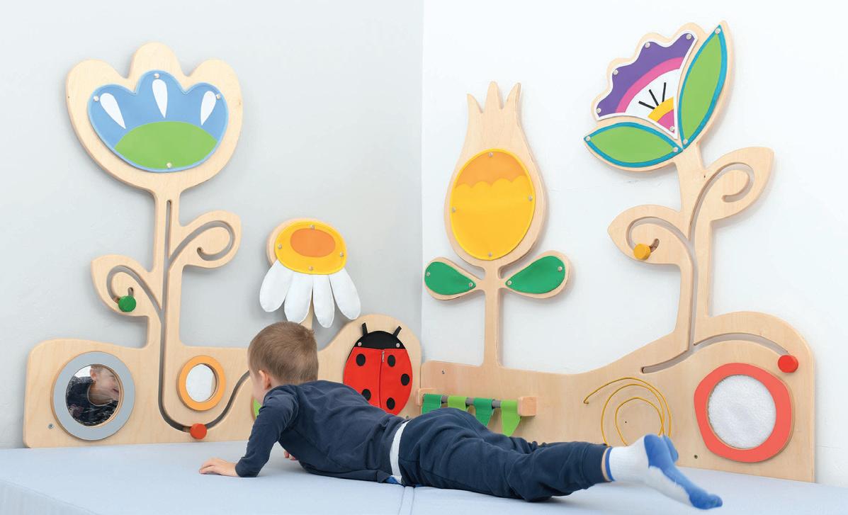 MEADOW WITH LADYBUG SENSORY ACTIVITY WALL PANEL: Features two round plexiglass mirrors; track with three sliding ladybugs; swivel wheel with colorful print; ladybug has zipper wings that reveal a mirror; fabric-covered flower petals; daisy’s petals each feature different sensory element. Assembled.