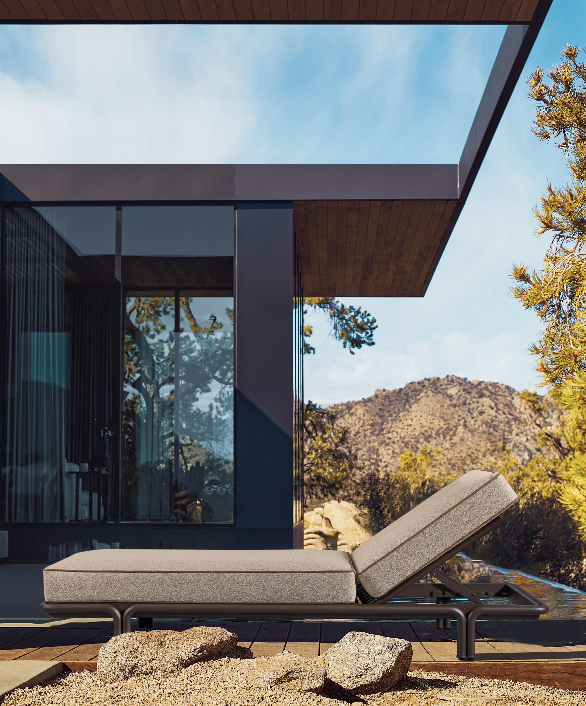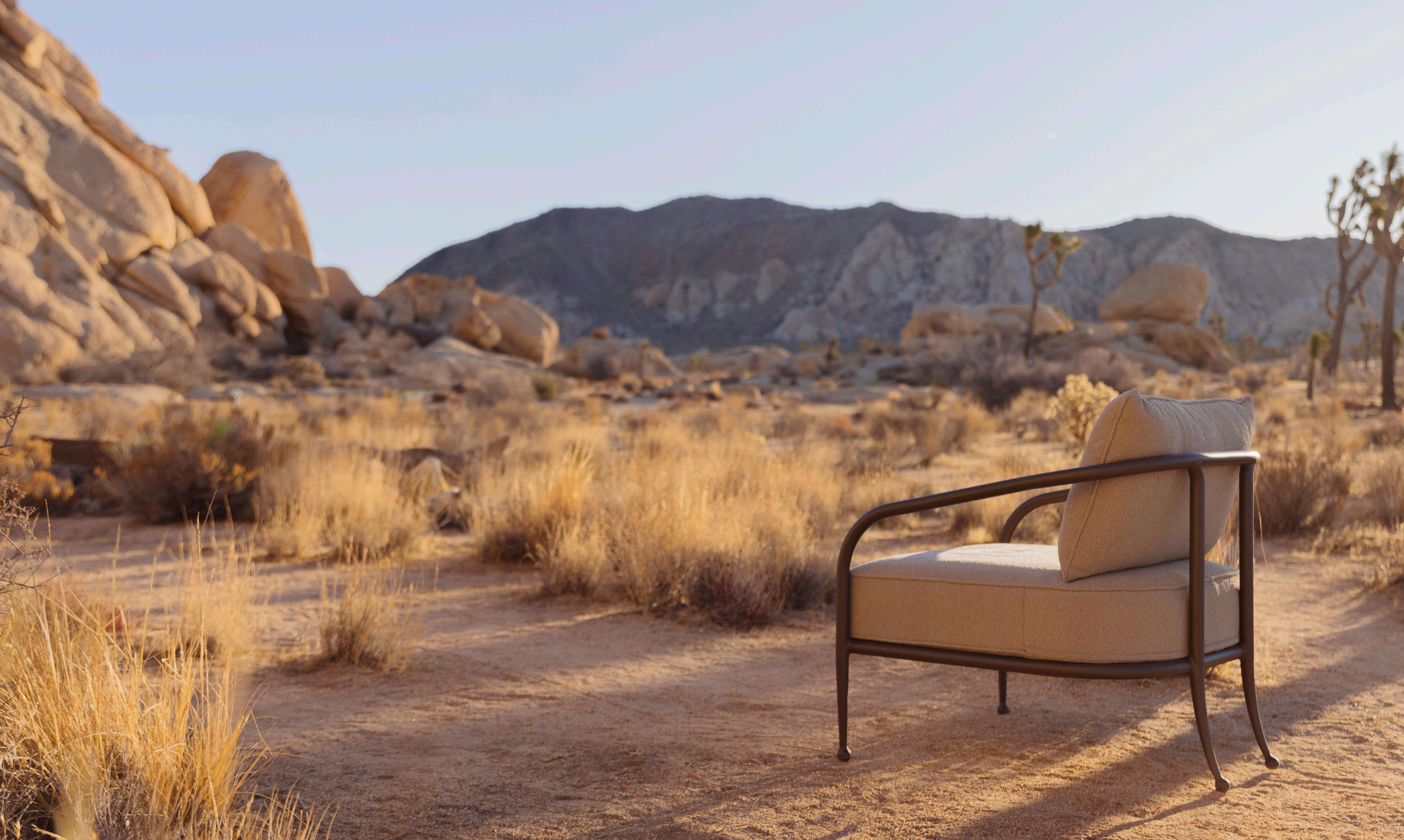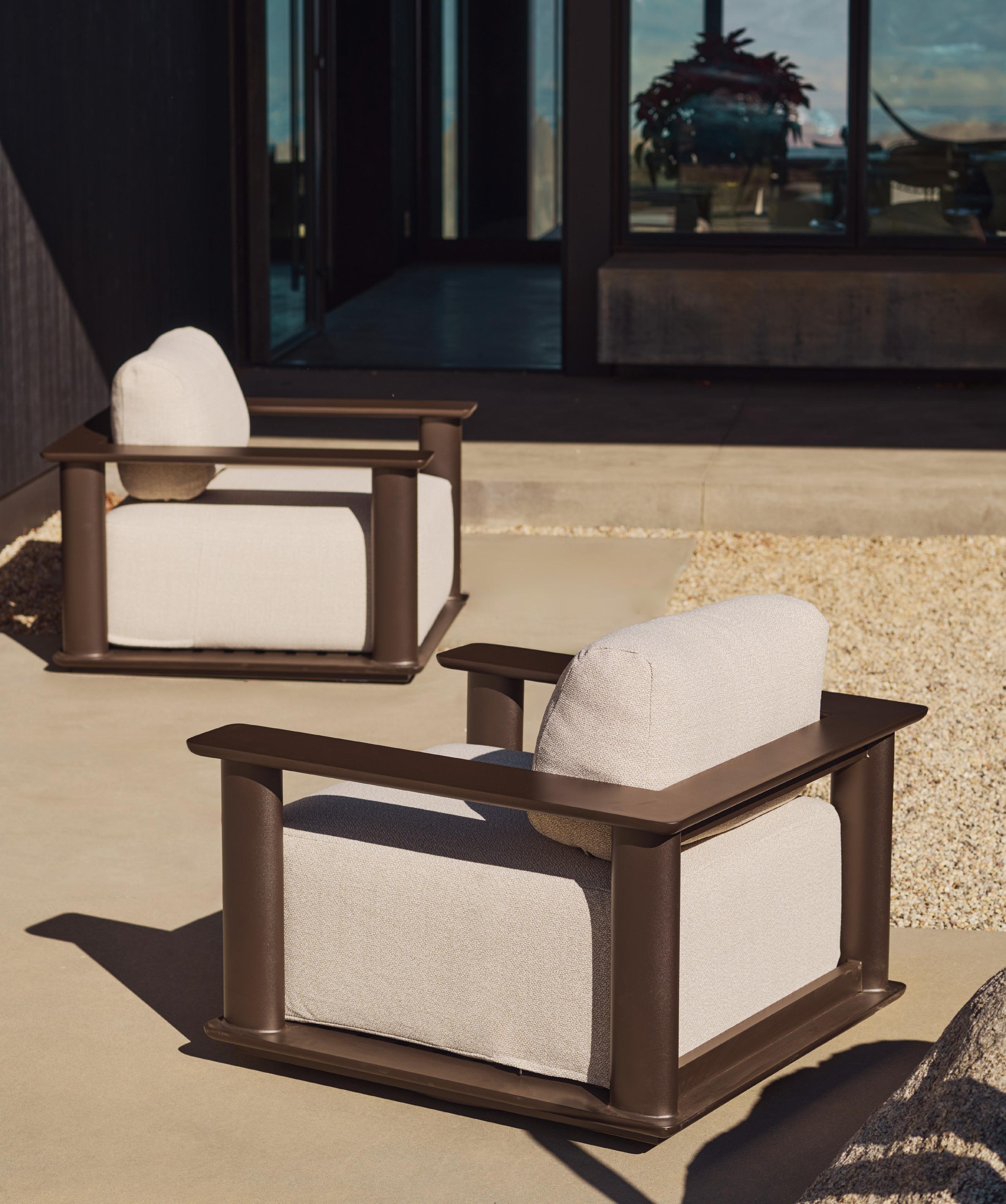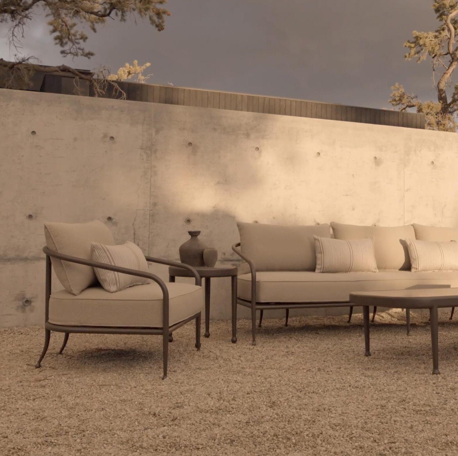 Retro-modern luxury inspired by the iconic style of 1950s Palm Springs. Tubular bronze aluminum, thick strapping and refined piping e ortlessly update mid-century charm with contemporary sophistication for any outdoor space.