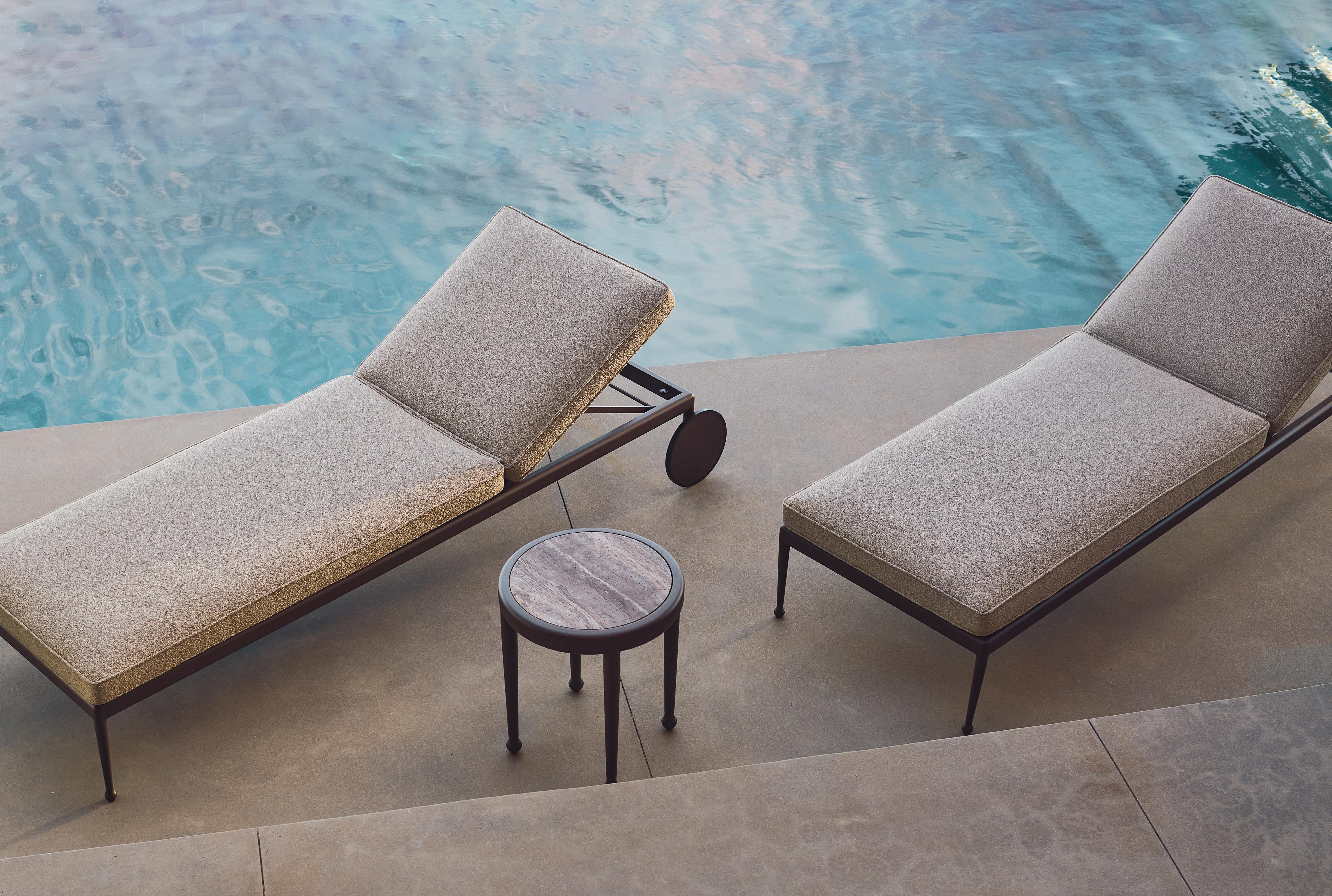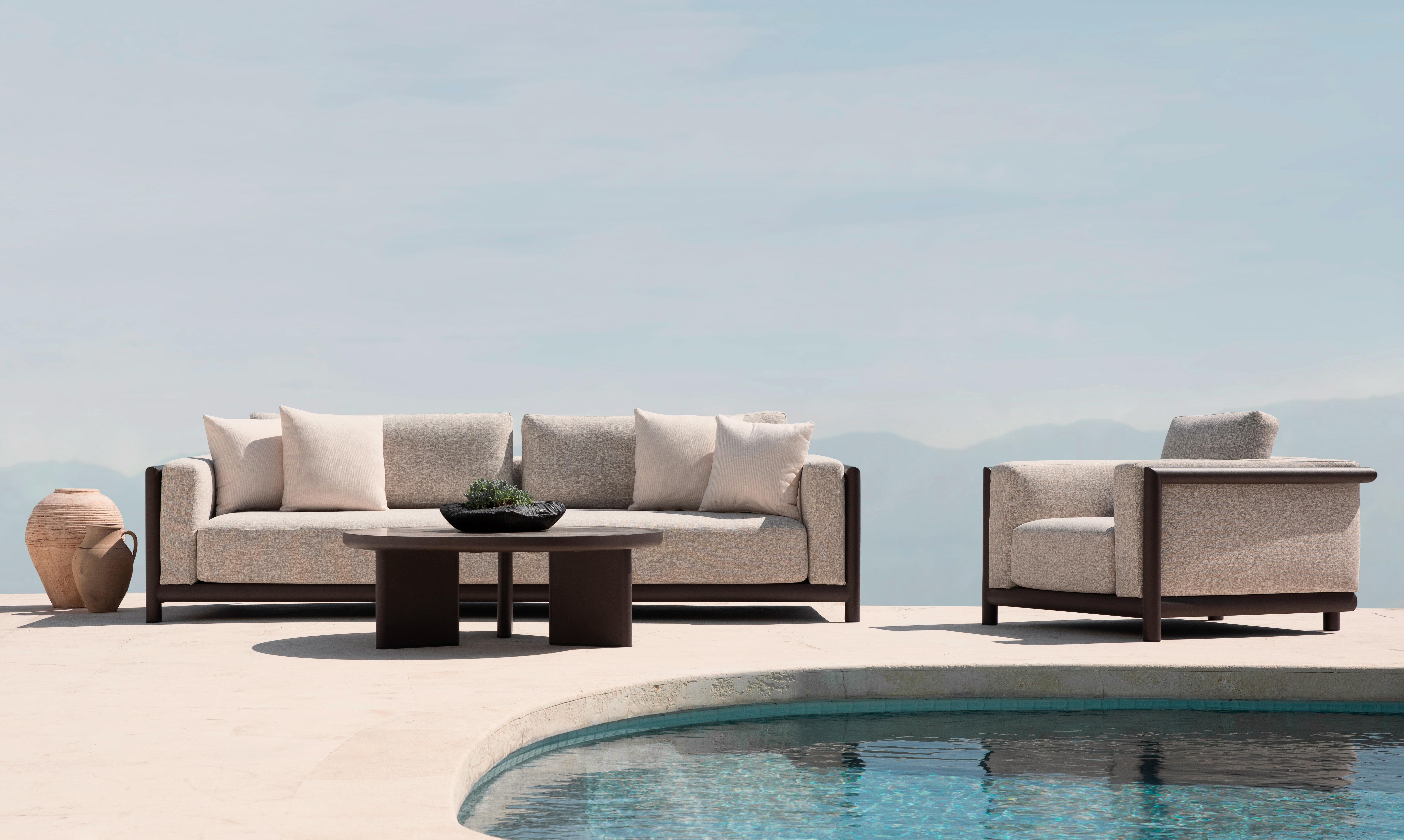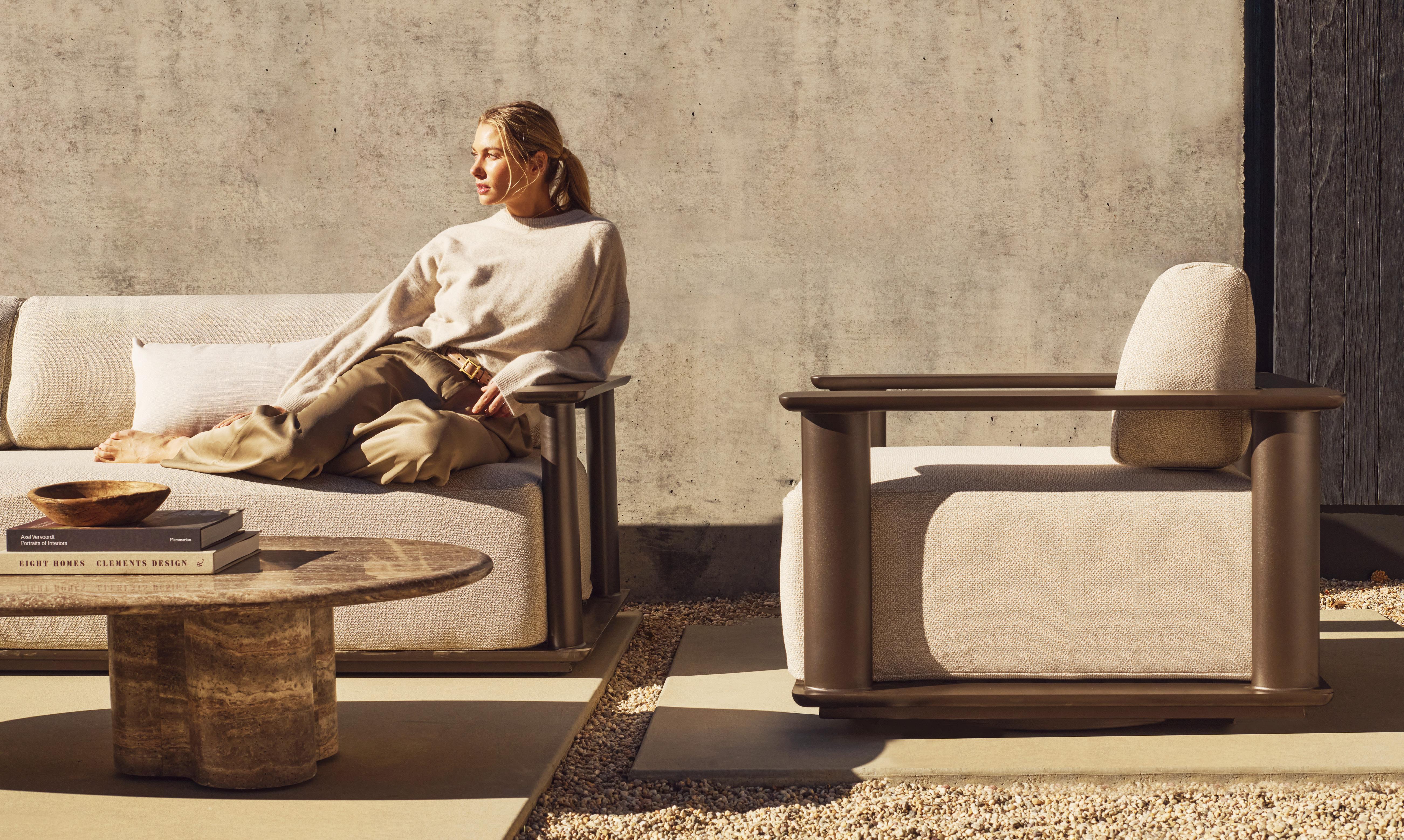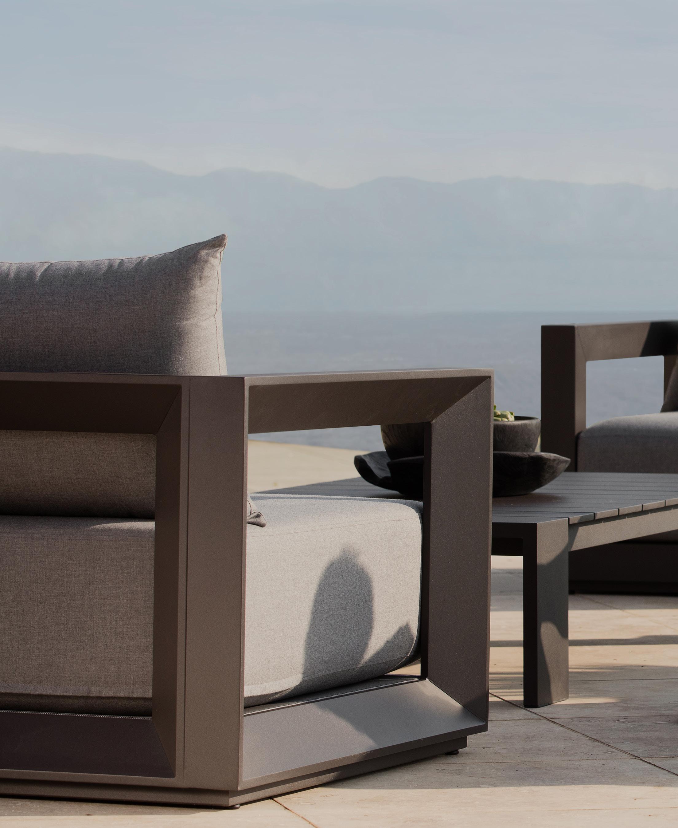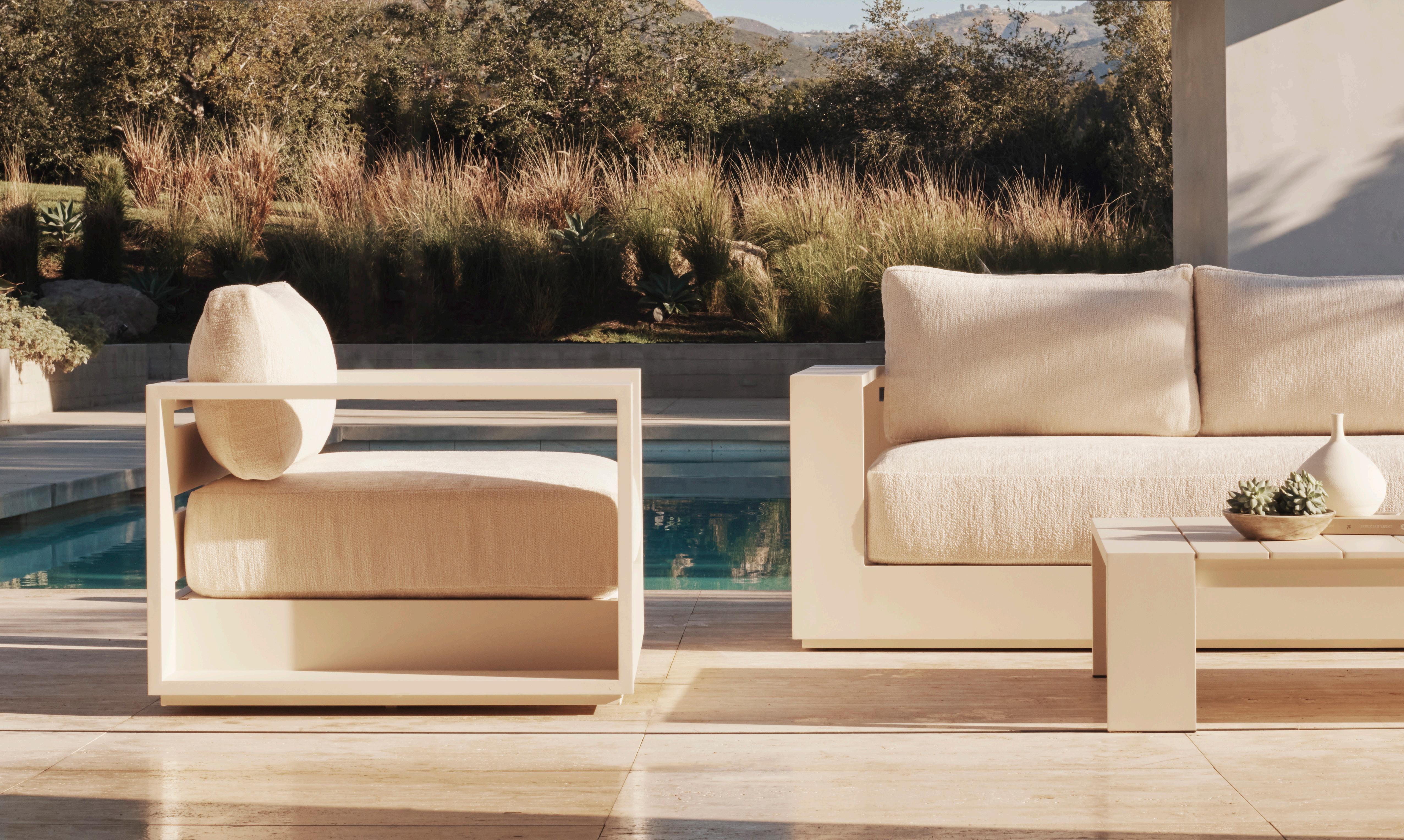 Retro-modern luxury inspired by the iconic style of 1950s Palm Springs. Tubular bronze aluminum, thick strapping and refined piping e ortlessly update mid-century charm with contemporary sophistication for any outdoor space.