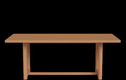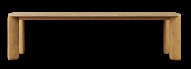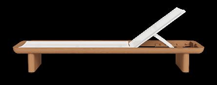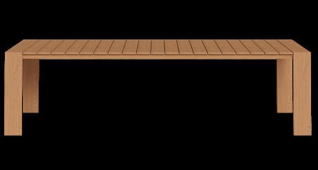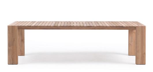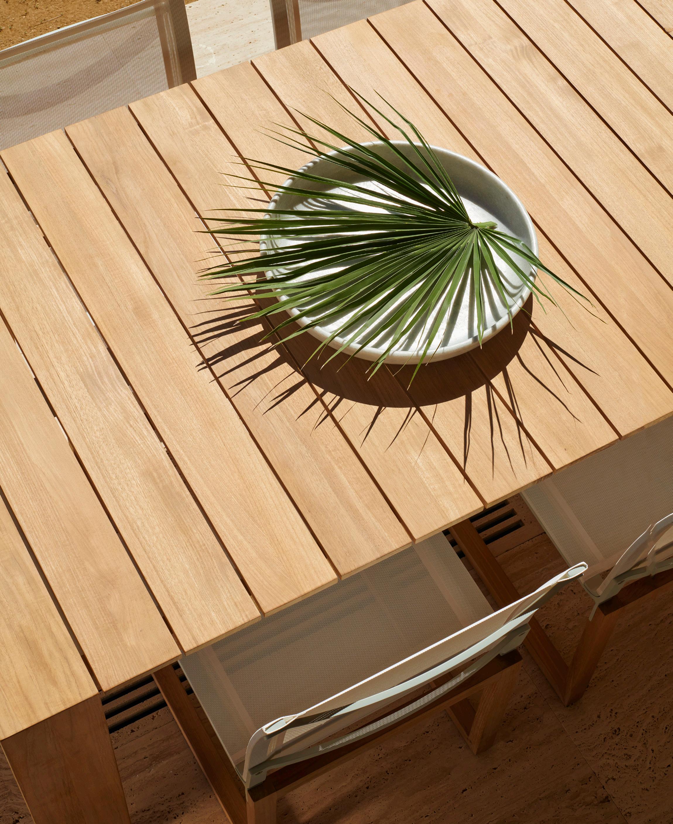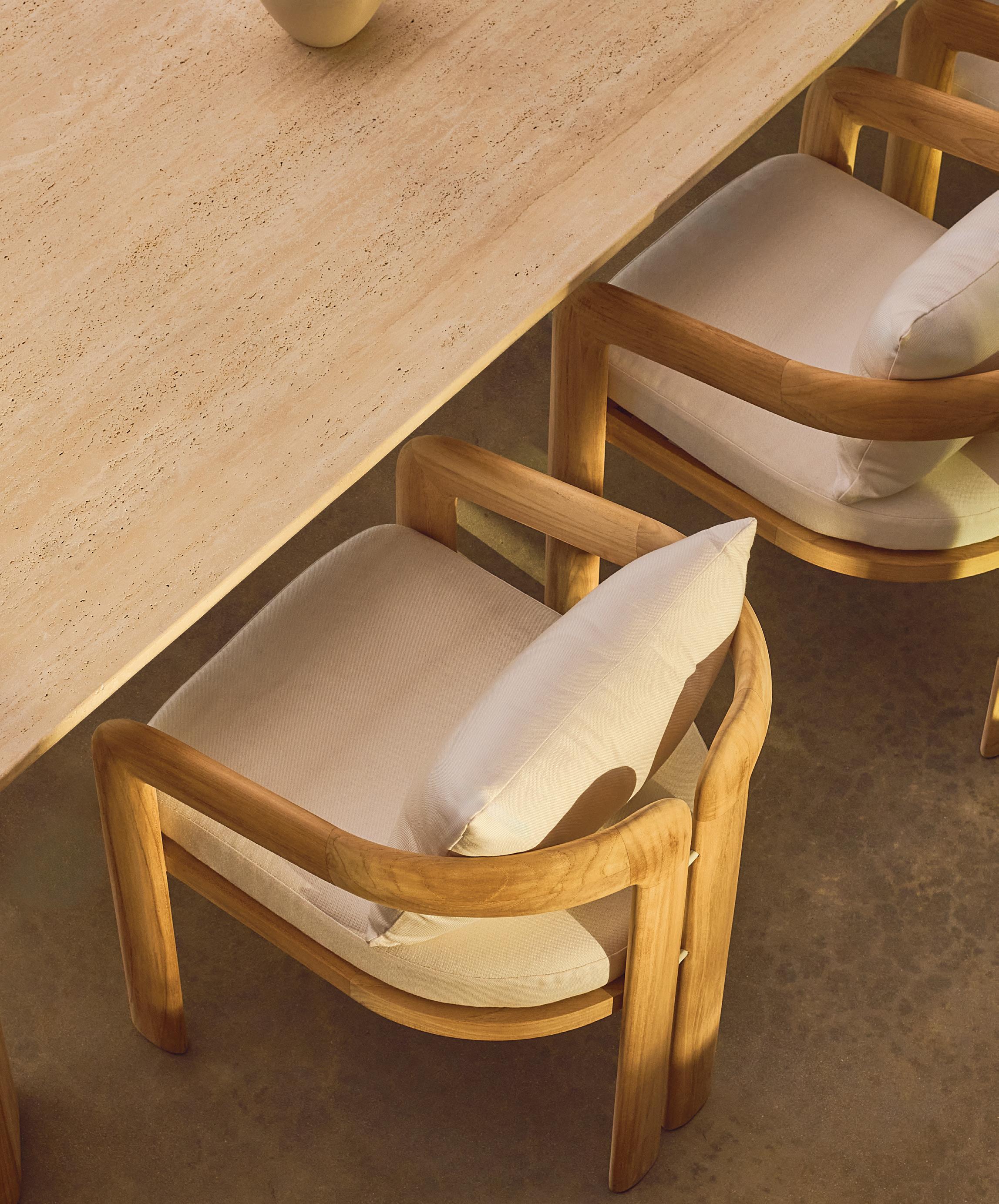 Organic materials blend seamlessly with refined construction. Crafted from solid Indonesian teak, this substantial collection plays with linear geometric and curved radiuses through a series of slats punctuated by slivers of negative space.