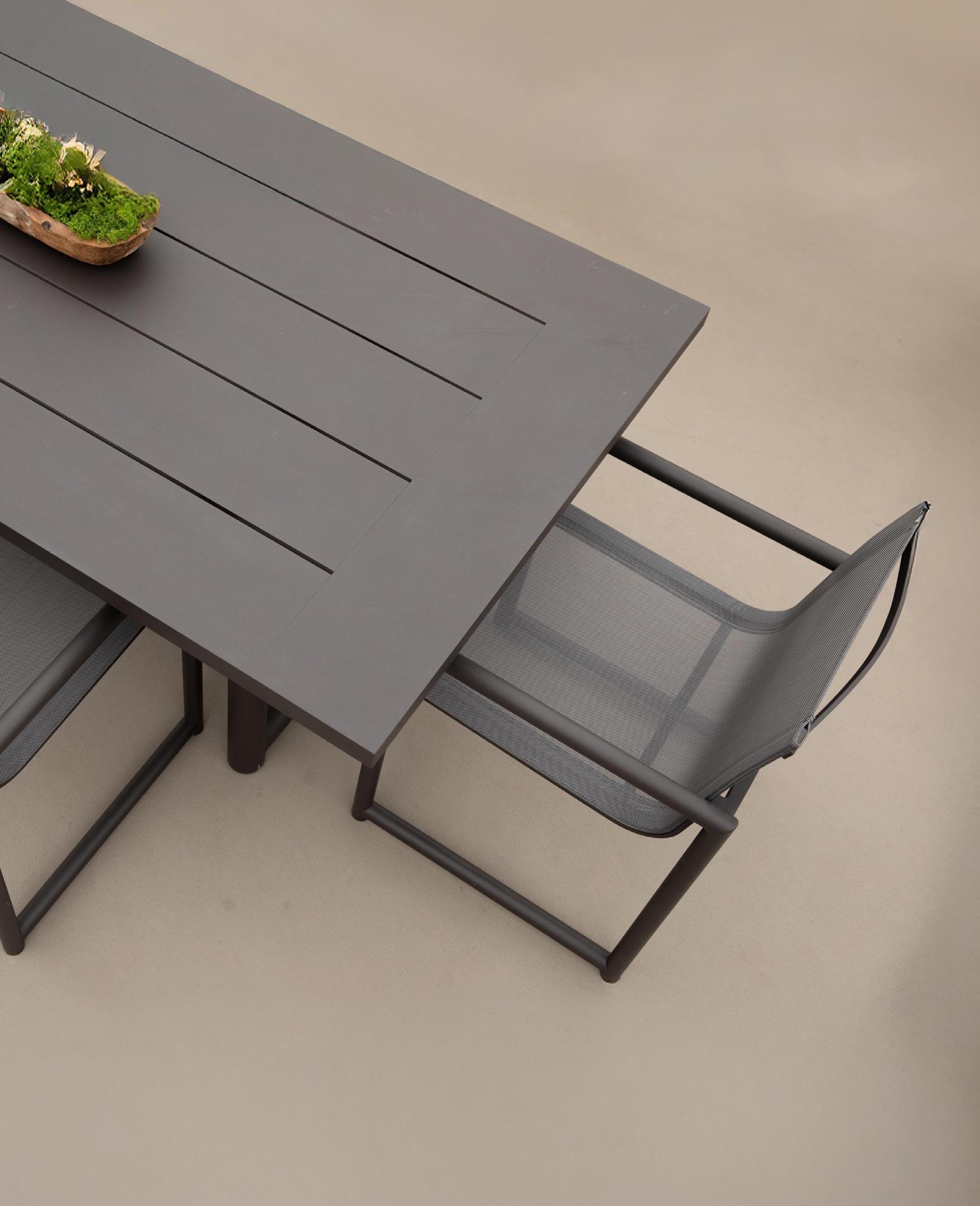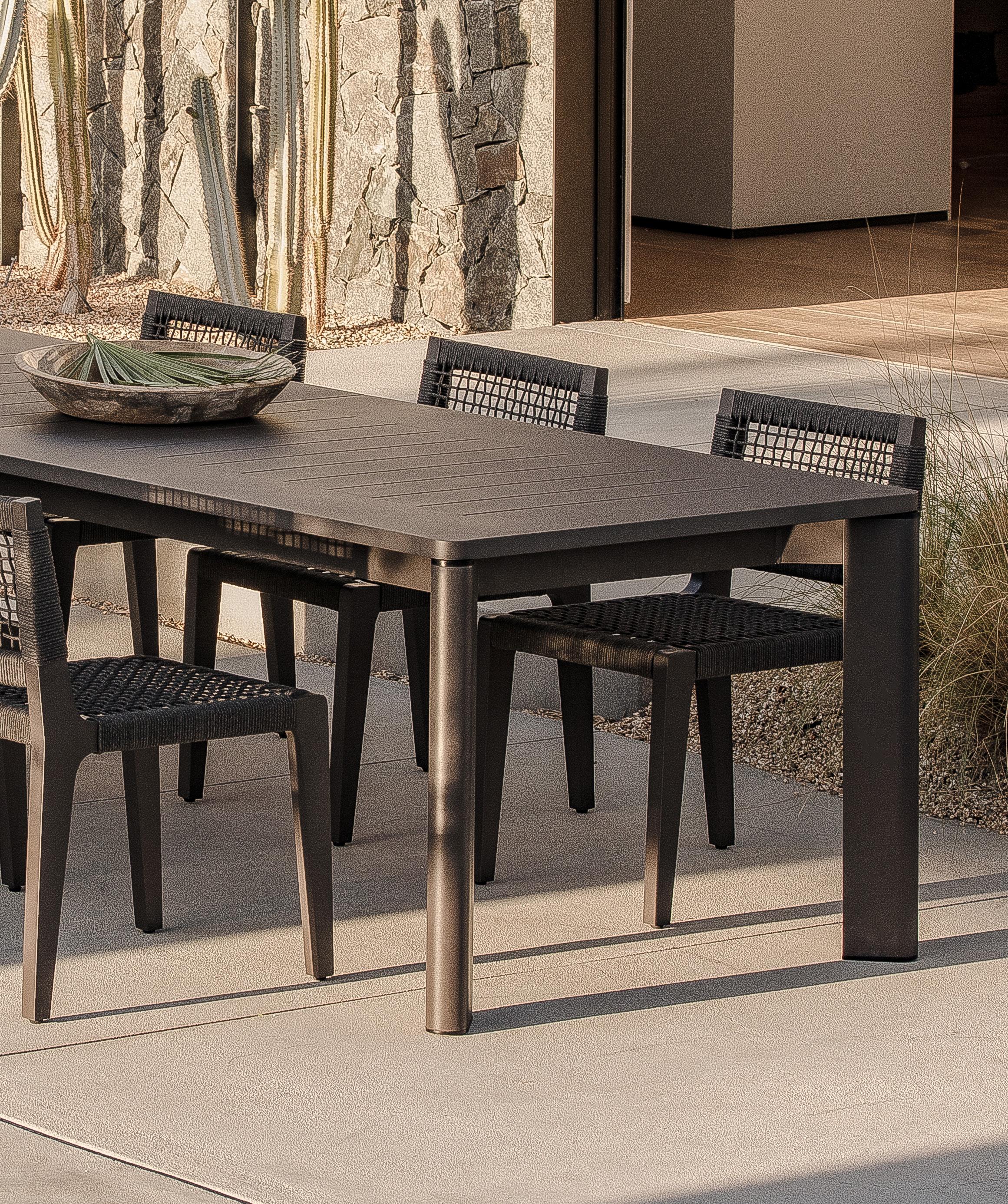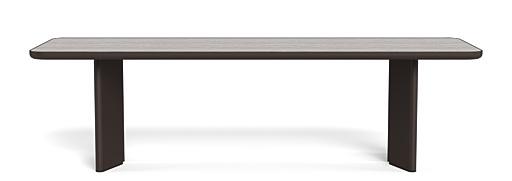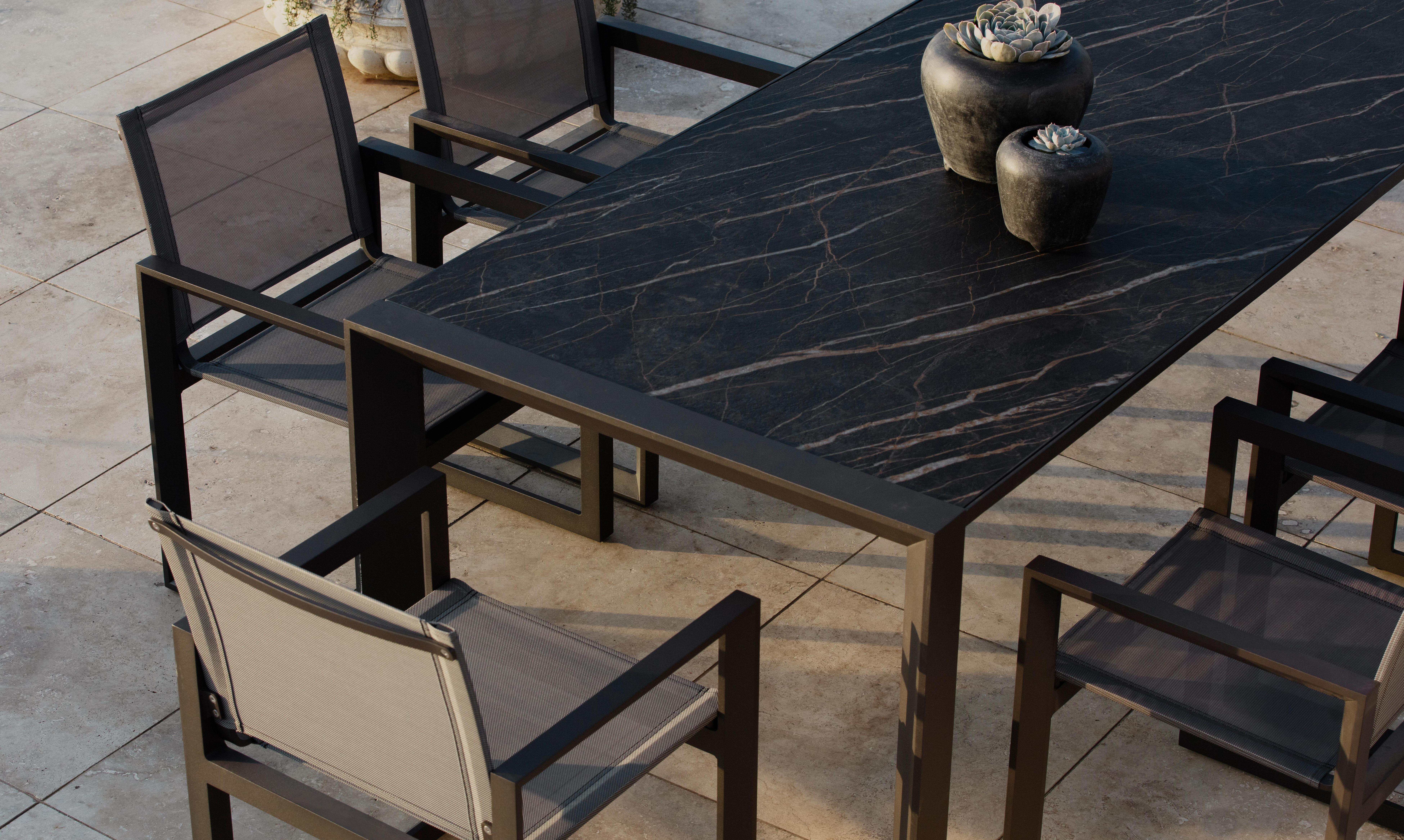 B. Palm Beach Aluminum Dining Table Shown in Aluminum Bronze Base with Travertine Grey Top.